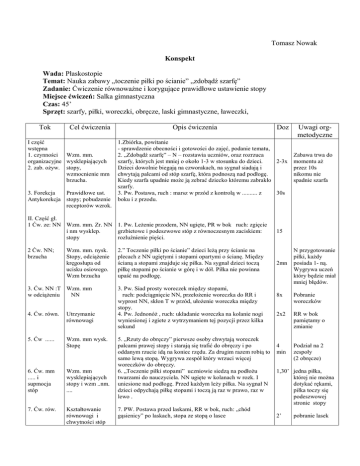 Tomasz Nowak Konspekt Wada: Płaskostopie Temat: Nauka zabawy „toczenie piłki po ścianie” „zdobądź szarfę” Zadanie: Ćwiczenie równoważne i korygujące prawidłowe ustawienie stopy Miejsce ćwiczeń: Salka gimnastyczna Czas: 45’ Sprzęt: szarfy, piłki, woreczki, obręcze, laski gimnastyczne, ławeczki, Tok Cel ćwiczenia I część wstępna 1. czynności Wzm. mm. organizacyjne wysklepiających 2. zab. ożyw. stopy, wzmocnienie mm brzucha. Prawidłowe ust. 3. Forekcja Antykorekcja stopy; pobudzenie receptorów wzrok. Opis ćwiczenia 1.Zbiórka, powitanie - sprawdzenie obecności i gotowości do zajęć, podanie tematu, 2. „Zdobądź szarfę” – N – rozstawia uczniów, oraz rozrzuca 2-3x szarfy, których jest mniej o około 1-3 w stosunku do dzieci. Dzieci dowolnie biegają na czworakach, na sygnał siadają i chwytają palcami od stóp szarfę, która podnoszą nad podłogę. Kiedy szarfa upadnie może ją zebrać dziecko któremu zabrakło szarfy. 30s 3. Pw. Postawa, ruch : marsz w przód z kontrolą w .......... z boku i z przodu. II. Część gł. 1 Ćw. ze: NN Wzm. mm. Zr. NN 1. Pw. Leżenie przodem, NN ugięte, PR w bok ruch: zgięcie grzbietowe i podeszwowe stóp z równoczesnym zaciskiem: i nm wysklep. rozluźnienie pięści. stopy 2 Ćw. NN; brzucha Wzm. mm. nysk. Stopy, odciążenie kręgosłupa od ucisku osiowego. Wzm brzucha 3. Ćw. NN :T Wzm. mm NN w odciążeniu 4. Ćw. równ. Utrzymanie równowagi 5. Ćw ...... Wzm. mm wysk. Stopę 6. Ćw. mm ..... i supmocja stóp Wzm. mm wysklepiających stopy i wzm ..nm. .... 7. Ćw. rów. Kształtowanie równowagi i chwytności stóp Doz 2.” Toczenie piłki po ścianie” dzieci leżą przy ścianie na plecach z NN ugiętymi i stopami opartymi o ścianę. Między ścianą a stopami znajduje się piłka. Na sygnał dzieci toczą piłkę stopami po ścianie w górę i w dół. Piłka nie powinna upaść na podłogę. 3. Pw. Siad prosty woreczek między stopami, ruch: podciągnięcie NN, przełożenie woreczka do RR i wyprost NN, skłon T w przód, ułożenie woreczka między stopy. 4. Pw. Jednonóż , ruch: układanie woreczka na kolanie nogi wyniesionej i zgiete z wytrzymaniem tej pozycji przez kilka sekund 5. „Rzuty do obręczy” pierwsze osoby chwytają woreczek palcami prawej stopy i starają się trafić do obręczy i po oddanym rzucie idą na koniec rzędu. Za drugim razem robią to samo lewą stopą. Wygrywa zespół który wrzuci więcej woreczków do obręczy. 6. „Toczenie piłki stopami” uczniowie siedzą na podłożu twarzami do nauczyciela. NN ugięte w kolanach w rozk. I uniesione nad podłogę. Przed każdym leży piłka. Na sygnał N dzieci odpychają piłkę stopami i toczą ją raz w prawo, raz w lewo . 7. PW. Postawa przed laskami, RR w bok, ruch: „chód gąsienicy” po laskach, stopa ze stopą o lasce Uwagi orgmetodyczne Zabawa trwa do momentu aż przez 10s nikomu nie spadnie szarfa 15 2mn N przygotowanie piłki, każdy posiada 1- ną. Wygrywa uczeń który będzie miał mniej błędów. 8x Pobranie woreczków 2x2 RR w bok pamiętamy o zmianie 4 min Podział na 2 zespoły (2 obręcze) 1,30’ jedna piłka, której nie można dotykać rękami, piłka toczy się podeszwowej stronie stopy 2’ pobranie lasek 8. Ćw. grzb. I wzm. mm grzb. I pośladków pośladków. 8. Pw leżenie przodem, RR ugięte w łokciach, NN złączone, ruch: lekki skłon T w tył, naśladowanie ruchów pływania „żabką” 10x 9Ćw. zw chwytne utrzymanie równowagi wyrobienie ......... praw postawy 9. PW. Stanie na ławeczce ruch: marsz dostawny bokiem po ławeczce z chwytem palcami stóp brzegu ławki. 4x 10. zwię wzm. mm ........ 10 PW. Zwis tyłem na drabinkach, w stopach woreczki, ruch: uniesienie NN w górę i wyrzucenie woreczka do kolegi. Zmiana ról po 1 rzucie 2-3x 11. Zabawa. Bieżnia z elem. Ćw chwytne wzmacniające stopy III Część końcowa 1. wyrobienie nawyku popraw. ustawienia stóp 2. Autokorekcja 3. Zakończenie zajęć 11. „Kto pierwszy na mecie” uczestnicy zabawy siadają w dwóch szeregach tyłem do siebie( twarzą w kierunku mety) trzymając palcami stóp woreczki(po jednym w każdej stopie). Na sygnał N dzieci wstają i biegną w kierunku swojej mety z woreczkami w stopach. Po osiągnięciu linii mety każdy wykonuje w tył wzrot i siada w ...... skrzyżowanych z woreczkami pod stopami. 2-3x 30s 1. krok odst – dostawny. 2. Marsz ze zwróceniem uwagi na prawidłowe ust. stóp. 3. Zbiórka, pochwała dzieci, pożegnanie grupy. 2’ 3’ RR w bok RR w bok pamiętamy o zmianie nogi prowadzącej. Woreczki wyjmujemy za drabinek