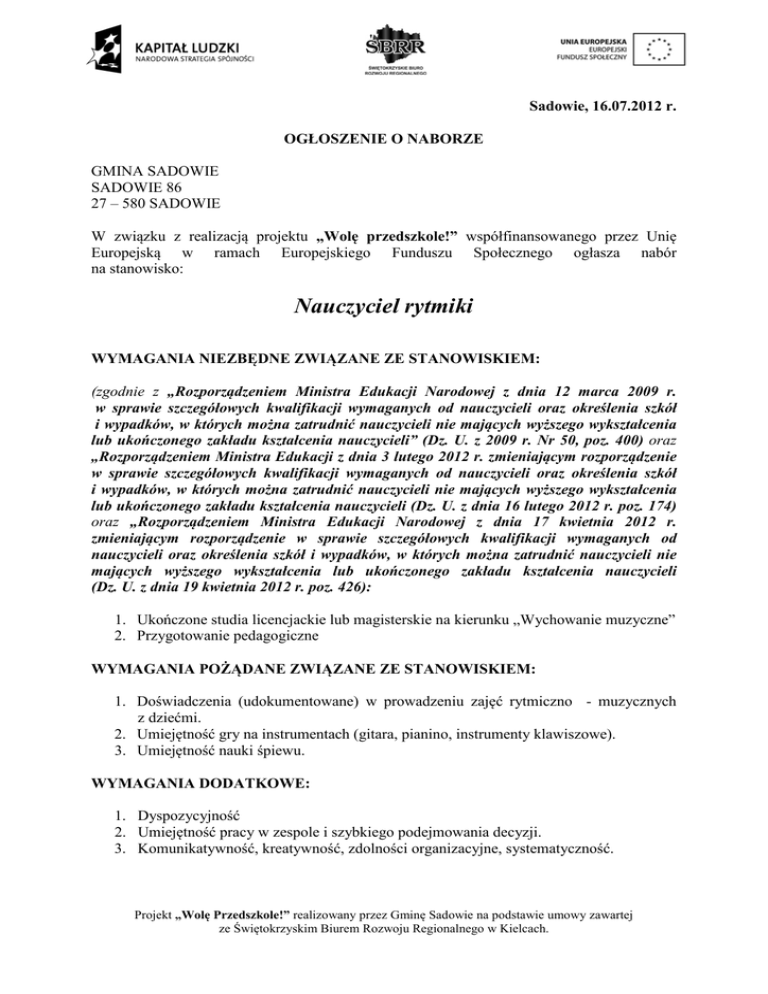 Sadowie, 16.07.2012 r. OGŁOSZENIE O NABORZE GMINA SADOWIE SADOWIE 86 27 – 580 SADOWIE W związku z realizacją projektu „Wolę przedszkole!” współfinansowanego przez Unię Europejską w ramach Europejskiego Funduszu Społecznego ogłasza nabór na stanowisko: Nauczyciel rytmiki WYMAGANIA NIEZBĘDNE ZWIĄZANE ZE STANOWISKIEM: (zgodnie z „Rozporządzeniem Ministra Edukacji Narodowej z dnia 12 marca 2009 r. w sprawie szczegółowych kwalifikacji wymaganych od nauczycieli oraz określenia szkół i wypadków, w których można zatrudnić nauczycieli nie mających wyższego wykształcenia lub ukończonego zakładu kształcenia nauczycieli” (Dz. U. z 2009 r. Nr 50, poz. 400) oraz „Rozporządzeniem Ministra Edukacji z dnia 3 lutego 2012 r. zmieniającym rozporządzenie w sprawie szczegółowych kwalifikacji wymaganych od nauczycieli oraz określenia szkół i wypadków, w których można zatrudnić nauczycieli nie mających wyższego wykształcenia lub ukończonego zakładu kształcenia nauczycieli (Dz. U. z dnia 16 lutego 2012 r. poz. 174) oraz „Rozporządzeniem Ministra Edukacji Narodowej z dnia 17 kwietnia 2012 r. zmieniającym rozporządzenie w sprawie szczegółowych kwalifikacji wymaganych od nauczycieli oraz określenia szkół i wypadków, w których można zatrudnić nauczycieli nie mających wyższego wykształcenia lub ukończonego zakładu kształcenia nauczycieli (Dz. U. z dnia 19 kwietnia 2012 r. poz. 426): 1. Ukończone studia licencjackie lub magisterskie na kierunku „Wychowanie muzyczne” 2. Przygotowanie pedagogiczne WYMAGANIA POŻĄDANE ZWIĄZANE ZE STANOWISKIEM: 1. Doświadczenia (udokumentowane) w prowadzeniu zajęć rytmiczno - muzycznych z dziećmi. 2. Umiejętność gry na instrumentach (gitara, pianino, instrumenty klawiszowe). 3. Umiejętność nauki śpiewu. WYMAGANIA DODATKOWE: 1. Dyspozycyjność 2. Umiejętność pracy w zespole i szybkiego podejmowania decyzji. 3. Komunikatywność, kreatywność, zdolności organizacyjne, systematyczność. Projekt „Wolę Przedszkole!” realizowany przez Gminę Sadowie na podstawie umowy zawartej ze Świętokrzyskim Biurem Rozwoju Regionalnego w Kielcach. ZAKRES GŁÓWNCH ZADAŃ WYKONYWANYCH NA STANOWISKU: 1. Prowadzenie zajęć rytmicznych z dziećmi w wieku przedszkolnym. 2. Opieka nad dziećmi w wieku przedszkolnym. 3. Współpraca przy prawidłowej realizacji projektu „Wolę przedszkole!” współfinansowanego przez Unię Europejską w ramach Europejskiego Funduszu Społecznego (w tym monitoring i ewaluacja). 4. Bieżące zadania zlecane przez Wójta Gminy Sadowie i Kierownika Projektu. WYMAGANE DOKUMENTY APLIKACYJNE: 1. Kwestionariusz osobowy dla osób ubiegających się o zatrudnienie - według wzoru stanowiącego załącznik nr 1 do ogłoszenia 2. Kserokopie dokumentów potwierdzających wykształcenie, staż pracy i dodatkowe kwalifikacje (kursy, szkolenia) 3. Życiorys – curriculum vitae – własnoręcznie podpisany UWAGA – WSZYSTKIE KSEROKOPIE POWINNY BYĆ POTWIERDZONE „ZA ZGODNOŚĆ Z ORYGINAŁEM” ORAZ OPATRZONE DATĄ I PODPISEM OSOBY WNIOSKUJĄCEJ O ZATRUDNIENIE WYMOGI FORMALNE: 1. Złożenie wymaganych dokumentów w terminie określonym w ogłoszeniu. 2. Spełnienie niezbędnych wymagań związanych ze stanowiskiem. Oferty aplikacyjne należy składać: • w zaklejonej kopercie oznaczonej w następujący sposób: Dotyczy naboru na stanowisko „Nauczyciel - rytmik” w ramach realizacji projektu „Wolę przedszkole!” współfinansowanego przez Unię Europejską w ramach Europejskiego Funduszu Społecznego • OSOBIŚCIE, DROGĄ POCZTOWĄ • w Urzędzie Gminy, Sadowie 86, 27 – 580 Sadowie Wymagane dokumenty należy składać do dnia 23.07.2012 r. do godziny 15.00 (decyduje data wpływu do Urzędu Gminy) Dokumenty, które wpłyną do Urzędu Gminy po wyżej wymienionym terminie nie będą rozpatrywane. Projekt „Wolę Przedszkole!” realizowany przez Gminę Sadowie na podstawie umowy zawartej ze Świętokrzyskim Biurem Rozwoju Regionalnego w Kielcach. INNE INFORMACJE Warunki zatrudnienia: zatrudnienie na podstawie umowy – zlecenia w okresie 01.09.2012 r. – 31.12.2013 r. (12 godzin w miesiącu) Osoby, które spełnią wymagania formalne określone w ogłoszeniu oraz zakwalifikują się do dalszego etapu rekrutacji zostaną telefonicznie poinformowane i zaproszone na rozmowę kwalifikacyjną. Osoby, którym zostaną przedstawione propozycje zatrudnienia będą zobligowane do dostarczenia w ciągu 7 dni programu nauczania zgodnego z „Rozporządzeniem Ministra Edukacji Narodowej z dnia 23 grudnia 2008 r. w sprawie podstawy programowej wychowania przedszkolnego oraz kształcenia ogólnego w poszczególnych typach szkół” Informacja o wynikach naboru zostanie upowszechniona na stronie internetowej Gminy Sadowie – www.sadowie.com.pl oraz na tablicach ogłoszeń w Urzędzie Gminy i siedzibie realizacji projektu. Projekt „Wolę Przedszkole!” realizowany przez Gminę Sadowie na podstawie umowy zawartej ze Świętokrzyskim Biurem Rozwoju Regionalnego w Kielcach.