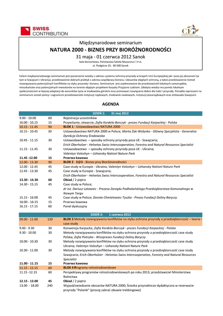 Międzynarodowe seminarium NATURA 2000 - BIZNES PRZY BIORÓŻNORODNOŚCI 31 maja - 01 czerwca 2012 Sanok Sala Koncertowa, Państwowa Szkoła Muzyczna I i II st. ul. Podgórze 25; 38-500 Sanok Celem międzynarodowego seminarium jest poszerzenie wiedzy z zakresu systemu ochrony przyrody w krajach Unii Europejskiej jak i poza jej obszarami (w tym w Szwajcarii i Ukrainy), przedstawienie dobrych praktyk z zakresu współpracy biznesu i obszarów objętych ochroną, a także przedstawienie metod rozwiązywania potencjalnych konfliktów na styku przyrody i biznesu. Seminarium jest zaadresowane do przedstawicieli lokalnych samorządów, mieszkańców oraz potencjalnych inwestorów na terenie objętym projektem Karpaty Przyjazne Ludziom. Zdobyta wiedza ma pomóc lokalnym społecznościom w lepszej adaptacji do warunków życia w środowisku górskim oraz promować rozwiązania dobre dla ludzi i przyrody. Ponadto zaproszeni na seminarium zostali polscy i zagraniczni przedstawiciele instytucji rządowych, środowisk naukowych, instytucji pozarządowych oraz ambasada Szwajcarii. AGENDA 9.00 - 10.00 10.00 - 10.15 10.15 - 11.45 10.15 - 10.45 60 15 90 30 10.45 - 11.15 30 11.15 - 11.45 30 11.45 -12.00 12.00 - 13.30 12.00 - 12.45 12.45 - 13.30 15 90 45 45 13.30 - 14.30 14.30 - 15.15 60 45 15.15 - 16:00 16:00 - 16:15 16.15 - 17.15 45 15 60 09.00 - 11.00 120 9.00 - 9.30 9.30 - 10.00 30 30 10.00 - 10.30 30 10.30 - 11.00 30 11.00 - 11.15 11.15 - 12.15 11.15 -12.15 15 60 60 12.15 - 13.00 13.00 - 18.00 45 240 DZIEŃ 1: 31 maj 2012 Rejestracja uczestników Przywitanie, otwarcie; Zofia Kordela-Borczyk - prezes Fundacji Karpackiej - Polska BLOK 1 - Ustawodawstwo NATURA 2000 Ustawodawstwo NATURA 2000 w Polsce; Marta Żak-Wołynko - Główny Specjalista - Generalna Dyrekcja Ochrony Środowiska Ustawodawstwo – sposoby ochrony przyrody poza UE - Szwajcaria; Erich Oberholzer - Helvetas Swiss Intercooperation, Forestry and Natural Resources Specialist Ustawodawstwo – sposoby ochrony przyrody poza UE - Ukraina; Valentyn Voloshyn – Uzhansky Nationl Nature Park Przerwa kawowa BLOK 2 B@B - Biznes przy Bioróżnorodności Case study w Europie - Ukraina; Valentyn Voloshyn – Uzhansky Nationl Nature Park Case study w Europie - Szwajcaria; Erich Oberholzer - Helvetas Swiss Intercooperation, Forestry and Natural Resources Specialist Obiad / 2 piętro Case study w Polsce; dr inż. Dariusz Latawiec - Prezesa Zarządu Podhalańskiego Przedsiębiorstwa Komunalnego w Nowym Targu Case study w Polsce; Dorota Chmielowiec-Tyszko - Prezes Fundacji Doliny Baryczy Przerwa kawowa Panel dyskusyjny DZIEŃ 2: 1 czerwca 2012 BLOK 3 Metody rozwiązywania konfliktów na styku ochrona przyrody a przedsiębiorczość – teoria i case study Konwencja Karpacka; Zofia Kordela-Borczyk - prezes Fundacji Karpackiej - Polska Metody rozwiązywania konfliktów na styku ochrona przyrody a przedsiębiorczość case study Polska; Zofia Pietryka - Wiceprezes Fundacji Doliny Baryczy Metody rozwiązywania konfliktów na styku ochrona przyrody a przedsiębiorczość case study Ukraina; Valentyn Voloshyn – Uzhansky Nationl Nature Park Metody rozwiązywania konfliktów na styku ochrona przyrody a przedsiębiorczość case study Szwajcaria; Erich Oberholzer - Helvetas Swiss Intercooperation, Forestry and Natural Resources Specialist Przerwa kawowa BLOK 4 Programy rolnośrodowiskowe Perspektywy programów rolnośrodowiskowych po roku 2013; przedstawiciel Ministerstwa Rolnictwa Obiad / 2 piętro Wyjazd/zwiedzanie obszarów NATURA 2000; Ścieżka przyrodniczo-dydaktyczna w rezerwacie przyrody "Polanki" (proszę zabrać obuwie trekkingowe)
