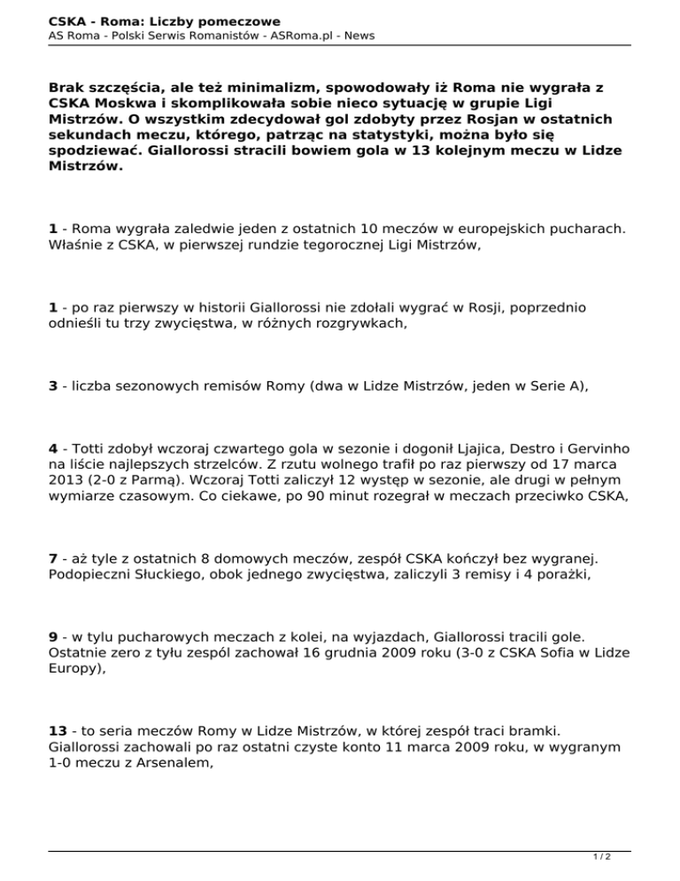 CSKA - Roma: Liczby pomeczowe AS Roma - Polski Serwis Romanistów - ASRoma.pl - News Brak szczęścia, ale też minimalizm, spowodowały iż Roma nie wygrała z CSKA Moskwa i skomplikowała sobie nieco sytuację w grupie Ligi Mistrzów. O wszystkim zdecydował gol zdobyty przez Rosjan w ostatnich sekundach meczu, którego, patrząc na statystyki, można było się spodziewać. Giallorossi stracili bowiem gola w 13 kolejnym meczu w Lidze Mistrzów. 1 - Roma wygrała zaledwie jeden z ostatnich 10 meczów w europejskich pucharach. Właśnie z CSKA, w pierwszej rundzie tegorocznej Ligi Mistrzów, 1 - po raz pierwszy w historii Giallorossi nie zdołali wygrać w Rosji, poprzednio odnieśli tu trzy zwycięstwa, w różnych rozgrywkach, 3 - liczba sezonowych remisów Romy (dwa w Lidze Mistrzów, jeden w Serie A), 4 - Totti zdobył wczoraj czwartego gola w sezonie i dogonił Ljajica, Destro i Gervinho na liście najlepszych strzelców. Z rzutu wolnego trafił po raz pierwszy od 17 marca 2013 (2-0 z Parmą). Wczoraj Totti zaliczył 12 występ w sezonie, ale drugi w pełnym wymiarze czasowym. Co ciekawe, po 90 minut rozegrał w meczach przeciwko CSKA, 7 - aż tyle z ostatnich 8 domowych meczów, zespół CSKA kończył bez wygranej. Podopieczni Słuckiego, obok jednego zwycięstwa, zaliczyli 3 remisy i 4 porażki, 9 - w tylu pucharowych meczach z kolei, na wyjazdach, Giallorossi tracili gole. Ostatnie zero z tyłu zespól zachował 16 grudnia 2009 roku (3-0 z CSKA Sofia w Lidze Europy), 13 - to seria meczów Romy w Lidze Mistrzów, w której zespół traci bramki. Giallorossi zachowali po raz ostatni czyste konto 11 marca 2009 roku, w wygranym 1-0 meczu z Arsenalem, 1/2 CSKA - Roma: Liczby pomeczowe AS Roma - Polski Serwis Romanistów - ASRoma.pl - News 15 - to seria meczów w Lidze Mistrzów, w których bramki traci CSKA Moskwa 17 - to z kolei seria wyjazdowych meczów Romy w Lidze Mistrzów, w których zespół tracił gole. Ostatnie czyste konto w Champions League, na terenie rywali, udało się zachować w Lyonie, 6 marca 2007 (wygrana 2-0) 18 - Francesco Totti zdobył wczoraj swojego 18 gola w Lidze Mistrzów. Jest najlepszym strzelcem Romy w historii w tych rozgrywkach i aż o 10 trafień wyprzedza drugiego w klasyfikacji, Vucinica. Jest jedynym graczem Romy w tym sezonie, który trafiał na wyjeździe w Lidze Mistrzów, 21 - zespół wzmocnił wczoraj statystykę goli zdobywanych na wyjazdach. Teraz to już 72% wszystkich bramek z tego sezonu. Autor: abruzzi 2/2 Powered by TCPDF (www.tcpdf.org)