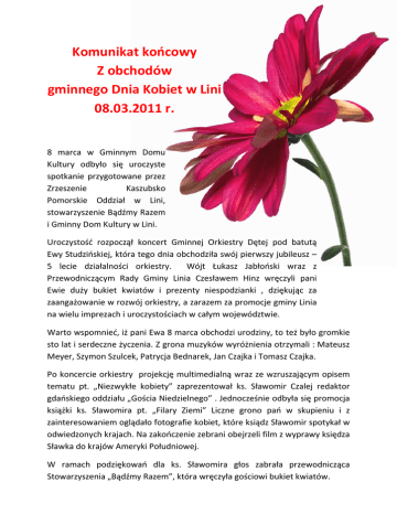 Komunikat końcowy Z obchodów gminnego Dnia Kobiet w Lini 08.03.2011 r. 8 marca w Gminnym Domu Kultury odbyło się uroczyste spotkanie przygotowane przez Zrzeszenie Kaszubsko Pomorskie Oddział w Lini, stowarzyszenie Bądźmy Razem i Gminny Dom Kultury w Lini. Uroczystość rozpoczął koncert Gminnej Orkiestry Dętej pod batutą Ewy Studzińskiej, która tego dnia obchodziła swój pierwszy jubileusz – 5 lecie działalności orkiestry. Wójt Łukasz Jabłoński wraz z Przewodniczącym Rady Gminy Linia Czesławem Hinz wręczyli pani Ewie duży bukiet kwiatów i prezenty niespodzianki , dziękując za zaangażowanie w rozwój orkiestry, a zarazem za promocje gminy Linia na wielu imprezach i uroczystościach w całym województwie. Warto wspomnieć, iż pani Ewa 8 marca obchodzi urodziny, to też było gromkie sto lat i serdeczne życzenia. Z grona muzyków wyróżnienia otrzymali : Mateusz Meyer, Szymon Szulcek, Patrycja Bednarek, Jan Czajka i Tomasz Czajka. Po koncercie orkiestry projekcję multimedialną wraz ze wzruszającym opisem tematu pt. „Niezwykłe kobiety” zaprezentował ks. Sławomir Czalej redaktor gdańskiego oddziału „Gościa Niedzielnego” . Jednocześnie odbyła się promocja książki ks. Sławomira pt. „Filary Ziemi” Liczne grono pań w skupieniu i z zainteresowaniem oglądało fotografie kobiet, które ksiądz Sławomir spotykał w odwiedzonych krajach. Na zakończenie zebrani obejrzeli film z wyprawy księdza Sławka do krajów Ameryki Południowej. W ramach podziękowań dla ks. Sławomira głos zabrała przewodnicząca Stowarzyszenia „Bądźmy Razem”, która wręczyła gościowi bukiet kwiatów.