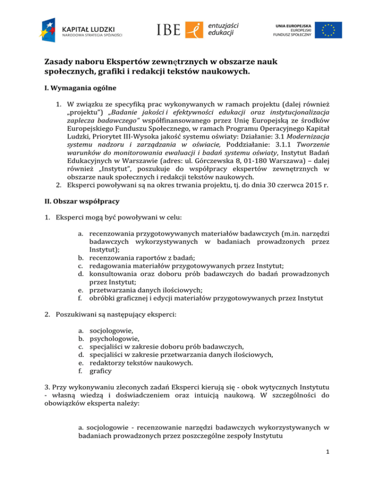 Zasady naboru Ekspertów zewnętrznych w obszarze nauk społecznych, grafiki i redakcji tekstów naukowych. I. Wymagania ogólne 1. W związku ze specyfiką prac wykonywanych w ramach projektu (dalej również „projektu”) „Badanie jakości i efektywności edukacji oraz instytucjonalizacja zaplecza badawczego” współfinansowanego przez Unię Europejską ze środków Europejskiego Funduszu Społecznego, w ramach Programu Operacyjnego Kapitał Ludzki, Priorytet III-Wysoka jakość systemu oświaty: Działanie: 3.1 Modernizacja systemu nadzoru i zarządzania w oświacie, Poddziałanie: 3.1.1 Tworzenie warunków do monitorowania ewaluacji i badań systemu oświaty, Instytut Badań Edukacyjnych w Warszawie (adres: ul. Górczewska 8, 01-180 Warszawa) – dalej również „Instytut”, poszukuje do współpracy ekspertów zewnętrznych w obszarze nauk społecznych i redakcji tekstów naukowych. 2. Eksperci powoływani są na okres trwania projektu, tj. do dnia 30 czerwca 2015 r. II. Obszar współpracy 1. Eksperci mogą być powoływani w celu: a. recenzowania przygotowywanych materiałów badawczych (m.in. narzędzi badawczych wykorzystywanych w badaniach prowadzonych przez Instytut); b. recenzowania raportów z badań; c. redagowania materiałów przygotowywanych przez Instytut; d. konsultowania oraz doboru prób badawczych do badań prowadzonych przez Instytut; e. przetwarzania danych ilościowych; f. obróbki graficznej i edycji materiałów przygotowywanych przez Instytut 2. Poszukiwani są następujący eksperci: a. b. c. d. e. f. socjologowie, psychologowie, specjaliści w zakresie doboru prób badawczych, specjaliści w zakresie przetwarzania danych ilościowych, redaktorzy tekstów naukowych. graficy 3. Przy wykonywaniu zleconych zadań Eksperci kierują się - obok wytycznych Instytutu - własną wiedzą i doświadczeniem oraz intuicją naukową. W szczególności do obowiązków eksperta należy: a. socjologowie - recenzowanie narzędzi badawczych wykorzystywanych w badaniach prowadzonych przez poszczególne zespoły Instytutu 1 b. psychologowie - uzupełnianie narzędzi badawczych przygotowywanych przez poszczególne zespoły Instytutu o komponenty: kognitywistyczny, psycholingwistyczny oraz psychoedukacyjny; recenzowanie narzędzi badawczych wykorzystywanych w badaniach prowadzonych przez poszczególne zespoły Instytutu c. specjaliści w zakresie doboru prób badawczych – dobór prób do badań prowadzonych przez Instytut według wskazówek poszczególnych zespołów Instytutu; konsultacje w zakresie odpowiedniego doboru próby d. specjaliści w zakresie przetwarzania danych ilościowych – analizowanie wyników badań prowadzonych przez poszczególne zespoły Instytutu (klasyczna teoria testu, analiza IRT) e. redaktorzy tekstów naukowych – ujednolicanie i sprawdzanie pod kątem poprawności tekstów napisanych przez poszczególne zespoły Instytutu – stylistyczna korekta tekstu, poprawa błędów ortograficznych i interpunkcyjnych, sprawdzanie danego materiału pod względem logicznej spójności oraz typografii tekstu, współpraca z recenzentami oraz koordynacja ich działań f. graficy – przygotowywanie materiałów graficznych do stron ftp; do druku; rysowanie ilustracji do zadań pomiarowych i kwestionariuszy przygotowywanych przez poszczególne zespoły Instytutu; tworzenie aplikacji w programach Flash i Java. III. Wymagania szczegółowe dotyczące Kandydatów na Ekspertów 1. Kryterium obligatoryjne: a. posiadanie tytułu zawodowego magistra (lub tytułu równorzędnego) lub posiadanie stopnia naukowego lub tytułu naukowego w zakresie dziedziny, w której kandydat na Eksperta ubiega się o wpisanie na listę Ekspertów1. lub b. udokumentowane doświadczenie w przetwarzaniu danych ilościowych, redakcji tekstów naukowych (prosimy o dostarczenie dokumentów lub publikacji potwierdzających doświadczenie w dziedzinie, w której obszarze kandydat ubiega się o wpisanie na listę Ekspertów) 2. c. posiadanie portfolio dokumentującego doświadczenie w zakresie: 3 i. rysunku odręcznego ii. rysunku technicznego 2. Kryteria pożądane: a. udokumentowane doświadczenie w pracy przy projektach naukowobadawczych(prosimy podać nazwę projektu, czas jego trwania i pełnionąfunkcję); b. udokumentowane doświadczenie w pracy w charakterze nauczyciela akademickiego; 1 2 3 Dotyczy ekspertów z pkt. a-c. Dotyczy ekspertów z pkt. d-e Dotyczy eksperta f 2 c. udokumentowane doświadczenie w pracy naukowej w obszarze tematycznym, w ramach których Ekspert będzie realizował zlecone czynności4; d. znajomość zasad łamania tekstu (prosimy o dołączenie przykładowych tekstów złamanych przez kandydata na Eksperta) 5 e. udokumentowane doświadczenie w przygotowywaniu ilustracji fotograficznych, graficznych i rysunkowych (prosimy o dołączenie bibliografii lub adresów stron www, gdzie publikacje są dostępne)6 3. Do postępowania konkursowego zostaną zakwalifikowani Kandydaci, którzy spełniają kryterium obligatoryjne. 4. Na listę Ekspertów zostaną wpisani Kandydaci, którzy spełniają kryterium obligatoryjne i przynajmniej jedno kryterium pożądane. 5. Szczegółowe wymagania dotyczące dokumentów wymaganych przez Instytut, jako potwierdzenie spełniania kryteriów pożądanych, zostały opisane w formularzu Wniosku. IV. Zasady prowadzenia naboru 1. Ogłoszenie o naborze na Ekspertów umieszczane jest na stronie internetowej www.ibe.edu.pl. 2. Konkurs trwa od 22.09.2011 r. do 31.12.2014 r. Instytut Badań Edukacyjnych zastrzega sobie możliwość skrócenia terminu naboru z dwutygodniowym wyprzedzeniem. 3. Zgłoszenie Kandydata na Eksperta, czyli prawidłowo wypełniony i podpisany Wniosek wraz z załącznikami, potwierdzającymi spełnianie kryteriów obligatoryjnych i pożądanych, należy złożyć w siedzibie Instytutu lub przesłać na adres Instytutu. Wnioski, wraz z załączonymi skanami wymaganych dokumentów, mogą być również przesłane za