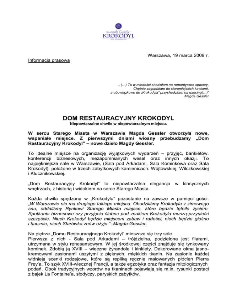 Warszawa, 19 marca 2009 r. Informacja prasowa „ (…) Tu w młodości chodziłam na romantyczne spacery. Chętnie zaglądałam do staromiejskich kawiarni, a obowiązkowo do „Krokodyla” przychodziłam na dancing(…)” Magda Gessler DOM RESTAURACYJNY KROKODYL Niepowtarzalne chwile w niepowtarzalnym miejscu. W sercu Starego Miasta w Warszawie Magda Gessler otworzyła nowe, wspaniałe miejsce. Z pierwszymi dniami wiosny przebudzamy „Dom Restauracyjny Krokodyl” – nowe dzieło Magdy Gessler. To idealne miejsce na organizację wyjątkowych wydarzeń – przyjęć, bankietów, konferencji biznesowych, niezapomnianych wesel oraz innych okazji. To najpiękniejsze sale w Warszawie, (Sala pod Arkadami, Sala Kominkowa oraz Sala Krokodyl), położone w trzech zabytkowych kamienicach: Wójtowskiej, Wilczkowskiej i Klucznikowskiej. „Dom Restauracyjny Krokodyl” to niepowtarzalna elegancja w klasycznych wnętrzach, z historią i widokiem na serce Starego Miasta. Każda chwila spędzona w „Krokodylu” pozostanie na zawsze w pamięci gości. „W Warszawie nie ma drugiego takiego miejsca. Obudziliśmy Krokodyla z zimowego snu, oddaliśmy Rynkowi Starego Miasta miejsce, które będzie tętniło życiem. Spotkania biznesowe czy przyjęcia ślubne pod znakiem Krokodyla muszą przynieść szczęście. Niech Krokodyl będzie miejscem zabaw i radości, niech będzie głośno i hucznie, niech Starówka znów ożyje.”- Magda Gessler. Na piętrze „Domu Restauracyjnego Krokodyl” mieszczą się trzy sale. Pierwsza z nich - Sala pod Arkadami – trójdzielna, podzielona jest filarami, utrzymana w stylu renesansowym. W jej środkowej części znajduje się tynkowany kominek. Zdobią ją XVIII – wieczne żyrandole i kinkiety. Dekorowane okna jasnokremowymi zasłonami uszytymi z pięknych, miękkich tkanin. Na zasłonie każdej widnieją scenki rodzajowe, które są repliką ręcznie malowanych płócien Pierra Frey’a. To szyk XVIII-wiecznej Francji, a także egzotyka oraz fantazja mitologicznych podań. Obok tradycyjnych wzorów na tkaninach pojawiają się m.in. rysunki postaci z bajek La Fontaine’a, słodyczy, paryskich zabytków. Sala Kominkowa „Domu Restauracyjnego Krokodyl” utrzymana jest również w stylu renesansowym. Uwagę zwraca piękny, belkowy sufit i stylowy kominek. Okna zdobią zasłony z naturalnego jedwabiu w bordo - fioletowych kolorach. Okna wychodzą na Rynek Starego Miasta, gdzie rozciąga się piękny widok na kolorowe kamienice i syrenkę warszawską. „Dom Restauracyjny Krokodyl” stwarza możliwość różnych aranżacji sal na potrzeby organizacji wyjątkowych wydarzeń - przyjęć, bankietów, wesel i innych uroczystości. „Krokodyl” to ponad 240 metrów kwadratowych powierzchni na które składają się 3 sale. Sala pod Arkadami dzielona filarami ma łączną powierzchnię 139 m2, w tym każda z osobna (55 + 25 + 59) m2. Sala Kominkowa to 79 m2 i Sala Krokodyl obok kominkowej o powierzchni 23m2. „Dom Restauracyjny Krokodyl” pomieści ok. 250 osób. Historycznie o Krokodylu „Krokodyl” to kultowe miejsce, na wspomnienie którego niejednemu mieszkańcowi Warszawy uśmiech pojawia się na twarzy. To tutaj odbywały się najwspanialsze dancingi i bale w mieście. Wejście do „Krokodyla” wyróżnia się spośród pozostałych. Wchodzimy przez podwójny portal gotycki, zbudowany na początku XVI wieku przez Macieja Wilczka. W kamienicy na parterze znajdowało się wejście do zespołu gastronomicznego „Krokodyl”. Nad wejściem widnieje do dzisiaj metalowy symbol krokodyla. W piwnicach mieściła się restauracja przypominająca gotycką gospodę. Stoliki i zydle1, weneckie latarki, świece w żelaznych lichtarzach doskonale harmonizowały z murami piwnic. Centralna sala posiadała sklepienie klasztorne z krzyżującymi się łukami, wykonanymi z surowej cegły. Projektantami restauracji byli architekci: Jerzy Bieńkowski, Krystyna Kognowicka i Zofia Krotkiewska. Na parterze był bar kawowy, zdobiony kolorowymi figurkami, przedstawiającymi postacie staromiejskie z XVII w. Znajdował się tam okrągły ceramiczny piec z motywami zielonego krokodyla, stylowe meble oraz autentyczne zabytkowe żyrandole i kinkiety z XVIII w.2 Jedną z ciekawostek, którą kryją mury „Krokodyla” jest niecodzienny prezent od premiera Kuby – Fidela Castro. Podczas swojej wizyty w Warszawie 6 czerwca 1972 roku w restauracji Premier po całym lokalu szukał tytułowego krokodyla. Dopiero od obsługi dowiedział się, że go tam po prostu nie ma. Po jakimś czasie przyszedł prezent z Kuby. Paczka z wielkim wypchanym krokodylem. Od tego momentu podarek ten wzbudzał zawsze sensację wśród odwiedzających gości. 1 Zydel - mebel do siedzenia, odmiana taboretu twardego, przeważnie w konstrukcji bezoskrzyniowej lub deskowej (odm. sgabello), www.wikipedia.pl 2 „Historia kamieniczek na Rynku Starego Miasta”, Juliusz Pollack, Julian Żebrowski, Warszawa 1988 r. Kontakt: BCMFD media communications, tel. 022 403 50 91, fax 022 403 49 46