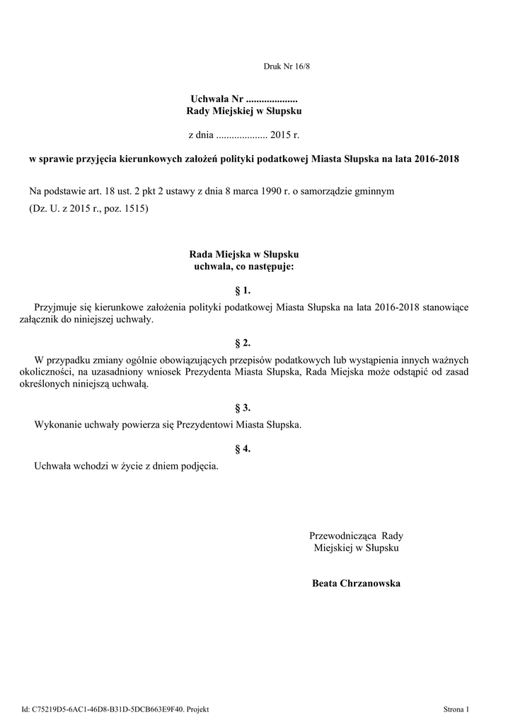 Druk Nr 16/8 Uchwała Nr .................... Rady Miejskiej w Słupsku z dnia .................... 2015 r. w sprawie przyjęcia kierunkowych założeń polityki podatkowej Miasta Słupska na lata 2016-2018 Na podstawie art. 18 ust. 2 pkt 2 ustawy z dnia 8 marca 1990 r. o samorządzie gminnym (Dz. U. z 2015 r., poz. 1515) Rada Miejska w Słupsku uchwala, co następuje: § 1. Przyjmuje się kierunkowe założenia polityki podatkowej Miasta Słupska na lata 2016-2018 stanowiące załącznik do niniejszej uchwały. § 2. W przypadku zmiany ogólnie obowiązujących przepisów podatkowych lub wystąpienia innych ważnych okoliczności, na uzasadniony wniosek Prezydenta Miasta Słupska, Rada Miejska może odstąpić od zasad określonych niniejszą uchwałą. § 3. Wykonanie uchwały powierza się Prezydentowi Miasta Słupska. § 4. Uchwała wchodzi w życie z dniem podjęcia. Przewodnicząca Rady Miejskiej w Słupsku Beata Chrzanowska Id: C75219D5-6AC1-46D8-B31D-5DCB663E9F40. Projekt Strona 1 UZASADNIENIE 1. Przedstawienie istniejącego stanu w dziedzinie, która ma być normowana. Zgodnie z obecnym stanem prawnym gmina stała się odrębnym od państwa podmiotem w sferze majątkowej i publicznoprawnej. Realizuje ona na własną odpowiedzialność i we własnym imieniu zadania publiczne wynikające z ustaw, służące zaspokojeniu potrzeb wspólnoty samorządowej. 2. Wyjaśnienie potrzeb i celu podjęcia uchwały. Zarządzanie sprawami publicznymi wymaga przyjęcia i respektowania zbioru powszechnie akceptowanych wartości, które powinny mieć wpływ na decyzje podejmowane przez władze samorządowe. Należą do nich: lokalność, autonomia, demokracja, efektywność, równowaga i trwałość. Stanowienie prawa miejscowego w zakresie niektórych podatków i opłat jest jedną z najważniejszych zasad w odniesieniu do systemu finansów samorządu terytorialnego. Gmina nabyła rzeczywiste prawo do podejmowania uchwał w sprawach podatków i opłat w granicach określonych ustawowo. Przyznane władztwo podatkowe oznacza, że poziom niektórych podatków i opłat lokalnych, jest częściowo uzależniony od decyzji przedstawicieli samorządów terytorialnych, choć musi zawierać się w przedziale określonym stosownymi przepisami. W myśl ustaw o dochodach jednostek samorządu terytorialnego i o samorządzie gminnym podatki i opłaty lokalne pełnią szczególną funkcję fiskalną i są ważnym elementem dochodów gminy. W sferze ich funkcjonowania organy gminy wyposażone zostały w określone władztwo podatkowe. Zakres uprawnień i kompetencji organów gminy dotyczących podatków i opłat lokalnych odnosi się w szczególności do rady gminy oraz wójta (burmistrza, prezydenta). Organy te mają możliwość przejmowania wpływów z podatków i opłat lokalnych na rzecz gminnego budżetu, a także są uprawnione do administrowania (zarządzania) tymi podatkami. Rada gminy posiadając uprawnienia ustala w drodze uchwały stawki podatkowe na dany rok podatkowy oraz może wprowadzać inne zwolnienia przedmiotowe niż określone w ustawach podatkowych kierując się własną oceną potrzeb wspólnoty samorządowej jak i względami własnych dochodów kształtuje politykę podatkową na szczeblu lokalnym. 3. Wykazanie różnic między dotychczasowym a projektowanym stanem prawnym. Dotychczas nie istniał akt prawny, który normowałby strategię podatkową Miasta Słupska. Na przestrzeni lat poprzednich stawki podatków podwyższane były w sposób bardzo nieregularny. Decyzje w zakresie ustalania stawek na dany rok podatkowy podejmowane były głównie w oparciu o wskaźnik wzrostu cen detalicznych towarów i usług konsumpcyjnych, który jest ustalany na podstawie komunikatu Prezesa Głównego Urzędu Statystycznego. 4. Charakterystyka przewidywanych skutków społecznych i gospodarczych. Polityka podatkowa stanowi jeden z elementów założeń gospodarczych i społecznych mających na celu podniesienie jakości życia słupszczan, poprawę sytuacji ekonomicznej Miasta poprzez określenie kierunków działań fiskalnych. Zawarte w niej wytyczne doprowadzą do przewidywalnego wzrostu dochodów w perspektywie czasowej, co pozwoli na skuteczną realizację długoterminowych planów. Ponadto transparentność przyjętych zasad i możliwość stosowania mechanizmów regulujących lokalny system podatkowy (preferencje dla określonych grup przedsiębiorców) wpłynie pozytywnie na rozwój gospodarczy Miasta. 5. Skutki finansowe związane z wejściem w życie uchwały. Skutkiem finansowym przyjęcia niniejszej uchwały będzie coroczny wzrost dochodów gminy. Według wyliczeń na 2016 rok dochód zwiększy się o 5.306 902,00 zł. Przyjęcie proponowanego sposobu ustalania stawek podatkowych spowoduje w 2016 roku dla przeciętnego mieszkańca posiadającego lokal mieszkalny i garaż miesięczny wzrost podatku od nieruchomości o kwotę ok. 1,00 zł, natomiast dla przedsiębiorcy, którego aktualne zobowiązanie wynosi ok. 27.000,00 zł, podatek wzrośnie o kwotę 180,00 zł miesięcznie. 6. Źródła finansowania. Nie dotyczy. Id: C75219D5-6AC1-46D8-B31D-5DCB663E9F40. Projekt Strona 2 Załącznik do uchwały Nr …..................... Rady Miejskiej w Słupsku z dnia.......................................... w sprawie przyjęcia polityki podatkowej Miasta Słupska na lata 2016-2018 KIERUNKOWE ZAŁOŻENIA POLITYKI PODATKOWEJ MIASTA SŁUPSKA NA LATA 2016-2018 Głównym celem polityki społeczno - gospodarczej samorządu jest osiągnięcie wysokiej jakości życia mieszkańców poprzez zrównoważony rozwój gospodarczy miasta. Rozwój społeczny i gospodarczy uzależniony jest od wielu czynników. Można wśród nich wyróżnić możliwości finansowe wynikające z poziomu uzyskanych inwestowania mających na celu zapewnienie dochodów budżetu miasta oraz kierunków właściwej bazy społecznej, technicznej i gospodarczej. Dbałość o zrównoważony rozwój gospodarczy, kulturalny i społeczny wymag