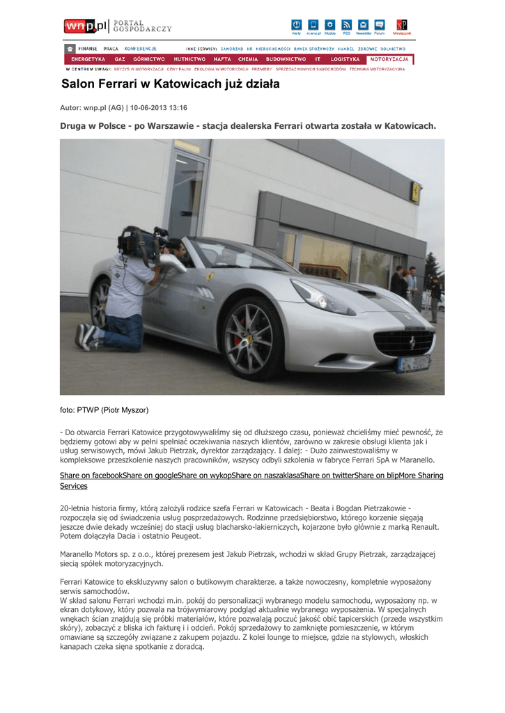 Salon Ferrari w Katowicach już działa Autor: wnp.pl (AG) | 10-06-2013 13:16 Druga w Polsce - po Warszawie - stacja dealerska Ferrari otwarta została w Katowicach. foto: PTWP (Piotr Myszor) - Do otwarcia Ferrari Katowice przygotowywaliśmy się od dłuższego czasu, ponieważ chcieliśmy mieć pewność, że będziemy gotowi aby w pełni spełniać oczekiwania naszych klientów, zarówno w zakresie obsługi klienta jak i usług serwisowych, mówi Jakub Pietrzak, dyrektor zarządzający. I dalej: - Dużo zainwestowaliśmy w kompleksowe przeszkolenie naszych pracowników, wszyscy odbyli szkolenia w fabryce Ferrari SpA w Maranello. Share on facebookShare on googleShare on wykopShare on naszaklasaShare on twitterShare on blipMore Sharing Services 20-letnia historia firmy, którą założyli rodzice szefa Ferrari w Katowicach - Beata i Bogdan Pietrzakowie rozpoczęła się od świadczenia usług posprzedażowych. Rodzinne przedsiębiorstwo, którego korzenie sięgają jeszcze dwie dekady wcześniej do stacji usług blacharsko-lakierniczych, kojarzone było głównie z marką Renault. Potem dołączyła Dacia i ostatnio Peugeot. Maranello Motors sp. z o.o., której prezesem jest Jakub Pietrzak, wchodzi w skład Grupy Pietrzak, zarządzającej siecią spółek motoryzacyjnych. Ferrari Katowice to ekskluzywny salon o butikowym charakterze. a także nowoczesny, kompletnie wyposażony serwis samochodów. W skład salonu Ferrari wchodzi m.in. pokój do personalizacji wybranego modelu samochodu, wyposażony np. w ekran dotykowy, który pozwala na trójwymiarowy podgląd aktualnie wybranego wyposażenia. W specjalnych wnękach ścian znajdują się próbki materiałów, które pozwalają poczuć jakość obić tapicerskich (przede wszystkim skóry), zobaczyć z bliska ich fakturę i i odcień. Pokój sprzedażowy to zamknięte pomieszczenie, w którym omawiane są szczegóły związane z zakupem pojazdu. Z kolei lounge to miejsce, gdzie na stylowych, włoskich kanapach czeka sięna spotkanie z doradcą. Serwis Ferrari Katowice to przestronny zespół pomieszczeń, gdzie mechanicy i elektrycy przeszkoleni w wloskim Maranello kompleksowo zajmują się pojazdami. Ferrari Katowice znajduje się tuz obok autostradowego węzła "Bocheńskiego" w Katowicach w bliskim sąsiedztwie centrum miasta. Przy salonie znajduje się lądowisko dla śmigłowców. Lokalizacja pozwala na łatwe przeprowadzenie jazd testowych po autostradzie, bez ryzyka utknięcia w śródmiejskich korkach. Salon będzie jeszcze rozbudowywany. Rodzina Pietrzaków dysponuje w tej strefie miasta rozległym terenem, który pozwala myśleć o ekspansji. To właśnie dynamiczny rozwój i perspektywy a także rodzinny charakter biznesu przekonał Włochów do współpracy z dealerem z Katowic. Co istotne, projekt i wykonanie salonu są autorstwa firmy "namaszczonej" przez Ferrari. Polski gospodarz nie decydował ani o wyposażeniu ani o materiałach zastosowanych podczas jego powstawania. To zasada, która stosowana jest we wszystkich przedstawicielstwach kultowej marki.