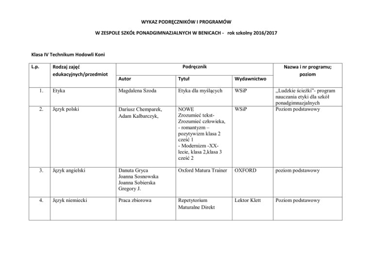 WYKAZ PODRĘCZNIKÓW I PROGRAMÓW W ZESPOLE SZKÓŁ PONADGIMNAZJALNYCH W BENICACH - rok szkolny 2016/2017 Klasa IV Technikum Hodowli Koni L.p. Rodzaj zajęć edukacyjnych/przedmiot Podręcznik Autor Tytuł Wydawnictwo Nazwa i nr programu; poziom 1. Etyka Magdalena Szoda Etyka dla myślących WSiP 2. Język polski Dariusz Chemparek, Adam Kalbarczyk, NOWE Zrozumieć tekstZrozumieć człowieka, - romantyzm – pozytywizm klasa 2 cześć 1 - Modernizm -XXlecie, klasa 2,klasa 3 cześć 2 WSiP ,,Ludzkie ścieżki”- program nauczania etyki dla szkół ponadgimnazjalnych Poziom podstawowy 3. Język angielski Danuta Gryca Joanna Sosnowska Joanna Sobierska Gregory J. Oxford Matura Trainer OXFORD poziom podstawowy 4. Język niemiecki Praca zbiorowa Repetytorium Maturalne Direkt Lektor Klett Poziom podstawowy 5. Matematyka Wojciech Babiański, Lech Chańko, Dorota Ponczek Matematyka część II 6. Biologia Franciszek Dubert, Ryszard Kozik i inni. Biologia na czasie 2 zakres rozszerzony – podręcznik dla liceum i technikum 7. Historia i społeczeństwo Franciszek Dubert, Marek Jurgowiak i inni. Biologia na czasie 3 zakres rozszerzony. Podręcznik dla liceum i technikum. Bohdan Halczak, Roman Józefiak, Małgorzata Szymczak , Historia i społeczeństwo „Wątek: Wojna i wojskowość”. Adam Balicki, Historia i społeczeństwo „Wątek: Rządzący i rządzeni” Nowa Era Poziom podstawowy i rozszerzony Nowa Era Program nauczania biologii w zakresie rozszerzonym Biologia na czasie- Urszula Poziomek Nowa Era Operon Program nauczania w zakresie podstawowymOdkrywamy na nowo 8. Matematyka – zakres rozszerzony Wojciech Babiański, Lech Chańko, Dorota Ponczek Matematyka część II Nowa Era Poziom podstawowy i rozszerzony 9. Podstawy użytkowania koni Podręcznik autoryzowany przez Polski Związek Jeździecki Zasady jazdy konnej część 1,2,3 Polski Związek Jeździecki E. Bogusławska, J. Jakubowska- Wójcik Program nauczania dla zawodu technik hodowca koni 314301 o strukt przedm. Ewa Walkowicz Hodowla i chów koni Wrocław 1997 Szczepan Chrzanowski, Anna Łojek, Sylwester Oleksiak Hodowla i użytkowanie koni Wydawnictwo SGGW Danuta Gryca Joanna Sosnowska Joanna Sobierska Gregory J. Opracowanie i korekta W. Pruchniewicz Oxford Matura Trainer OXFORD Ewa Jodkowska 10. Rekreacja i turystyka konna (*) 11. Język obcy zawodowy 12. Jeździectwo poziom podstawowy Zasady jazdy konnej I, II (*) Podręczniki zostaną podane na początku roku szkolnego 2016/2017 PZJ 2004, 2005 E. Bogusławska, J. Jakubowska- Wójcik Program nauczania dla zawodu technik hodowca koni 314301 o strukt przedm.