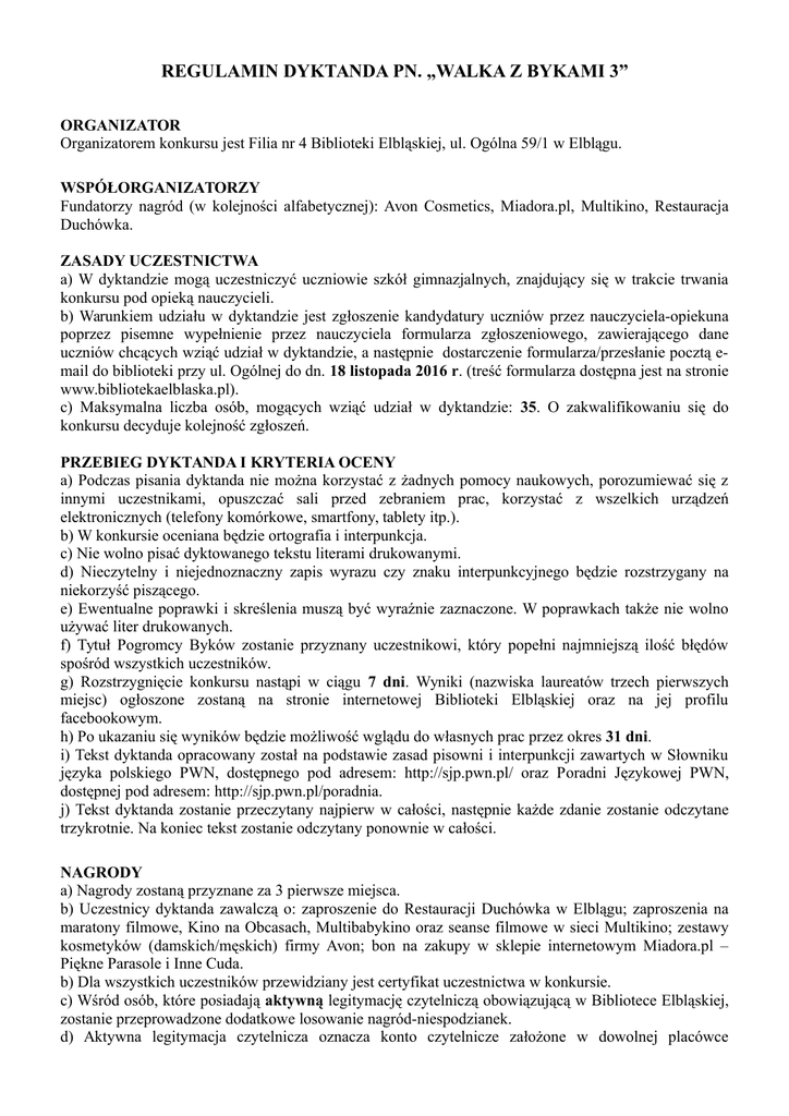 REGULAMIN DYKTANDA PN. „WALKA Z BYKAMI 3” ORGANIZATOR Organizatorem konkursu jest Filia nr 4 Biblioteki Elbląskiej, ul. Ogólna 59/1 w Elblągu. WSPÓŁORGANIZATORZY Fundatorzy nagród (w kolejności alfabetycznej): Avon Cosmetics, Miadora.pl, Multikino, Restauracja Duchówka. ZASADY UCZESTNICTWA a) W dyktandzie mogą uczestniczyć uczniowie szkół gimnazjalnych, znajdujący się w trakcie trwania konkursu pod opieką nauczycieli. b) Warunkiem udziału w dyktandzie jest zgłoszenie kandydatury uczniów przez nauczyciela-opiekuna poprzez pisemne wypełnienie przez nauczyciela formularza zgłoszeniowego, zawierającego dane uczniów chcących wziąć udział w dyktandzie, a następnie dostarczenie formularza/przesłanie pocztą email do biblioteki przy ul. Ogólnej do dn. 18 listopada 2016 r. (treść formularza dostępna jest na stronie www.bibliotekaelblaska.pl). c) Maksymalna liczba osób, mogących wziąć udział w dyktandzie: 35. O zakwalifikowaniu się do konkursu decyduje kolejność zgłoszeń. PRZEBIEG DYKTANDA I KRYTERIA OCENY a) Podczas pisania dyktanda nie można korzystać z żadnych pomocy naukowych, porozumiewać się z innymi uczestnikami, opuszczać sali przed zebraniem prac, korzystać z wszelkich urządzeń elektronicznych (telefony komórkowe, smartfony, tablety itp.). b) W konkursie oceniana będzie ortografia i interpunkcja. c) Nie wolno pisać dyktowanego tekstu literami drukowanymi. d) Nieczytelny i niejednoznaczny zapis wyrazu czy znaku interpunkcyjnego będzie rozstrzygany na niekorzyść piszącego. e) Ewentualne poprawki i skreślenia muszą być wyraźnie zaznaczone. W poprawkach także nie wolno używać liter drukowanych. f) Tytuł Pogromcy Byków zostanie przyznany uczestnikowi, który popełni najmniejszą ilość błędów spośród wszystkich uczestników. g) Rozstrzygnięcie konkursu nastąpi w ciągu 7 dni. Wyniki (nazwiska laureatów trzech pierwszych miejsc) ogłoszone zostaną na stronie internetowej Biblioteki Elbląskiej oraz na jej profilu facebookowym. h) Po ukazaniu się wyników będzie możliwość wglądu do własnych prac przez okres 31 dni. i) Tekst dyktanda opracowany został na podstawie zasad pisowni i interpunkcji zawartych w Słowniku języka polskiego PWN, dostępnego pod adresem: http://sjp.pwn.pl/ oraz Poradni Językowej PWN, dostępnej pod adresem: http://sjp.pwn.pl/poradnia. j) Tekst dyktanda zostanie przeczytany najpierw w całości, następnie każde zdanie zostanie odczytane trzykrotnie. Na koniec tekst zostanie odczytany ponownie w całości. NAGRODY a) Nagrody zostaną przyznane za 3 pierwsze miejsca. b) Uczestnicy dyktanda zawalczą o: zaproszenie do Restauracji Duchówka w Elblągu; zaproszenia na maratony filmowe, Kino na Obcasach, Multibabykino oraz seanse filmowe w sieci Multikino; zestawy kosmetyków (damskich/męskich) firmy Avon; bon na zakupy w sklepie internetowym Miadora.pl – Piękne Parasole i Inne Cuda. b) Dla wszystkich uczestników przewidziany jest certyfikat uczestnictwa w konkursie. c) Wśród osób, które posiadają aktywną legitymację czytelniczą obowiązującą w Bibliotece Elbląskiej, zostanie przeprowadzone dodatkowe losowanie nagród-niespodzianek. d) Aktywna legitymacja czytelnicza oznacza konto czytelnicze założone w dowolnej placówce Biblioteki Elbląskiej, którego posiadacz w roku 2016 odwiedził którąkolwiek placówkę biblioteczną w celu aktualizacji konta. Osoby, które nie posiadają konta czytelniczego w Bibliotece Elbląskiej, a chcą wziąć udział w dodatkowym losowaniu nagród, mogą założyć konto do dnia 18 listopada 2016 r., udając się osobiście do którejkolwiek z placówek Biblioteki Elbląskiej.