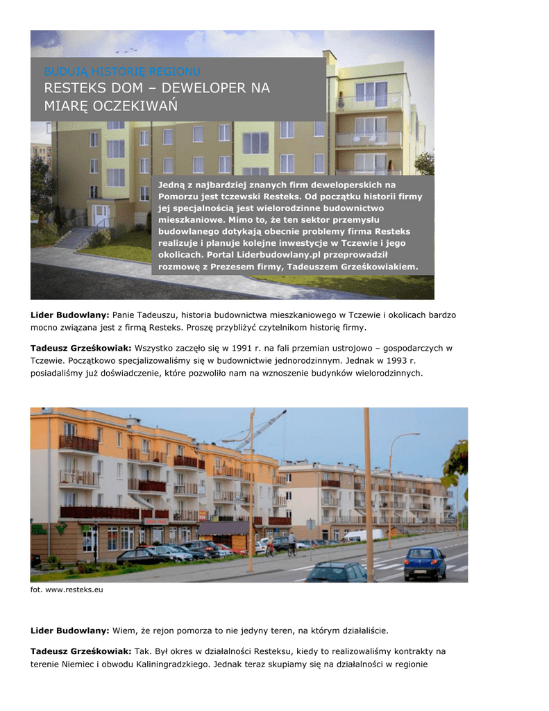 BUDUJĄ HISTORIĘ REGIONU RESTEKS DOM – DEWELOPER NA MIARĘ OCZEKIWAŃ Jedną z najbardziej znanych firm deweloperskich na Pomorzu jest tczewski Resteks. Od początku historii firmy jej specjalnością jest wielorodzinne budownictwo mieszkaniowe. Mimo to, że ten sektor przemysłu budowlanego dotykają obecnie problemy firma Resteks realizuje i planuje kolejne inwestycje w Tczewie i jego okolicach. Portal Liderbudowlany.pl przeprowadził rozmowę z Prezesem firmy, Tadeuszem Grześkowiakiem. Lider Budowlany: Panie Tadeuszu, historia budownictwa mieszkaniowego w Tczewie i okolicach bardzo mocno związana jest z firmą Resteks. Proszę przybliżyć czytelnikom historię firmy. Tadeusz Grześkowiak: Wszystko zaczęło się w 1991 r. na fali przemian ustrojowo – gospodarczych w Tczewie. Początkowo specjalizowaliśmy się w budownictwie jednorodzinnym. Jednak w 1993 r. posiadaliśmy już doświadczenie, które pozwoliło nam na wznoszenie budynków wielorodzinnych. fot. www.resteks.eu Lider Budowlany: Wiem, że rejon pomorza to nie jedyny teren, na którym działaliście. Tadeusz Grześkowiak: Tak. Był okres w działalności Resteksu, kiedy to realizowaliśmy kontrakty na terenie Niemiec i obwodu Kaliningradzkiego. Jednak teraz skupiamy się na działalności w regionie Tczewa i generalnie województwa pomorskiego. Lider Budowlany: Czy Resteks od początku działalności w sektorze budownictwa mieszkaniowego był samodzielnym inwestorem? Tadeusz Grześkowiak: Do 1999 roku byliśmy jedynie wykonawcą dla inwestorów zewnętrznych. Skorzystaliśmy na tej sytuacji, ponieważ dzięki niej mogliśmy budować nasze szerokie doświadczenie związane z tym sektorem. Od początku naszej działalności naszej firmie zaufały poważne instytucje, które w Tczewie miały i mają renomę jako fachowi inwestorzy. Były to m.in. Spółdzielnia Mieszkaniowa „Stare Przedmieście” i najstarsza Spółdzielnia Mieszkaniowa w Tczewie znajdująca się przy Alei Zwycięstwa, TBS Pruszcz Gdański oraz Wojskowa Agencja Mieszkaniowa Oddział w Gdyni. Działalność typowo deweloperską rozpoczęliśmy w 1999 roku, kiedy to powstała spółka Resteks Dom. Jeszcze na jesieni tego roku nasza firma rozpoczęła budowę własnego budynku wielorodzinnego na osiedlu Bajkowym, powiększając liczbę firm deweloperskich działających na terenie Tczewa. fot. www.resteks.eu Lider Budowlany: Można powiedzieć, że jako jedna z niewielu firm braliście udział w tworzeniu od podstaw tego osiedla mieszkaniowego. Jakie inwestycje firma Resteks przeprowadziła w tym rejonie? Tadeusz Grześkowiak: Jak już wspominałem na osiedlu Bajkowym powstała nasza pierwsza, samodzielna realizacja. Był to budynek przy ul. Kubusia Puchatka 5, który został oddany do użytkowania w czerwcu 2001 roku. Znajdują się w nim 64 mieszkania oraz 15 lokali usługowych. Największymi inwestycjami firmy były te z lat 2003 – 2008. W ciągu pięciu lat przeprowadziliśmy na osiedlu Bajkowym dwie inwestycje, największe w historii Resteksu. W listopadzie 2003 roku rozpoczęto budowę pierwszego budynku na działce przy ulicy Czerwonego Kapturka. Wybudowano na niej łącznie zespół 9 budynków mieszkalnych wielorodzinnych o łącznej powierzchni 12920m2. Inwestycja wraz z zagospodarowaniem terenu, placami zabaw oraz terenami zielonymi została zakończona w kwietniu 2008r. Natomiast w 2007 r. Resteks zainwestował w zakup działki 161 przy ul. Jasia i Małgosi, a w marcu 2008 roku rozpoczęła się budowa zespołu 6 budynków mieszkalno - usługowych wraz z garażami o łącznej powierzchni 12998m2. fot. www.resteks.eu Lider Budowlany: Ile łącznie budynków zrealizował Resteks na osiedlu Bajkowym? Tadeusz Grześkowiak: Na Osiedlu Bajkowym wybudowano około 20 budynków wraz z placami zabaw przy ulicach Kubusia Puchatka, Czerwonego Kapturka, Andersena i Jasia i Małgosi o łącznej powierzchni mieszkań 31828,65m2 oraz lokale usługowe o powierzchni 3113m2, które budowano z myślą o wygodzie mieszkańców, np. przychodnia zdrowia, sklepy spożywcze, restauracja i inne niezbędne do funkcjonowania osiedla. fot. www.resteks.eu Lider Budowlany: Jakie inwestycje są obecnie realizowane przez firmę Resteks? Tadeusz Grześkowiak: Na dzień dzisiejszy jesteśmy w trakcie realizacji inwestycji w miejscowości Tczewskie Łąki. Jest to zespół trzech budynków mieszkalnych wielorodzinnych typu "Dom nad bulwarem". W jednym budynku zaprojektowano 8 mieszkań, w tym: 4 mieszkania o powierzchni około 50m2, 2 mieszkania około 60m2 oraz 2 mieszkania około 30m2, czyli łącznie 24 lokale mieszkalne. Lider Budowlany: Jakie są plany na przyszłość? Tadeusz Grześkowiak: Do końca 2014 roku planujemy zrealizowanie dwóch inwestycji. Pierwsza z nich to 2 budynki : mieszkalno usługowy i mieszkalny w pobliżu Starówki - przy Ul. Kościuszki. Inwestycja będzie zlokalizowana w niedalekiej odległości od Bulwaru Nadwiślańskiego, co pozytywnie wpłynie na komfort życia mieszkańców. Druga to kolejny budynek na osiedlu bajkowym. Przy ul. Jasia i Małgosi powstaną dwa budynki mieszkalne wielorodzinne z halami garażowymi w kondygnacji podziemnej. Lider Budowlany: Dziękuję za rozmowę. Aby skontaktować się z firmą zajrzyj na www.resteks.eu