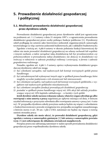 5. Prowadzenie działalności gospodarczej i politycznej 5.1. Możliwość prowadzenia działalności gospodarczej przez dyrektora szkoły Prowadzenie działalności gospodarczej przez dyrektorów szkół jest ograniczone na podstawie art. 1 i 2 ustawy z dnia 21 sierpnia 1997 r. o ograniczeniu prowadzenia działalności gospodarczej przez osoby pełniące funkcje publiczne [1]. Dyrektorzy szkół podlegają tej ustawie jako kierownicy jednostek organizacyjnych samorządu terytorialnego (a więc zarówno jednostek budżetowych, jak i zakładów budżetowych). Zgodnie z treścią art. 4 pkt 6 ustawy w okresie pełnienia funkcji kierowniczej dyrektor nie może prowadzić działalności gospodarczej na własny rachunek lub wspólnie z innymi osobami, a także zarządzać taką działalnością lub być przedstawicielem czy pełnomocnikiem w prowadzeniu takiej działalności; nie dotyczy to działalności wytwórczej w rolnictwie w zakresie produkcji roślinnej i zwierzęcej, w formie i zakresie gospodarstwa rodzinnego. Ponadto, zgodnie art. 4 pkt 1–5 ustawy, oprócz wykonywania działalności gospodarczej dyrektorzy szkół nie mogą: 1) być członkami zarządów, rad nadzorczych lub komisji rewizyjnych spółek prawa handlowego; 2) być zatrudnionymi lub wykonywać innych zajęć w spółkach prawa handlowego, które mogłyby wywołać podejrzenie o ich stronniczość lub interesowność; 3) być członkami zarządów, rad nadzorczych lub komisji rewizyjnych spółdzielni, z wyjątkiem rad nadzorczych spółdzielni mieszkaniowych; 4) być członkami zarządów fundacji prowadzących działalność gospodarczą; 5) posiadać w spółkach prawa handlowego więcej niż 10% akcji lub udziały przedstawiające więcej niż 10% kapitału zakładowego – w każdej z tych spółek. Jeżeli dyrektor szkoły narusza wskazane zakazy, właściwy organ odwołuje go albo rozwiązuje z nim umowę o pracę najpóźniej po upływie miesiąca od dnia, w którym uzyskał informację o przyczynie odwołania albo rozwiązania umowy o pracę (art. 4 ustawy). W przypadku dyrektora szkoły powyższa sankcja będzie się wiązać z odwołaniem z funkcji kierowniczej z powodu wystąpienia tzw. przypadku szczególnie uzasadnionego, o którym mowa w art. 38 ust. 1 pkt 2 USO, natomiast nie będzie się wiązać z rozwiązaniem stosunku pracy. Dyrektor szkoły nie może ukryć, że prowadzi działalność gospodarczą, gdyż zgodnie z ustawą o samorządzie gminnym [2] lub ustawą o samorządzie powiatowym [3] jest zobowiązany do składania oświadczeń majątkowych. Przepisy prawa nie zabraniają natomiast w żaden sposób prowadzenia działalności gospodarczej przez współmałżonka dyrektora szkoły. 169 Zakaz zajmowania stanowisk w organach spółek nie dotyczy dyrektora szkoły, o ile zgłoszony został do objęcia takiego stanowiska w spółce prawa handlowego przez: Skarb Państwa, inne państwowe osoby prawne, spółki, w których udział Skarbu Państwa przekracza 50% kapitału zakładowego lub 50% liczby akcji, jednostki samorządu terytorialnego, ich związki lub inne osoby prawne jednostek samorządu terytorialnego; osoby te nie mogą zostać zgłoszone do więcej niż dwóch spółek prawa handlowego z udziałem podmiotów zgłaszających te osoby (art. 6 ustawy). Podsumowując, dyrektorzy szkół, jako kierownicy jednostek organizacyjnych samorządu terytorialnego, są pozbawieni możliwości prowadzenia działalności gospodarczej na własny rachunek lub wspólnie z innymi osobami. Dyrektorzy szkół nie mogą także zarządzać taką działalnością lub być przedstawicielem czy pełnomocnikiem w prowadzeniu takiej działalności. Wyjątkiem od tej zasady jest prowadzenie działalności wytwórczej w rolnictwie w zakresie produkcji roślinnej i zwierzęcej, w formie i zakresie gospodarstwa rodzinnego. 5.2. Prowadzenie działalności politycznej Wielu dyrektorów angażuje się w politykę – na ogół w skali lokalnej. W Polsce żadne przepisy nie regulują kwestii aktywności politycznej zarówno nauczycieli, jak i dyrektorów szkół. Decydując się na karierę polityczną, dyrektor szkoły musi pamiętać o tym, że powinien być przede wszystkim autorytetem i wzorem dla uczniów i nie powinien wykorzystywać swojej pozycji dla własnych korzyści. Angażując się w życie polityczne, dyrektor szkoły powinien wiedzieć, że jego aktywność na tym polu może mieć poważny wpływ na zajmowane stanowisko. Otóż zgodnie z art. 24a ust. 2 ustawy o samorządzie gminnym radny nie może pełnić funkcji kierownika gminnej jednostki organizacyjnej oraz jego zastępcy, tej JST, która jest organem prowadzącym szkołę. W praktyce oznacza to, że niedopuszczalne jest łączenie mandatu radnego z zatrudnieniem na stanowisku dyrektora publicznej (samorządowej) szkoły, działającej na terenie gminy, w której radny uzyskał mandat. Cytowany przepis dotyczy tylko i wyłącznie dyrektorów szkół publicznych, a zatem dyrektor szkoły niepublicznej, wpisanej do ewidencji prowadzonej przez gminę, może być radnym w mieście, w którym placówka została wpisana do ewidencji niepublicznych jednostek oświatowych. Radny, który przed dniem wyboru był zatrudniony w urzędzie gminy albo pełnił funkcję kierownika gminnej jednostki organizacyjnej lub jego zastępcy, przed przystąpieniem do wykonywania mandatu obowiązany jest złożyć wniosek o urlop bezpłatny w terminie 7 dni od dnia ogłoszenia wyników wyborów przez właściwy organ wyborczy. Niezłożenie wniosku w tym terminie jest równoznaczne ze zrzeczeniem się mandatu (art. 24b ust. 5 ustawy o samorządzie gminnym), więc powoduje wygaśnięcie mandatu. Wystąpienie o urlop bezpłatny jest dla pracodawcy wiążące. Radny otrzymuje urlop bezpłatny na okres sprawowania mandatu oraz 3 miesięcy po jego wygaśnięciu. Radny otrzymuje urlop bezpłatny bez względu na rodzaj i okres trwania stosunku pracy. 170 Stosunek pracy zawarty na cza
