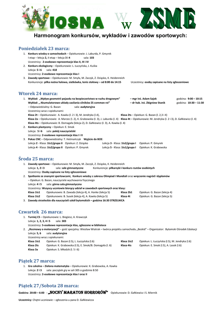 Harmonogram konkursów, wykładów i zawodów sportowych: Poniedziałek 23 marca: 1. Konkurs wiedzy o samochodach – Opiekunowie: J. Laburda, P. Gmyrek I etap – lekcja 2, II etap – lekcja 3 i 4 sala: 103 Uczestnicy: 2-osobowe reprezentacje klas II, III i IV 2. Konkurs ekologiczny – Opiekunowie: L. Łuczyńska, J. Kuśka Lekcja: 5 i 6 sala: 418 Uczestnicy: 2-osobowe reprezentacje klas I 3. Zawody sportowe – Opiekunowie: M. Smyła, M. Zaczyk, Z. Dziąsko, K. Heidenreich Konkurencje: piłka nożna halowa, siatkówka, tenis stołowy – od 8:00 do 14:15 Uczestnicy: osoby zapisane na listy zgłoszeniowe Wtorek 24 marca: 1. Wykład: „Wpływ geometrii pojazdu na bezpieczeństwo w ruchu drogowym” – mgr inż. Adam Sajok godzina: 9:00 – 10:15 Wykład: „ Akumulatorowe układy zasilania silników ZS common rei” – dr hab. inż. Zbigniew Stanik godzina: 10:30 – 11:30 – Odpowiedzialny: G. Bazan sala: audytoryjna Uczestnicy wraz z opiekunami: Klasa 2t – Opiekunowie: A. Kawka (l. 2 i 3), M. Jendryka (l.4), Klasa 2ts – Opiekun: G. Bazan (l. 2,3 i 4) Klasa 2a – Opiekunowie: A. Marzec (l. 2), K. Grabowska (l. 3), J. Laburda (l. 4) Klasa 4t – Opiekunowie: M. Jendryka (l. 2 i 3), D. Gałkiewicz (l. 4) Klasa 4ts – Opiekunowie: B. Domagała (lekcja 2), D. Gałkiewicz (l. 3), A. Kawka (l. 4) 2. Konkurs plastyczny – Opiekun: E. Smok Lekcja: 5 i 6 sala: pokój nauczycielski Uczestnicy: 2-osobowe reprezentacje klas I i II 3. Pokaz CNC – Odpowiedzialny: T. Hetmańczyk Wyjście do BOE: Lekcja 2 - Klasa: 1ts1/grupa II Opiekun: Z. Dziąsko Lekcja 3 - Klasa: 1ts2/grupa I Opiekun: P. Gmyrek Lekcja 4 - Klasa: 1ts2/grupa II Opiekun: P. Gmyrek Lekcja 5 - Klasa: 1ts1/grupa I Opiekun: K. Grabowska Środa 25 marca: 1. Zawody sportowe – Opiekunowie: M. Smyła, M. Zaczyk, Z. Dziąsko, K. Heidenreich Lekcja: 1, 2 i 3 sala: sale gimnastyczne Konkurencje: piłkarzyki i konkurs rzutów osobistych Uczestnicy: Osoby zapisane na listy zgłoszeniowe 2. Spotkanie ze znanymi sportowcami, Konkurs wiedzy z zakresu Olimpiad i Mundiali oraz wręczenie nagród i dyplomów – Opiekun: G. Bazan, nauczyciele wychowania fizycznego Lekcja: 4 i 5 sala: górna sala gimnastyczna Uczestnicy: Wszyscy uczniowie biorący udział w zawodach sportowych oraz klasy: Klasa 1ts1 Opiekunowie: B. Zawada (lekcja 4), A. Hanke (lekcja 5) Klasa 2b1 Opiekun: G. Bazan (lekcja 4) Klasa 1ts2 Opiekunowie: B. Susek (lekcja 4), A. Kawka (lekcja 5) Klasa 4t Opiekun: G. Bazan (lekcja 5) 3. Zawody strzeleckie dla nauczycieli szkół bytomskich – godzina 16:30 STRZELNICA Czwartek 26 marca: 1. Turniej CS – Opiekunowie: L. Biegiesz, A. Krawczyk Lekcja: 1, 2, 3, 4 i 5 sala: 303 Uczestnicy: 5-osobowe reprezentacje klas, zgłoszone w bibliotece 2. „Rozmowy o motoryzacji” – gość specjalny: Wiesław Wiatrak – twórca projektu samochodu „Beskid” – Organizator: Bytomski Ośrodek Edukacji Lekcja: 5, 6 sala: audytoryjna Uczestnicy wraz z opiekunami: Klasa 1ts1 Opiekun: G. Bazan (l.5), L. Łuczyńska (l.6) Klasa 1ts2 Opiekun: L. Łuczyńska (l.5), M. Jendryka (l.6) Klasa 2ts Opiekun: K. Grabowska (l.5), E. Smok/B. Domagała (l. 6) Klasa 4ts Opiekun: E. Smok (l.5), A. Lasok (l.6) Klasa 3a Opiekun: S. Młodzik (l. 5 i 6) Piątek 27 marca: 1. Gra szkolna – Zielona matematyka – Opiekunowie: K. Grabowska, A. Kawka Lekcja: 2 i 3 sala: początek gry w sali 305 o godzinie 8:50 Uczestnicy: 2-osobowe reprezentacje klas I oraz II Piątek 27/Sobota 28 marca: Godzina 20:00 – 6:00 - „Nocny maraton horrorów” Uczestnicy: Chętni uczniowie – zgłoszenia u pana D. Gałkiewicza Opiekunowie: D. Gałkiewicz i S. Miernik