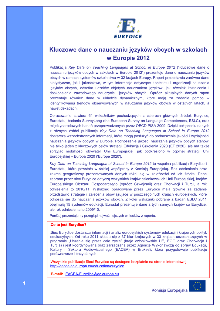 Key Data on Teaching Languages at School in Europe 2012 to wspólna publikacja Eurydice i