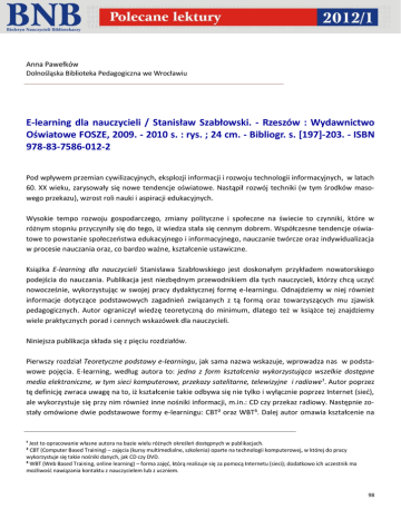 Anna Pawełków Dolnośląska Biblioteka Pedagogiczna we Wrocławiu E-learning dla nauczycieli / Stanisław Szabłowski. - Rzeszów : Wydawnictwo Oświatowe FOSZE, 2009. - 2010 s. : rys. ; 24 cm. - Bibliogr. s. [197]-203. - ISBN 978-83-7586-012-2 Pod wpływem przemian cywilizacyjnych, eksplozji informacji i rozwoju technologii informacyjnych, w latach 60. XX wieku, zarysowały się nowe tendencje oświatowe. Nastąpił rozwój techniki (w tym środków masowego przekazu), wzrost roli nauki i aspiracji edukacyjnych. Wysokie tempo rozwoju gospodarczego, zmiany polityczne i społeczne na świecie to czynniki, które w różnym stopniu przyczyniły się do tego, iż wiedza stała się cennym dobrem. Współczesne tendencje oświatowe to powstanie społeczeństwa edukacyjnego i informacyjnego, nauczanie twórcze oraz indywidualizacja w procesie nauczania oraz, co bardzo ważne, kształcenie ustawiczne. Książka E-learning dla nauczycieli Stanisława Szabłowskiego jest doskonałym przykładem nowatorskiego podejścia do nauczania. Publikacja jest niezbędnym przewodnikiem dla tych nauczycieli, którzy chcą uczyć nowocześnie, wykorzystując w swojej pracy dydaktycznej formę e-learningu. Odnajdziemy w niej również informacje dotyczące podstawowych zagadnień związanych z tą formą oraz towarzyszących mu zjawisk pedagogicznych. Autor ograniczył wiedzę teoretyczną do minimum, dlatego też w książce tej znajdziemy wiele praktycznych porad i cennych wskazówek dla nauczycieli. Niniejsza publikacja składa się z pięciu rozdziałów. Pierwszy rozdział Teoretyczne podstawy e-learningu, jak sama nazwa wskazuje, wprowadza nas w podstawowe pojęcia. E-learning, według autora to: jedna z form kształcenia wykorzystująca wszelkie dostępne media elektroniczne, w tym sieci komputerowe, przekazy satelitarne, telewizyjne i radiowe¹. Autor poprzez tę definicję zwraca uwagę na to, iż kształcenie takie odbywa się nie tylko i wyłącznie poprzez Internet (sieć), ale wykorzystuje się przy nim również inne nośniki informacji, m.in.: CD czy przekaz radiowy. Następnie zostały omówione dwie podstawowe formy e-learningu: CBT² oraz WBT³. Dalej autor omawia kształcenie na ¹ Jest to opracowanie własne autora na bazie wielu różnych określeń dostępnych w publikacjach. ² CBT (Computer Based Training) – zajęcia (kursy multimedialne, szkolenia) oparte na technologii komputerowej, w której do pracy wykorzystuje się takie nośniki danych, jak CD czy DVD. ³ WBT (Web Based Training, online learning) – forma zajęć, którą realizuje się za pomocą Internetu (sieci); dodatkowo ich uczestnik ma możliwość nawiązania kontaktu z nauczycielem lub z uczniem. 98 odległość oraz specjalne oprogramowanie, tzw. platformę e-learningową. Definiuje również nowe terminy e-learningowe, dla lepszego zapoznania się z tematem: e-kształcenie, e-edukacja, b-learning⁴, m-learning⁵ oraz rapid e-learning⁶. Następnie przedstawiono zarys historii kształcenia na odległość na świecie i w Polsce, a także zagadnienia prawne związane z e-learningiem. W dalszej części rozdziału przeczytamy o modelach kształcenia oraz standardach. Natomiast wszelkim teoriom pedagogicznym oraz multimediom poświęcono końcową część rozdziału. W rozdziale drugim opisano narzędzia edytorskie, za pomocą których można w prosty i szybki sposób tworzyć multimedialne opracowania metodyczne. Zwrócono również uwagę na ich edycję oraz zasady doboru wybranych komponentów multimediów, które szczegółowo opisano. Narzędziom sieciowym poświęcono dalszą część rozdziału. Aby wykorzystać wymienione i opisane w rozdziale aplikacje wystarczy przeglądarka internetowa i dostęp do sieci Internet, a w niektórych przypadkach ciągle jeszcze sieć lokalna. Narzędzia pomiaru dydaktycznego i ewaluacji kończą rozdział, a opisane testy elektroniczne dają możliwość sprawdzenia i oceny efektów kształcenia w e-learningu. Rozdział trzeci został poświęcony platformom edukacyjnym, e-learningowym. Są to rozbudowane aplikacje internetowe ułatwiające tworzenie, prowadzenie i administrowanie kursami edukacyjnymi⁷. Przeanalizowano kilka z nich – platformie Moodle poświęcono najwięcej uwagi, ponieważ jest dziś ona niezwykle popularna wśród nauczycieli. W rozdziale dokładnie przedstawiono, w jaki sposób, krok po kroku, tworzyć kursy na tej platformie. W edukacji na odległość ważna stała się technologia Web 2.0, która jest tworzona przez jej użytkowników. Poprzez tworzenie blogów, dodawanie zdjęć, filmów wideo czy innych plików do poszczególnych serwisów internetowych, społeczność ta staje się niejako współautorem. Temu zagadnieniu poświęcony został rozdział czwarty. Analizie pedagogicznej poddano takie narzędzia e-learningowe, jak: serwisy e-społeczności, kanały i czytniki RSS, środowisko Wiki, blogi, które oparte są na systemie pracy grupowej, a także social bookmarking⁸ i webcast⁹. Koniec rozdziału poświęcono zagadnieniu wartości pedagogicznej blogów. W ostatnim, piątym, rozdziale przedstawiono Metodykę projektowania i wdrażania e-learningu w szkole. Na początku rozdziału przedstawiono metody nauczania, które są najczęściej wykorzystywane w kształceniu na odległość. Omówiono model behawiorystyczny nauczania oraz współczesną dydaktykę, przy jednoczesnej komplementarności różnych metod kształcenia. Podano przykłady kursów programowych. Opisano model konstruktywistyczny uczenia się, który daje możliwość aktywnego tworzenia wiedzy przez osobę uczącą się, a także samodzielnego dochodzenia przez nią do wiedzy, ponieważ to uczący się decyduje, jaki będzie miał wpływ na swój proces kształcenia. ⁴ B-learning (blended learning) – czyli kształcenie komplementarne, dzięki któremu zajęcia w tradycyjnej klasie są połączone z zajęciami w Internecie. ⁵ M-learning – to kształcenie mobiln