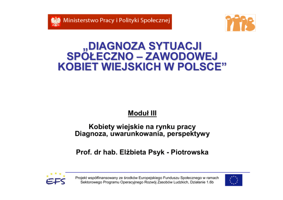 „DIAGNOZA SYTUACJI SPOŁECZNO – ZAWODOWEJ KOBIET WIEJSKICH W POLSCE” Moduł III Kobiety wiejskie na rynku pracy Diagnoza, uwarunkowania, perspektywy Prof. dr hab. ElŜbieta Psyk - Piotrowska Projekt współfinansowany ze środków Europejskiego Funduszu Społecznego w ramach Sektorowego Programu Operacyjnego Rozwój Zasobów Ludzkich, Działanie 1.6b Plan Cel badań, zakres problematyki. Zbiorowość badana. Kobiety wiejskie na rynku pracy: - aktywne zawodowo, - nieaktywne zawodowo. Uwarunkowania i wyznaczniki aktywności zawodowej kobiet wiejskich. Przesłanki dla perspektyw sytuacji pracy kobiet wiejskich. Podsumowanie. Projekt współfinansowany ze środków Europejskiego Funduszu Społecznego w ramach Sektorowego Programu Operacyjnego Rozwój Zasobów Ludzkich, Działanie 1.6b Cel badań: Diagnoza sytuacji kobiet wiejskich na rynku pracy Uwarunkowania tej sytuacji i przyczyny Przesłanki dla dalszych perspektyw aktywności zawodowej kobiet wiejskich Projekt współfinansowany ze środków Europejskiego Funduszu Społecznego w ramach Sektorowego Programu Operacyjnego Rozwój Zasobów Ludzkich, Działanie 1.6b Zbiorowość badana Kobiety mieszkające na obszarach gmin wiejskich. W wieku od 18- 59 lat. Dobranej według 4 kryteriów: województwo, wiek, wykształcenie, aktywność zawodowa brak aktywności. Projekt współfinansowany ze środków Europejskiego Funduszu Społecznego w ramach Sektorowego Programu Operacyjnego Rozwój Zasobów Ludzkich, Działanie 1.6b Badane kobiety na rynku pracy: 48,6% pracujące zawodowo: - 19,4% w gospodarstwie rolnym, - 25,6% zawodowo, poza gospodarstwem rolnym, - 4% zarówno w gospodarstwie rolnym jak i zawodowo. 51,4% niepracujące zawodowo: - ok.11% uczy się, - 12% na rencie, emeryturze, - 7% nigdy nie pracowało - pozostałe - pracowały ale nie pracują. Projekt współfinansowany ze środków Europejskiego Funduszu Społecznego w ramach Sektorowego Programu Operacyjnego Rozwój Zasobów Ludzkich, Działanie 1.6b Uwarunkowania i wyznaczniki aktywności zawodowej kobiet wiejskich 1. Zmienne połoŜenia społecznego i materialnego jednostki: wiek, poziom wykształcenia, status zawodowy , oraz poziom zamoŜności, subiektywna ocena poziomu zaspokojenia potrzeb materialnych rodziny, korzystanie z pomocy społecznej, świadczeń socjalnych istotnie statystycznie (ale z niewielką siłą związku) wpływają na aktywność zawodową, szczególnie wiek. Ok. 3/4 kobiet w wieku do 25 lat i ¾ powyŜej 56 lat to niepracujące 68.5% w wieku 36-45lat pracuje zawodowo. Kobiety aktywne zawodowo są lepiej wykształcone, o wyŜszym poziomie zamoŜności. Projekt współfinansowany ze środków Europejskiego Funduszu Społecznego w ramach Sektorowego Programu Operacyjnego Rozwój Zasobów Ludzkich, Działanie 1.6b 2. Aktywność edukacyjna Udział w szkoleniach i kursach -w przeszłości i obecnie, posiadane kwalifikacje potwierdzone certyfikatem. Ocena własnych kwalifikacji. Kobiety aktywne mają wyŜszą samoocenę umiejętności zawodowych. Mało róŜnicuje zmienna aktywność edukacyjnauczestnictwo w kursach i kwalifikacje (prawo jazdy, obsługa komputera, znajomość języka) Projekt współfinansowany ze środków Europejskiego Funduszu Społecznego w ramach Sektorowego Programu Operacyjnego Rozwój Zasobów Ludzkich, Działanie 1.6b 3. Subiektywna ocena lokalnego rynku pracy Ocena rynku pracy w okolicy, szanse kobiet na lokalnym rynku w porównaniu z męŜczyznami. Nie jest to zmienna róŜnicująca kobiety pracujące i niepracujące Projekt współfinansowany ze środków Europejskiego Funduszu Społecznego w ramach Sektorowego Programu Operacyjnego Rozwój Zasobów Ludzkich, Działanie 1.6b 4. Sytuacja rodzinna Stan rodziny - posiadanie dzieci, liczba dzieci, w tym: liczba dzieci do lat trzech, aktywność zawodowa męŜa/partnera, członkowie rodziny na emigracji zarobkowej, system władzy w rodzinie. Sytuacja rodzinna wpływa w mniejszym stopniu na decyzję o podjęciu pracy niŜ system władzy w rodzinie. Liczba dzieci – jedno lub więcej niŜ troje ogranicza aktywność zawodową kobiet Projekt współfinansowany ze środków Europejskiego Funduszu Społecznego w ramach Sektorowego Programu Operacyjnego Rozwój Zasobów Ludzkich, Działanie 1.6b 5. Wzorce socjalizacyjne Praca w posiadanym przez badane kobiety systemie wartości, wzorce w zakresie pracy kobiet w rodzinie, najbliŜszym otoczeniu, aktywność zawodowa matki, wyobraŜenie o roli kobiety w rodzinie, opinia o potrzebie wykonywania przez kobiety pracy zawodowej warunkują aktywność zawodową kobiet wiejskich. Projekt współfinansowany ze środków Europejskiego Funduszu Społecznego w ramach Sektorowego Programu Operacyjnego Rozwój Zasobów Ludzkich, Działanie 1.6b 6. Działalność społeczno-polityczna PrzynaleŜność do organizacji społecznych i politycznych, udział w wyborach, aktywność społeczna (udział w działaniach na rzecz środowiska, akcjach). Nie jest korelatem istotnym statystycznie – niewielki odsetek kobiet jest aktywna społecznie i politycznie. Projekt współfinansowany ze środków Europejskiego Funduszu Społecznego w ramach Sektorowego Programu Operacyjnego Rozwój Zasobów Ludzkich, Działanie 1.6b 7. Czynniki środowiskowe Typ zamieszkałej wsi, bliskość aglomeracji miejskiej, obecność w okolicy znaczących pracodawców, ma znaczenie (niewielkie) dla aktywności zawodowej kobiet wiejskich. Projekt współfinansowany ze środków Europejskiego Funduszu Społecznego w ramach Sektorowego Programu Operacyjnego Rozwój Zasobów Ludzkich, Działanie 1.6b Kobiety pracujące w gospodarstwie: 78% - role zawodowe wymuszone sytuacją rodzinną. Gospodarstwa małe. 85% produkcji głównie na potrzeby rodzinne. Tradycyjny profil gospodarstwa, 28% inwestuje. OstroŜność w korzystaniu z kredytów i środków unijnych na rozwój gospodarstwa. Niechęć do podejmowania nowych form działalności agroturystyki, wyrobów regionalnych. Projekt współfinan