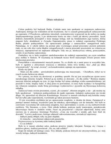 Dłuto młodości Celem podróży był budynek Radia. Czekało mnie tam spotkanie ze znajomym radiowcem, Andrzejem, którego nie widziałem od lat trzydziestu. Już w czasach gimnazjalnych zafascynowało go esperanto. Z Pruszkowa, gdzieśmy mieszkali, systematycznie wyprawiał się do stolicy na naukę międzynarodowego języka, a po ukończeniu kursu on sam z kolei jął takowy prowadzić. Język doktora Zamenhofa przesądził o losie mojego kolegi, stał się fundamentem jego kariery, której etapami były: działalność w Związku Esperantystów, praca w redakcji esperanckiej Polskiego Radia, pisanie podręczników. Do opracowania jednego z samouczków zaangażował mnie. Pamiętając, że w szkole dałem się poznać jako wyzierający ponad przeciętny poziom polonista (taki, co nie robi zbyt wielu błędów ortograficznych i stawia przecinki przeważnie we właściwym miejscu), zaproponował mi napisanie dialogów. Gdy mu je, ukończywszy robotę, przeczytałem, orzekł, iż jest bardzo zadowolony. Znalazłszy się w holu rozgłośni zatelefonowałem do redakcji esperanckiej, po czym usiadłem przy stoliku w bufecie. W trzymanej na kolanach teczce tkwił maszynopis świeżo przeze mnie ukończonej powieści. Pomyślałem o niezmienności naszych postaw. To, co działo się z nami przez te wszystkie lata, było w zgodzie z aforyzmem wieszcza o młodości, która trwa krótko, lecz „ślad jej dłuta wiecznotrwały”. Ja wciąż „tworzę”, on konsekwentnie zajmuje się esperantem. Kiedy się zjawił: – Mam coś dla ciebie – powiedziałem podsuwając mu maszynopis. – Chciałbym, żebyś na to rzucił swoim fachowym okiem. No i proszę, on może się skwitować w podobny sposób. On też jest szczęśliwym ojcem nowo narodzonego dziecka: książki. Położył ją na stoliku ze słowami: „To dla ciebie.” Różnica między naszymi dziećmi polegała na tym, że jego brzdąc był mimo młodego wieku usamodzielniony, już poszedł w świat, między ludzi. A chcę przez to powiedzieć, iż rzecz była wydana i to bynajmniej nie własnym sumptem; miała firmę poważnego wydawnictwa i pyszniła się błyszczącą kolorową okładką. Zaskoczył mnie swoim prezentem, czymś „do czytania”, zbiorem anegdot, a nie – jak można się było spodziewać – kolejnym podręcznikiem do nauki esperanta. Jednakże zaskoczenie nie trwało długo. Ot, sprawdzał się aforyzm Krasińskiego. Przecież w murach szkolnych mój koleżka znany był nie tylko jako esperantysta, wyróżniało go także poczucie humoru. O tym wszystkim myślałem już po opuszczeniu rozgłośni, w drodze do domu. Zamajaczył w pamięci tamten Andrzej, trzydzieści parę lat młodszy, opowiadający coś do śmiechu. Nie było to cytowanie wyczytanej lub zasłyszanej anegdoty, lecz opowiadanie o czymś, co się zaobserwowało osobiście. Nie literatura, a życie. Otóż młoda kobieta, podczas jazdy tramwajem, potraktowała lekceważąco faceta w średnim wieku. Facet się przystawiał i usłyszał odpowiedź, której sens zawiera się w piosence Jeremiego Przybory: „Czas się wycofać z arenki, gdy kusi fotel do drzemki.” Leciwy podrywacz, którego zdatność zakwestionowano, oświadczył zaperzony: – Jakbym panią obłapił, toby się pani sfajdała. – Ze śmiechu – natychmiast odparowała pasażerka. Przytoczywszy tę wymianę zdań Andrzej dodał: – Co za refleks! Było to w naszej szkolnej salce, podczas przerwy między lekcjami. Śmiejąc się i kręcąc z podziwu głową Andrzej powtarzał: „No, no, taki refleks!” Kupa lat minęła od tamtego czasu. Trzy dekady, podczas których nie utrzymywaliśmy, ja i mój wesoły kolega, żadnych kontaktów. Sięgnąwszy po opatrzone znajomym imieniem i nazwiskiem dziełko, zacząłem czytać. Nie powiem, aby mi autor zaimponował. To, co trzymałem w ręku, było kompilacją anegdot starych jak świat, porcją humoru mocno zwietrzałego. Znowu natknąłem się na anegdotę o kompozytorze Antonie Brucknerze, łatwo tracącym głowę w obecności płci pięknej. Usłyszawszy: „Mistrzu, to dla pana założyłam tę suknię”, wielki symfonik odpowiedział: „Skoro o mnie chodzi, to mogłaby pani niczego na siebie nie zakładać.” Od dawna po pismach muzycznych pęta się ta dykteryjka. Andrzej wyobrażający sobie, że będzie pierwszym, który mnie nią zabawi, grubo się mylił. Co najmniej dwóch innych autorów, a raczej kompilatorów, było przed nim. Pomyślałem, że jeśli jeszcze raz wpadnie mi w ręce zbiorek z opowiastką o nieśmiałym wobec kobiet i wskutek tego popełniającym gafę austriackim muzyku, to chyba puszczę pawia. Przekartkowałem od deski do deski podarowany mi „bestseller”. Nie ulegało wątpliwości, że wszystkie zawarte w nim przypowiastki były bezceremonialnie przepisane z innych podobnych zestawów. Żadna nie była płodem człowieka, którego nazwisko widniało na okładce i karcie tytułowej. Anegdoty o pasażerce tramwaju, tej, co się popisała szybkim refleksem, nie znalazłem. Owa scenka, której świadkiem był Andrzej, została przezeń zlekceważona albo zapomniana. A szkoda. Gdyby kolekcjoner facecji i tę zamieścił, miałby coś własnego. Do księgi mojego koleżki, napisanej właściwie przez innych, trafiłoby przynajmniej kilka zdań będących jego tworem. Wśród tysiąca obcych kawałków jeden kawałek swojski. Tylko jeden, atoli lepszy rydz jak nic. Domek ciasny, ale własny. Podczas gdy strojenie się w cudze piórka... – stop. Łapię się na tym, że sam z kolei zacząłem układać antologię – zbieraninę wyświechtanych porzekadeł.