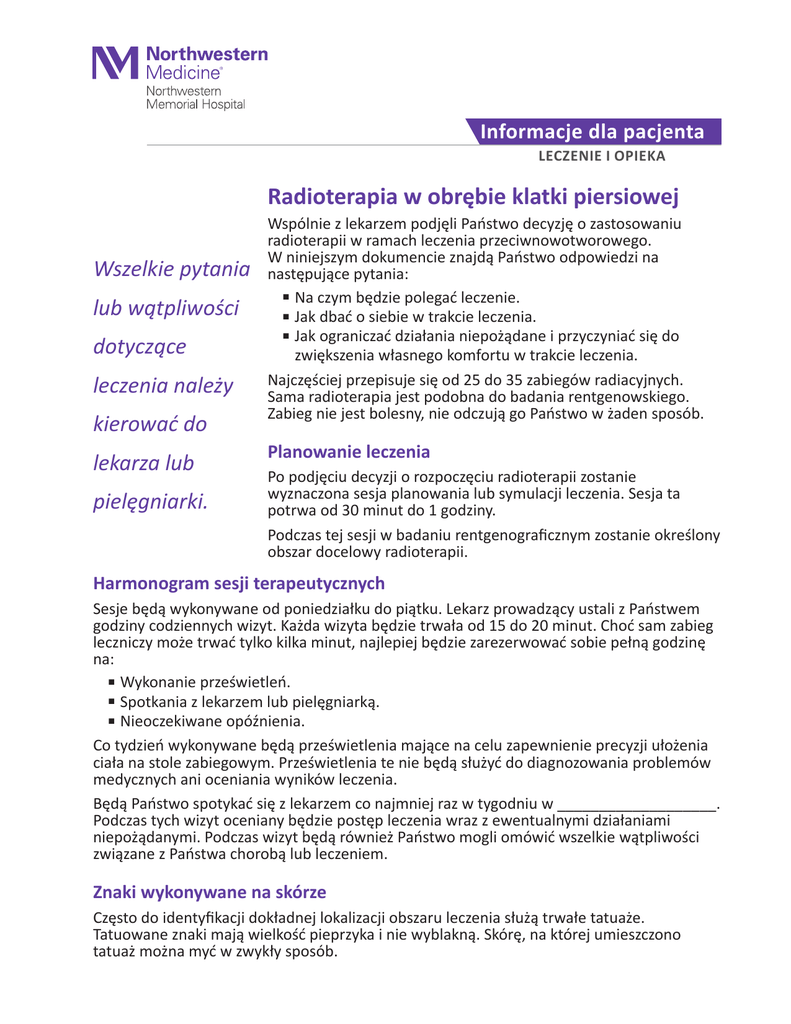 Informacje dla pacjenta LECZENIE I OPIEKA Radioterapia w obrębie klatki piersiowej Wszelkie pytania lub wątpliwości dotyczące leczenia należy kierować do lekarza lub pielęgniarki. Wspólnie z lekarzem podjęli Państwo decyzję o zastosowaniu radioterapii w ramach leczenia przeciwnowotworowego. W niniejszym dokumencie znajdą Państwo odpowiedzi na następujące pytania: ■ Na czym będzie polegać leczenie. ■ Jak dbać o siebie w trakcie leczenia. ■ Jak ograniczać działania niepożądane i przyczyniać się do zwiększenia własnego komfortu w trakcie leczenia. Najczęściej przepisuje się od 25 do 35 zabiegów radiacyjnych. Sama radioterapia jest podobna do badania rentgenowskiego. Zabieg nie jest bolesny, nie odczują go Państwo w żaden sposób. Planowanie leczenia Po podjęciu decyzji o rozpoczęciu radioterapii zostanie wyznaczona sesja planowania lub symulacji leczenia. Sesja ta potrwa od 30 minut do 1 godziny. Podczas tej sesji w badaniu rentgenograficznym zostanie określony obszar docelowy radioterapii. Harmonogram sesji terapeutycznych Sesje będą wykonywane od poniedziałku do piątku. Lekarz prowadzący ustali z Państwem godziny codziennych wizyt. Każda wizyta będzie trwała od 15 do 20 minut. Choć sam zabieg leczniczy może trwać tylko kilka minut, najlepiej będzie zarezerwować sobie pełną godzinę na: ■ Wykonanie prześwietleń. ■ Spotkania z lekarzem lub pielęgniarką. ■ Nieoczekiwane opóźnienia. Co tydzień wykonywane będą prześwietlenia mające na celu zapewnienie precyzji ułożenia ciała na stole zabiegowym. Prześwietlenia te nie będą służyć do diagnozowania problemów medycznych ani oceniania wyników leczenia. Będą Państwo spotykać się z lekarzem co najmniej raz w tygodniu w ___________________. Podczas tych wizyt oceniany będzie postęp leczenia wraz z ewentualnymi działaniami niepożądanymi. Podczas wizyt będą również Państwo mogli omówić wszelkie wątpliwości związane z Państwa chorobą lub leczeniem. Znaki wykonywane na skórze Często do identyfikacji dokładnej lokalizacji obszaru leczenia służą trwałe tatuaże. Tatuowane znaki mają wielkość pieprzyka i nie wyblakną. Skórę, na której umieszczono tatuaż można myć w zwykły sposób. Niekiedy znaki na skórze wykonywane są przy użyciu markera. W celu zapobieżenia zanikowi tych znaków nad miejscem ich umieszczenia może zostać przyklejony przezroczysty plaster. Nie należy zdejmować tego plastra ani usuwać wykonanych na skórze znaków. Należy uważać, aby nie zmyć wykonanych na skórze znaków podczas mycia. Jeśli znaki zaczną blaknąć, należy poinformować o tym lekarza. Nie należy próbować samodzielnie odtwarzać znaków. W przypadku alergii na plaster należy poinformować o niej lekarza lub pielęgniarkę. Częste działania niepożądane Terapia radiacyjna jest leczeniem swoistym. W związku z tym mogą Państwo oczekiwać działań niepożądanych wyłącznie w obszarze objętym leczeniem. Działania niepożądane mogą mieć charakter akumulacyjny. Oznacza to, że początkowo mogą Państwo nie odczuwać danych działań, ale będą one rozwijać się w miarę kolejnych sesji terapeutycznych. Wystąpienia większości wymienionych poniżej działań niepożądanych można oczekiwać po odbyciu około 10-15 sesji radioterapii. Po zakończeniu całej terapii działania niepożądane mogą pogarszać się przez pierwsze 5 dni. Po upływie pierwszych 5 dni rozpocznie się proces gojenia i zaczną Państwo stopniowo czuć się lepiej. Większość działań niepożądanych ustępuje po upływie około 2 tygodni po ostatniej sesji terapii. Kaszel Napromieniowywanie klatki piersiowej może podrażniać błonę śluzową dróg oddechowych. W konsekwencji u pacjentów może wystąpić: ■ Uporczywy, suchy kaszel. ■ Kaszel z odkrztuszaniem dużej ilości śluzu lub flegmy. W przypadku odkrztuszania dużych ilości śluzu należy unikać spożywania bardzo zimnych pokarmów lub napojów, ponieważ mogłoby to powodować pogorszenie objawów. Należy poinformować lekarza lub pielęgniarkę o wystąpieniu kaszlu uniemożliwiającego sen w nocy lub zakłócającego zwykłe wykonywane czynności. W wielu przypadkach lekarz może przepisać lek pomagający łagodzić kaszel. Jest bardzo ważne, aby poinformować lekarza lub pielęgniarkę, jeśli w odkrztuszanej plwocinie zauważy się ślady krwi. Zmiany skórne Podczas radioterapii mogą wystąpić zmiany na skórze klatki piersiowej i pleców. Skóra w obszarze leczenia może wysychać i ulegać złuszczaniu. Ewentualnie może dojść do ciemniejszego przebarwienia lub zaczerwienienia i podrażnienia. Aby złagodzić uczucie dyskomfortu i chronić skórę przed dalszym podrażnieniem, należy postępować zgodnie z poniższymi wskazówkami: ■ Czyścić obszar mydłem do skóry wrażliwej. Sugerowane mydła to np.: Basis® do skóry wrażliwej, Dove® do skóry wrażliwej lub Neutrogena® bezzapachowe. Należy unikać mydeł silnie perfumowanych lub antybakteryjnych. ■ Zmywać letnią wodą. Gorąca woda może drażnić skórę. ■ Delikatnie umyć obszar bardzo miękką ściereczką lub dłonią. ■ Osuszyć skórę poprzez dociskanie ręcznika; nie pocierać. ■ Nie należy golić włosów z leczonych obszarów. ■ W obszarze nie należy stosować poduszek rozgrzewających ani zimnych okładów. Wysokie lub niskie temperatury mogą nasilać uszkodzenia skóry. ■ Używać odzieży z bawełny lub innych miękkich dzianin. Niektóre włókna, na przykład wełna, mogą wywoływać podrażnienia. 2 W przypadku zaniepokojenia zmianami na skórze należy omówić ten problem z lekarzem lub pielęgniarką. Lekarz lub pielęgniarka może również zasugerować specjalny krem wspomagający nawilżenie skóry w obszarze leczenia, taki jak Remedy® Skin Repair. Kremu tego nie należy nanosić na skórę na 2 godziny przed zabiegiem, ponieważ zwiększyłoby to jej wrażliw