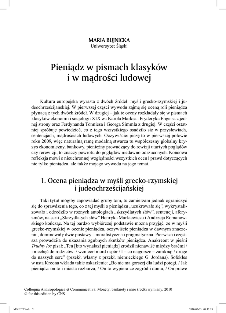 MARIA BUJNICKA Uniwersytet Œl¹ski Pieni¹dz w pismach klasyków i w m¹droœci ludowej Kultura europejska wyrasta z dwóch źródeł: myśli grecko-rzymskiej i judeochrześcijańskiej. W pierwszej części wywodu zajmę się oceną roli pieniądza płynącą z tych dwóch źródeł. W drugiej – jak te oceny rozkładały się w pismach klasyków ekonomii i socjologii XIX w.: Karola Marksa i Fryderyka Engelsa z jednej strony oraz Ferdynanda Tönniesa i Georga Simmla z drugiej. W części ostatniej spróbuję powiedzieć, co z tego wszystkiego osadziło się w przysłowiach, sentencjach, mądrościach ludowych. Oczywiście: piszę to w pierwszej połowie roku 2009, więc naturalną ramę modalną stwarza tu współczesny globalny kryzys ekonomiczny, bankowy, pieniężny prowadzący do rewizji utartych poglądów czy rerewizji, to znaczy powrotu do poglądów niedawno odrzuconych. Końcowa refleksja mówi o nieuchronnej względności wszystkich ocen i prawd dotyczących nie tylko pieniądza, ale także mojego wywodu na jego temat. 1. Ocena pieni¹dza w myœli grecko-rzymskiej i judeochrzeœcijañskiej Taki tytuł mógłby zapowiadać gruby tom, tu zamierzam jednak ograniczyć się do sprawdzenia tego, co z tej myśli o pieniądzu „ucukrowało się”, wykrystalizowało i odcedziło w różnych antologiach „skrzydlatych słów”, sentencji, aforyzmów, na serii „Skrzydlatych słów” Henryka Markiewicza i Andrzeja Romanowskiego kończąc. Na tej bardzo wybiórczej podstawie można przyjąć, że w myśli grecko-rzymskiej w ocenie pieniądza, oczywiście pieniądza w dawnym znaczeniu, dominowały dwie postawy – moralistyczna i pragmatyczna. Pierwsza i częstsza prowadziła do ukazania zgubnych skutków pieniądza. Anakreont w pieśni Trudny los pisał: „Ten [kto wynalazł pieniądz] zrodził nienawiść między braćmi / i niechęć do rodziców: / wzniecił mord i spór / I – co najgorsze – zamknął / drogę do naszych serc” (przekł. własny z przekł. niemieckiego G. Jordana). Sofokles w usta Kreona wkłada takie oskarżenie: „Bo nie ma gorszej dla ludzi potęgi, / Jak pieniądz: on to i miasta rozburza, / On to wypiera ze zagród i domu, / On prawe Colloquia Anthropologica et Communicativa: Monety, banknoty i inne środki wymiany, 2010 © for this edition by CNS MONETY.indb 51 2010-05-05 09:12:13 52 MARIA BUJNICKA dusze krzywi i popycha / Do szpetnych kroków i nieprawych czynów. / Zbrodni on wszelkiej ludzkości jest mistrzem / I drogowskazem we wszelkiej sromocie” (przeł. K. Morawski). Nie inaczej jest u Rzymian. Horacy w satyrze Hoc quoque, Tiresia (ks. 2, 5, 8) tak każe mówić Odysowi pozbawionemu całego majątku przez zalotników: „Ród, cnota bez majątku mniej od morskiej trawy znaczą” (przekład tego i pozostałych fragmentów Horacego – S. Gołębiowski). W liście Prima dicte mihi (ks. 1, 1), będącym wykładem nauk moralnych starzejącego się autora, powie podobnie: „Pieniądze, o rodacy, Kwiryci, są pierwsze, po nich dopiero cnota”. Tamże w liście szóstym pisze, że za pieniądze wszystko można kupić: „Przyjaźń, kredyt, posażną żonę, znakomity / ród, urodę król Pieniądz gotuje dla ciebie”. Ale u Rzymian rodzi się też pojęcie i ocena pieniądza jako abstrakcyjnego czynnika rządzącego światem – na przykład w tym powiedzeniu cesarza Wespazjana przytoczonym przez Swetoniusza – „pieniądz nie cuchnie” – jest jednaki czy to z opłat za kloaki, czy z uprawy winnic. Publiusz Cyrus wręcz hiperbolizuje jego moc: „Tylko pieniądz jest władcą całego świata”. Także w pismach Cycerona pieniądz jawi się już jako nerw rzeczy, sprężyna rzeczy – nervus rerum. W kulturze judeochrześcijańskiej pieniądz inaczej oceniany jest w Starym Testamencie, inaczej w Nowym. W Starym Testamencie bogactwo jest wyrazem opieki boskiej nad wiernym i nagrodą za pobożność (historia Abrahama, Izaaka, Jakuba)1. Skłoniło to Georga Simmla, autora jednego z pierwszych traktatów filozoficzno-socjologicznych, do określenia szczególnego stosunku między Żydem, Bogiem i pieniądzem. W wynaturzonej relacji pieniądz stał się celem: Wrodzone usposobienie narodu od tysiącleci przywykłego do wznoszenia wzroku ku Najwyższej Istocie, do umieszczania w niej – w szczególności dlatego, że posiadała ona jedynie bardzo względną transcendencję – ostatecznego celu i punktu zbiegania się wszelkich konkretnych spraw – musiało w obszarze ekonomicznym skłaniać do oddania się tej wartości, która ofiarowuje się jako spajająca jedność oraz punkt komunikacji wszelkich szeregów celowościowych 2. O ile więc przekaz Starego Testamentu streścić można hasłem: „Bóg ubogaca swoich wiernych”, to przekaz Nowego Testamentu zawiera się w haśle – „Bóg albo pieniądz” (tak brzmią tytuły akapitów w Słowniku teologii biblijnej, s. 88–89). To hasło najlepiej wyrażają powszechnie znane cytaty z Ewangelii św. Mateusza: „Nikt nie może dwom panom służyć [...] Nie możecie Bogu służyć i Mamonie” (6, 24) lub św. Łukasza „nikt z was, kto nie wyrzeka się wszystkiego, co posiada, nie może być moim uczniem” (Łk 14, 33) i – na koniec najpowszechniej znane: „łatwiej jest przejść wielbłądowi przez ucho igielne niż bogatemu wejść do Królestwa Niebieskiego” (Mt 19, 23). W parze z tymi naukami szły inne nakazy: „darmo otrzymaliście, darmo dawajcie!” (Mt 10, 8–9), „Sprzedajcie wasze mienie i dajcie jałmużnę” (Łk 12, 1 2 Zob. bogactwo, [hasło w:] Słownik teologii biblijnej, red. X. Leon-Dufour, Poznań 1985. G. Simmel, Filozofia pieniądza, przekł. i posł. A. Przyłębski, Poznań 1997, s. 208. Colloquia Anthropologica et Communicativa: Monety, banknoty i inne środki wymiany, 2010 © for this edition by CNS MONETY.indb 52 2010-05-05 09:12:13 Pieni¹dz w pismach klasyków i w m¹droœci ludowej 53 33), „Idź, sprzedaj wszystko co masz, i rozdaj ubogim