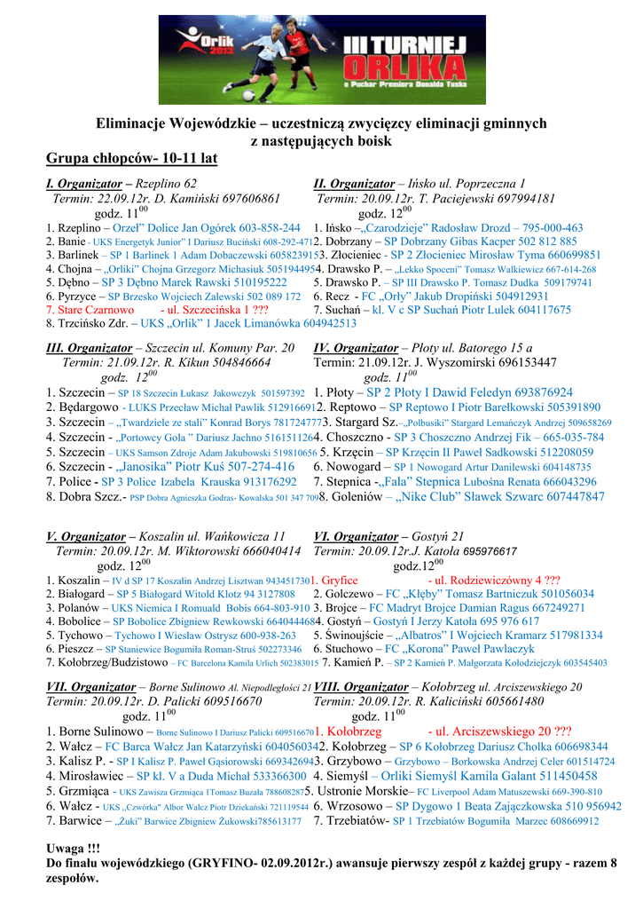 Eliminacje Wojewódzkie – uczestniczą zwycięzcy eliminacji gminnych z następujących boisk Grupa chłopców- 10-11 lat I. Organizator – Rzeplino 62 Termin: 22.09.12r. D. Kamiński 697606861 godz. 1100 II. Organizator – Ińsko ul. Poprzeczna 1 Termin: 20.09.12r. T. Paciejewski 697994181 godz. 1200 1. Rzeplino – Orzeł” Dolice Jan Ogórek 603-858-244 1. Ińsko –„Czarodzieje” Radosław Drozd – 795-000-463 2. Banie - UKS Energetyk Junior” I Dariusz Buciński 608-292-4712. Dobrzany – SP Dobrzany Gibas Kacper 502 812 885 3. Barlinek – SP 1 Barlinek 1 Adam Dobaczewski 6058239153. Złocieniec - SP 2 Złocieniec Mirosław Tyma 660699851 4. Chojna – „Orliki” Chojna Grzegorz Michasiuk 5051944954. Drawsko P. – „Lekko Spoceni” Tomasz Walkiewicz 667-614-268 5. Dębno – SP 3 Dębno Marek Rawski 510195222 5. Drawsko P. – SP III Drawsko P. Tomasz Dudka 509179741 6. Pyrzyce – SP Brzesko Wojciech Zalewski 502 089 172 6. Recz - FC „Orły” Jakub Dropiński 504912931 7. Stare Czarnowo - ul. Szczecińska 1 ??? 7. Suchań – kl. V c SP Suchań Piotr Lulek 604117675 8. Trzcińsko Zdr. – UKS „Orlik” 1 Jacek Limanówka 604942513 III. Organizator – Szczecin ul. Komuny Par. 20 IV. Organizator – Płoty ul. Batorego 15 a Termin: 21.09.12r. R. Kikun 504846664 Termin: 21.09.12r. J. Wyszomirski 696153447 00 godz. 12 godz. 1100 1. Szczecin – SP 18 Szczecin Łukasz Jakowczyk 501597392 1. Płoty – SP 2 Płoty I Dawid Feledyn 693876924 2. Będargowo - LUKS Przecław Michał Pawlik 5129166912. Reptowo – SP Reptowo I Piotr Barełkowski 505391890 3. Szczecin – „Twardziele ze stali” Konrad Borys 7817247773. Stargard Sz.–„Polbusiki” Stargard Lemańczyk Andrzej 509658269 4. Szczecin - „Portowcy Gola ” Dariusz Jachno 5161511264. Choszczno - SP 3 Choszczno Andrzej Fik – 665-035-784 5. Szczecin – UKS Samson Zdroje Adam Jakubowski 519810656 5. Krzęcin – SP Krzęcin II Paweł Sadkowski 512208059 6. Szczecin - „Janosika” Piotr Kuś 507-274-416 6. Nowogard – SP 1 Nowogard Artur Danilewski 604148735 7. Police - SP 3 Police Izabela Krauska 913176292 7. Stepnica -„Fala” Stepnica Lubośna Renata 666043296 8. Dobra Szcz.- PSP Dobra Agnieszka Godras- Kowalska 501 347 7098. Goleniów – „Nike Club” Sławek Szwarc 607447847 V. Organizator – Koszalin ul. Wańkowicza 11 VI. Organizator – Gostyń 21 Termin: 20.09.12r. M. Wiktorowski 666040414 Termin: 20.09.12r.J. Katoła 695976617 godz. 1200 godz.1200 1. Koszalin – IV d SP 17 Koszalin Andrzej Lisztwan 9434517301. Gryfice - ul. Rodziewiczówny 4 ??? 2. Białogard – SP 5 Białogard Witold Klotz 94 3127808 2. Golczewo – FC „Kłęby” Tomasz Bartniczuk 501056034 3. Polanów – UKS Niemica I Romuald Bobis 664-803-910 3. Brojce – FC Madryt Brojce Damian Ragus 667249271 4. Bobolice – SP Bobolice Zbigniew Rewkowski 6640444684. Gostyń – Gostyń I Jerzy Katoła 695 976 617 5. Tychowo – Tychowo I Wiesław Ostrysz 600-938-263 5. Świnoujście – „Albatros” I Wojciech Kramarz 517981334 6. Pieszcz – SP Staniewice Bogumiła Roman-Struś 502273346 6. Stuchowo – FC „Korona” Paweł Pawlaczyk 7. Kołobrzeg/Budzistowo – FC Barcelona Kamila Urlich 502383015 7. Kamień P. – SP 2 Kamień P. Małgorzata Kołodziejczyk 603545403 VII. Organizator – Borne Sulinowo Al. Niepodległości 21 VIII. Organizator – Kołobrzeg ul. Arciszewskiego 20 Termin: 20.09.12r. D. Palicki 609516670 Termin: 20.09.12r. R. Kaliciński 605661480 godz. 1100 godz. 1100 1. Borne Sulinowo – Borne Sulinowo I Dariusz Palicki 6095166701. Kołobrzeg - ul. Arciszewskiego 20 ??? 2. Wałcz – FC Barca Wałcz Jan Katarzyński 6040560342. Kołobrzeg – SP 6 Kołobrzeg Dariusz Cholka 606698344 3. Kalisz P. - SP I Kalisz P. Paweł Gąsiorowski 6693426943. Grzybowo – Grzybowo – Borkowska Andrzej Celer 601514724 4. Mirosławiec – SP kl. V a Duda Michał 533366300 4. Siemyśl – Orliki Siemyśl Kamila Galant 511450458 5. Grzmiąca - UKS Zawisza Grzmiąca 1Tomasz Buzała 7886082875. Ustronie Morskie– FC Liverpool Adam Matuszewski 669-390-810 6. Wałcz - UKS ,,Czwórka" Albor Wałcz Piotr Dziekański 721119544 6. Wrzosowo – SP Dygowo 1 Beata Zajączkowska 510 956942 7. Barwice – „Żuki” Barwice Zbigniew Żukowski785613177 7. Trzebiatów- SP 1 Trzebiatów Bogumiła Marzec 608669912 Uwaga !!! Do finału wojewódzkiego (GRYFINO- 02.09.2012r.) awansuje pierwszy zespół z każdej grupy - razem 8 zespołów.