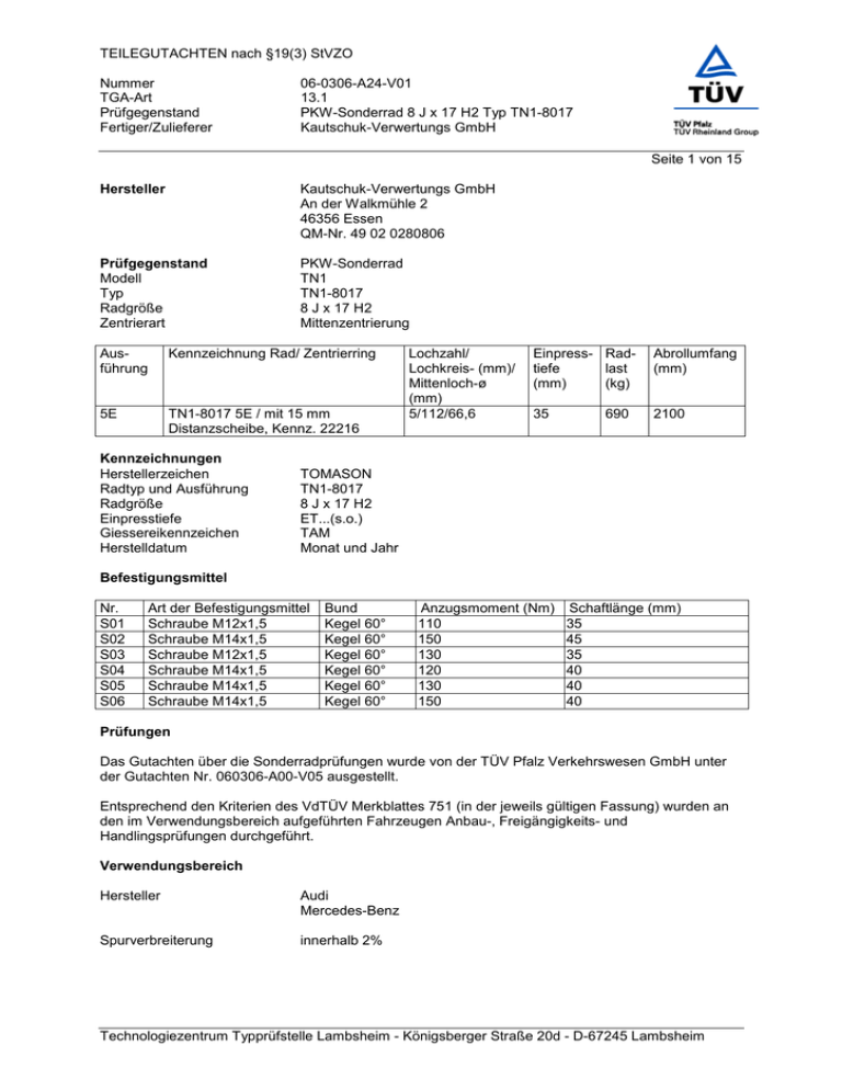 TEILEGUTACHTEN nach §19(3) StVZO Nummer TGA-Art Prüfgegenstand Fertiger/Zulieferer 06-0306-A24-V01 13.1 PKW-Sonderrad 8 J x 17 H2 Typ TN1-8017 Kautschuk-Verwertungs GmbH Seite 1 von 15 Hersteller Kautschuk-Verwertungs GmbH An der Walkmühle 2 46356 Essen QM-Nr. 49 02 0280806 Prüfgegenstand Modell Typ Radgröße Zentrierart PKW-Sonderrad TN1 TN1-8017 8 J x 17 H2 Mittenzentrierung Ausführung Kennzeichnung Rad/ Zentrierring 5E TN1-8017 5E / mit 15 mm Distanzscheibe, Kennz. 22216 Kennzeichnungen Herstellerzeichen Radtyp und Ausführung Radgröße Einpresstiefe Giessereikennzeichen Herstelldatum Lochzahl/ Lochkreis- (mm)/ Mittenloch-ø (mm) 5/112/66,6 Einpress- Radtiefe last (mm) (kg) Abrollumfang (mm) 35 2100 690 TOMASON TN1-8017 8 J x 17 H2 ET...(s.o.) TAM Monat und Jahr Befestigungsmittel Nr. S01 S02 S03 S04 S05 S06 Art der Befestigungsmittel Schraube M12x1,5 Schraube M14x1,5 Schraube M12x1,5 Schraube M14x1,5 Schraube M14x1,5 Schraube M14x1,5 Bund Kegel 60° Kegel 60° Kegel 60° Kegel 60° Kegel 60° Kegel 60° Anzugsmoment (Nm) 110 150 130 120 130 150 Schaftlänge (mm) 35 45 35 40 40 40 Prüfungen Das Gutachten über die Sonderradprüfungen wurde von der TÜV Pfalz Verkehrswesen GmbH unter der Gutachten Nr. 060306-A00-V05 ausgestellt. Entsprechend den Kriterien des VdTÜV Merkblattes 751 (in der jeweils gültigen Fassung) wurden an den im Verwendungsbereich aufgeführten Fahrzeugen Anbau-, Freigängigkeits- und Handlingsprüfungen durchgeführt. Verwendungsbereich Hersteller Audi Mercedes-Benz Spurverbreiterung innerhalb 2% Technologiezentrum Typprüfstelle Lambsheim - Königsberger Straße 20d - D-67245 Lambsheim TEILEGUTACHTEN nach §19(3) StVZO Nummer TGA-Art Prüfgegenstand Fertiger/Zulieferer 06-0306-A24-V01 13.1 PKW-Sonderrad 8 J x 17 H2 Typ TN1-8017 Kautschuk-Verwertungs GmbH Seite 2 von 15 Handelsbezeichnung Fahrzeug-Typ ABE/EWG-Nr. Audi A4 B8, B81 e1*2001/116*0430*..; e13*2007/46*1084*.. kW-Bereich Reifen Reifenbezogene Auflagen und Hinweise Auflagen und Hinweise 88-195 88-195 88-195 88-195 88-195 100-195 100-195 100-195 100-195 100-195 225/50R17 235/45R17 235/50R17 245/45R17 255/45R17 225/50R17 235/45R17 235/50R17 245/45R17 255/45R17 K1c K2b K56 K1c K2b K41 K44 K45 K46 K56 K1c K2b K56 K1c K2b K41 K44 K45 K46 K56 A13 R37 A13 R37 A12 R37 A12 A12 A02 A04 A05 A06 A08 A09 A12 A14 A18 Car Lim V17 S04 100-230 100-230 100-230 100-230 225/55R17 235/55R17 245/50R17 255/50R17 A39 138 A12 138 A12 K1a K2b 138 A12 K1a K1b K2b K8b 138 Audi A7 Sportback 4G, 4G1 e1*2007/46*0436*..; e1*2007/46*0544*..; e13*2007/46*1147*.. Audi A8 4H e1*2007/46*0284*.. e1*2007/46*0398*.. 150-230 150-230 150-230 235/55R17 245/50R17 255/50R17 138 138 138 150-273 150-273 245/55R17 255/55R17 136 134 190 er 201 C750, /1, /2, /3 125-150 53-122 215/40R17 215/40R17 K41 K42 K1a K41 K42 A-Klasse 176 e1*2007/46*0928*.. 80-115 80-115 80-155 80-155 80-155 80-155 70-142 70-142 70-142 205/50R17 215/45R17 225/45R17 235/40R17 235/45R17 245/40R17 205/50R17 215/45R17 225/45R17 K1c K2c K4i K5d K6g K8h R70 K1c K2b K5d T87 T91 K1c K2c K4i K5d K6g K8h K1c K2c K4i K5d K5k K6h K7d K8m K1c K2c K4i K5d K5l K6h K7d K8m K2c K4i K6h K8m R03 K1c K2b K42 K43 K44 K56 R70 K1a K1b K2b K42 K44 K56 K1c K2b K42 K43 K44 K56 80-115 80-115 80-155 80-155 80-155 170 170 170 205/50R17 215/45R17 225/45R17 235/40R17 245/40R17 205/50R17 225/45R17 245/40R17 K1c K2c K4i K5c K8h R70 K1a K1b K2b T87 T91 K1c K2c K4i K5c K8h K1c K2c K4i K5c K8h K1c K2c K4i K5c K6k K7d K8m M+S R70 Audi A5 B8, B81 e1*2001/116*0430*..; e13*2007/46*1084*.. - Coupé, Cabrio - Sportback Audi A6 / A6 Avant 4G, 4G1 e1*2007/46*0436*..; e13*2007/46*1147*.. B-Klasse 245 e1*2001/116*0314*.. B-Klasse 246 e1*2007/46*0751*.. C 30 CDI AMG 203CL e1*98/14*0159*.. - Coupé R03 A02 A04 A05 A06 A08 A09 A14 A18 B03 Cbo Cpe Flh V17 S04 A02 A04 A05 A06 A08 A09 A14 A18 A57 Car Lim NA1 S04 A02 A04 A05 A06 A08 A09 A12 A14 A18 A57 S04 A02 A04 A05 A06 A08 A09 A12 A14 A18 A57 B03 NBF P38 S04 A02 A04 A05 A06 A08 A09 A12 A14 A18 R21 S01 A02 A04 A05 A06 A08 A09 A12 A14 A18 A58 Flh V17 S05 A02 A04 A05 A06 A08 A09 A12 A14 A18 K41 V17 S05 A02 A04 A05 A06 A08 A09 A12 A14 A18 A58 V17 S05 A02 A04 A05 A06 A08 A09 A12 A14 A18 Cpe V17 S01 Technologiezentrum Typprüfstelle Lambsheim - Königsberger Straße 20d - D-67245 Lambsheim TEILEGUTACHTEN nach §19(3) StVZO Nummer TGA-Art Prüfgegenstand Fertiger/Zulieferer Handelsbezeichnung Fahrzeug-Typ ABE/EWG-Nr. C 30cdi/ 32/ 55 AMG 203K e1*98/14*0158*.. - Kombi C 30cdi/ 32/ 55AMG 203 e1*98/14*0139*.. C 43 T-Modell 202 e1*93/81*0034*.. C-Klasse 203 e1*98/14*0139*.. C-Klasse 204 e1*2001/116*0431*.. - Limousine/Coupe - incl. Facelift 2011 C-Klasse HO G363, e1*92/53*0001*.. C-Klasse C36 HO G363, e1*92/53*0001*.. C-Klasse C43 HO e1*92/53*0001*.. C-Klasse Sportcoupé 203CL e1*98/14*0159*.. C-Klasse T-Modell 202 e1*93/81*0034*.. 06-0306-A24-V01 13.1 PKW-Sonderrad 8 J x 17 H2 Typ TN1-8017 Kautschuk-Verwertungs GmbH kW-Bereich Reifen Reifenbezogene Auflagen und Hinweise 170,260 170,260 170-270 170-270 170-270 170,260 170,260 170-270 170-270 170-270 225 225 225 225 75-170 75-170 75-170 75-200 75-200 88-215 88-215 88-225 88-225 88-225 88-225 55-145 55-145 55-145 55-145 55-145 206 206 206 206 225 225 225 225 75-160 75-160 75-160 75-200 75-200 55-145 55-145 55-145 55-145 55-145 225/45R17 245/40R17 205/50R17 215/45R17 225/45R17 225/45R17 245/40R17 205/50R17 215/45R17 225/45R17 215/45R17 225/45R17 225/45R17 245/40R17 205/50R17 215/45R17 235/40R17 225/45R17 245/40R17 205/50R17 215/45R17 225/45R17 235/40R17 235/45R17 245/40R17 205/50R17 215/45R17 225/45R17 235/40R17 245/40R17 215/45R17 225/45R17 225/45R17 245/40R17 215/45R17 225/45R17 225/45R17 245/40R17 205/50R17 215/45R17 235/40R17 225/45R17 245/40R17 205/50R17 215/45R17 225/45R17 235/40R17 245/40R17 R35 R03 R35 M+S R70 M+S T88 T91 M+S R35 R03 R35 M+S R70 M+S T87 T88 M+S M+S R09 K41 K42 K56 M+S K41 K42 K56 R35 K42 K46 K56 R03 R37 R70 R37 T87 T88 R03 R35 R03 K1c K2b K41 K42 K56 R37 R70 K1a K1b K2b K41 K42 K56 R37 K1c K2b K41 K42 K56 K1c K2b 