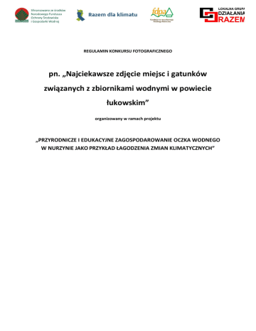 REALIZATORA REGULAMIN KONKURSU FOTOGRAFICZNEGO pn. „Najciekawsze zdjęcie miejsc i gatunków związanych z zbiornikami wodnymi w powiecie łukowskim” organizowany w ramach projektu „PRZYRODNICZE I EDUKACYJNE ZAGOSPODAROWANIE OCZKA WODNEGO W NURZYNIE JAKO PRZYKŁAD ŁAGODZENIA ZMIAN KLIMATYCZNYCH” §1 REALIZATORA Organizator konkursu 1. Organizatorem konkursu jest Stowarzyszenie Lokalna Grupa Działania "RAZEM KU LEPSZEJ PRZYSZŁOŚCI", zwany dalej „Organizatorem”.. 2. Nagrody pozyskane zostały na podstawie projektu dofinansowanego przez Narodowy Fundusz Ochrony Środowiska i Gospodarki Wodnej w ramach projektu „Razem dla klimatu” realizowanego przez Fundację na rzecz Rozwoju Polskiego Rolnictwa”. 3. Konkurs będzie przeprowadzany w okresie od września 2016 do października 2016. §2 Cel konkursu Celem konkursu jest: propagowanie wiedzy na temat znaczenia zbiorników wodnych dla zachowania bioróżnorodności i łagodzenia klimatu, budzenie zainteresowania przyrodą własnego regionu i dostrzeganie niezwykłych jej detali, rozwijanie wśród dzieci i młodzieży umiejętności obserwacji przyrody, jej dokumentowania, interpretacji oraz opisu, a także kształtowanie świadomości ekologicznej uczestników, zebranie informacji o ciekawych i interesujących miejscach retencji wody i gatunkach z nimi związanych do wykorzystania przez wnioskodawcę. §3 Przedmiot konkursu 1. Przedmiotem konkursu jest autorska fotografia. 2. Zdjęcia powinny zostać zrobione w obrębie powiatu łukowskiego, szczególnie terenów chronionych wraz z otulinami, takich jak: rezerwaty, obszary Natura 2000, lasy, łąki, oczka wodne i inne. §4 Uczestnicy konkursu 1. Konkurs jest skierowany do dzieci i młodzieży z powiatu łukowskiego. 2. W konkursie mogą wziąć udział dzieci szkół podstawowych, gimnazjalnych oraz ponadgimnazjalnych. 3. Konkurs odbywa się w dwóch kategoriach wiekowych: a. Szkoła podstawowa b. Gimnazjum i szkoła ponadgimnazjalna 4. Dla biorących udział w konkursie dzieci wymagana jest zgoda i podpis rodziców albo opiekunów, który należy złożyć na karcie zgłoszenia. §5 REALIZATORA Zasady udziału w konkursie 1. 2. 3. 4. 5. 6. 7. 8. 9. 10. 11. 12. 13. 14. Udział w konkursie jest dobrowolny. Fotografie powinny posiadać 1 autora. Zdjęcia powinny być wykonane samodzielnie przez Uczestnika konkursu. Wyklucza się prace tworzone wspólnie (współautorstwo). Nad pracami czuwa nauczyciel koordynujący pracę konkursową. Technika wykonania fotografii jest dowolna. Format wywołanej fotografii nie może być mniejszy niż 18x24 cm. O ile na fotografiach konkursowych znajduje się wizerunek człowieka, uczestnik przesyłając fotografię zapewnia, że osoba, której wizerunek znajduje się na fotografii wyraziła zgodę na nieodpłatną publikację tego wizerunku. Fotografie, na których będą znajdować się jakiekolwiek oznaczenia, cyfry (np. daty) będą dyskwalifikowane. Jedna osoba może zgłosić na konkurs 2 fotografie. Organizator nie zapewnia sprzętu fotograficznego. Udział w konkursie jest bezpłatny. Uczestnik konkursu może przesłać 2 fotografie w formie elektronicznej: e-mail lub inny nośnik, np. CD. Do prac prosimy załączyć dane kontaktowe (imię i nazwisko autora, e-mail szkoły). Adres e-mail do zgłoszeń drogą elektroniczną: [email protected] ; w temacie: Konkurs fotograficzny - najciekawsze zdjęcie miejsc i gatunków związanych ze zbiornikami wodnymi w powiecie łukowskim. Adres do zgłoszeń na płytach CD: LGD „RAZEM KU LEPSZEJ PRZYSZŁOŚCI”, 21-400 Łuków, ul. Świderska 12, z dopiskiem Konkurs fotograficzny – najciekawsze zdjęcie miejsc i gatunków związanych ze zbiornikami wodnymi w powiecie łukowskim. 15. Kartę zgłoszenia i regulamin konkursu wraz z dodatkowymi informacjami można uzyskać bezpośrednio w LGD „RAZEM KU LEPSZEJ PRZYSZŁOŚCI”, 21-400 Łuków, ul. Świderska 12, Tel. 25 798 24 39 lub na stronie www.lgdrazem.pl w zakładce PROJEKTY 16. Organizator nie odsyła zgłoszonych prac. §6 1. Prace, które nie będą spełniały kryteriów przedstawionych w Regulaminie nie zostaną zakwalifikowane do konkursu. 2. Do oceny złożonych prac zostanie powołane Jury, które przyzna najlepszym pracom nagrody (I, II i III miejsce oraz dwa wyróżnienia w dwóch kategoriach). Jedna osoba może zdobyć tylko jedną nagrodę w ramach całego konkursu. §7 Terminarz 1. Konkurs zostaje ogłoszony z dniem ukazania się regulaminu na stronie internetowej www.lgdrazem.pl 2. Prace konkursowe wraz z kartą zgłoszeniową należy składać do 24.10.2016 r. do godziny 12.00 w siedzibie LGD „RAZEM KU LEPSZEJ PRZYSZŁOŚCI” (liczy się data wpływu). 3. Prace dostarczone po terminie nie będą brały udziału w konkursie. REALIZATORA 4. Rozstrzygnięcie konkursu i ocena prac nastąpi w dniach 28-29.10.2016 r. Nagrodzone prace będą prezentowane na stronie internetowej LGD „RAZEM KU LEPSZEJ PRZYSZŁOŚCI” oraz profilu facebook. 5. Laureaci zostaną powiadomieni o terminie i miejscu wręczenia nagród drogą telefoniczną lub przez e-mail szkoły. §8 1. Udział w konkursie jest równoznaczny z akceptacją regulaminu oraz ze zgodą uczestnika na przetwarzanie jego danych osobowych zgodnie z przepisami ustawy z 29 sierpnia 1997r. o ochronie danych osobowych (tekst jednolity: Dz. U. z 2002 r. Nr 101, poz. 926 ze zm.). Dane osobowe uczestników konkursu będą chronione zgodnie z wymienioną ustawą. Uczestnikowi konkursu przysługuje prawo wglądu do swoich danych osobowych oraz ich poprawiania. Podanie danych jest dobrowolne, lecz ich brak uniemożliwia wzięcie udziału w konkursie. 2. Organizator informuje, iż dane osobowe laureata konkursu (imię i nazwisko, szkoła) zostaną opublikowane na stronie internetowej i profilu facebook LGD. W sprawie roszczeń wnoszonych przez osoby trzecie odpowiedzialność ponosi autor. 3. Laureat konkursu wyraża zgodę na nieodpłatne publikowanie przez organizatora konkursu nade