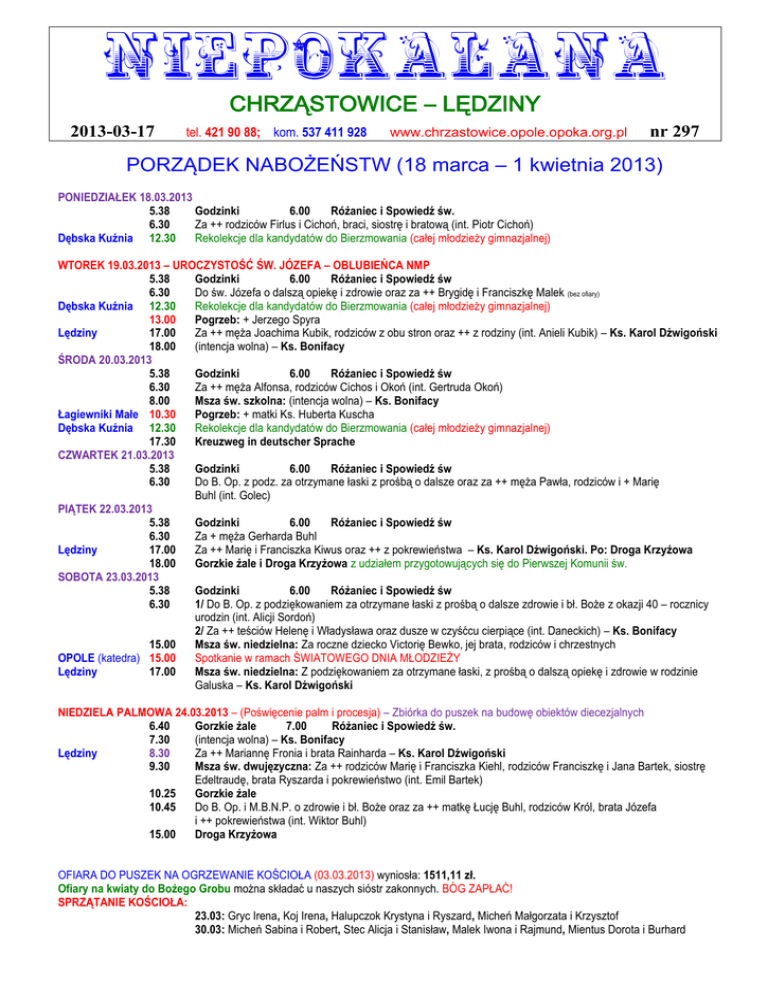 NIEPOKALANA CHRZĄSTOWICE – LĘDZINY 2013-03-17 tel. 421 90 88; kom. 537 411 928 www.chrzastowice.opole.opoka.org.pl nr 297 PORZĄDEK NABOŻEŃSTW (18 marca – 1 kwietnia 2013) PONIEDZIAŁEK 18.03.2013 5.38 Godzinki 6.00 Różaniec i Spowiedź św. 6.30 Za ++ rodziców Firlus i Cichoń, braci, siostrę i bratową (int. Piotr Cichoń) Dębska Kuźnia 12.30 Rekolekcje dla kandydatów do Bierzmowania (całej młodzieży gimnazjalnej) WTOREK 19.03.2013 – UROCZYSTOŚĆ ŚW. JÓZEFA – OBLUBIEŃCA NMP 5.38 Godzinki 6.00 Różaniec i Spowiedź św 6.30 Do św. Józefa o dalszą opiekę i zdrowie oraz za ++ Brygidę i Franciszkę Malek (bez ofiary) Dębska Kuźnia 12.30 Rekolekcje dla kandydatów do Bierzmowania (całej młodzieży gimnazjalnej) 13.00 Pogrzeb: + Jerzego Spyra Lędziny 17.00 Za ++ męża Joachima Kubik, rodziców z obu stron oraz ++ z rodziny (int. Anieli Kubik) – Ks. Karol Dźwigoński 18.00 (intencja wolna) – Ks. Bonifacy ŚRODA 20.03.2013 5.38 Godzinki 6.00 Różaniec i Spowiedź św 6.30 Za ++ męża Alfonsa, rodziców Cichos i Okoń (int. Gertruda Okoń) 8.00 Msza św. szkolna: (intencja wolna) – Ks. Bonifacy Łagiewniki Małe 10.30 Pogrzeb: + matki Ks. Huberta Kuscha Dębska Kuźnia 12.30 Rekolekcje dla kandydatów do Bierzmowania (całej młodzieży gimnazjalnej) 17.30 Kreuzweg in deutscher Sprache CZWARTEK 21.03.2013 5.38 Godzinki 6.00 Różaniec i Spowiedź św 6.30 Do B. Op. z podz. za otrzymane łaski z prośbą o dalsze oraz za ++ męża Pawła, rodziców i + Marię Buhl (int. Golec) PIĄTEK 22.03.2013 5.38 Godzinki 6.00 Różaniec i Spowiedź św 6.30 Za + męża Gerharda Buhl Lędziny 17.00 Za ++ Marię i Franciszka Kiwus oraz ++ z pokrewieństwa – Ks. Karol Dźwigoński. Po: Droga Krzyżowa 18.00 Gorzkie żale i Droga Krzyżowa z udziałem przygotowujących się do Pierwszej Komunii św. SOBOTA 23.03.2013 5.38 Godzinki 6.00 Różaniec i Spowiedź św 6.30 1/ Do B. Op. z podziękowaniem za otrzymane łaski z prośbą o dalsze zdrowie i bł. Boże z okazji 40 – rocznicy urodzin (int. Alicji Sordoń) 2/ Za ++ teściów Helenę i Władysława oraz dusze w czyśćcu cierpiące (int. Daneckich) – Ks. Bonifacy 15.00 Msza św. niedzielna: Za roczne dziecko Victorię Bewko, jej brata, rodziców i chrzestnych OPOLE (katedra) 15.00 Spotkanie w ramach ŚWIATOWEGO DNIA MŁODZIEŻY Lędziny 17.00 Msza św. niedzielna: Z podziękowaniem za otrzymane łaski, z prośbą o dalszą opiekę i zdrowie w rodzinie Galuska – Ks. Karol Dźwigoński NIEDZIELA PALMOWA 24.03.2013 – (Poświęcenie palm i procesja) – Zbiórka do puszek na budowę obiektów diecezjalnych 6.40 Gorzkie żale 7.00 Różaniec i Spowiedź św. 7.30 (intencja wolna) – Ks. Bonifacy Lędziny 8.30 Za ++ Mariannę Fronia i brata Rainharda – Ks. Karol Dźwigoński 9.30 Msza św. dwujęzyczna: Za ++ rodziców Marię i Franciszka Kiehl, rodziców Franciszkę i Jana Bartek, siostrę Edeltraudę, brata Ryszarda i pokrewieństwo (int. Emil Bartek) 10.25 Gorzkie żale 10.45 Do B. Op. i M.B.N.P. o zdrowie i bł. Boże oraz za ++ matkę Łucję Buhl, rodziców Król, brata Józefa i ++ pokrewieństwa (int. Wiktor Buhl) 15.00 Droga Krzyżowa OFIARA DO PUSZEK NA OGRZEWANIE KOŚCIOŁA (03.03.2013) wyniosła: 1511,11 zł. Ofiary na kwiaty do Bożego Grobu można składać u naszych sióstr zakonnych. BÓG ZAPŁAĆ! SPRZĄTANIE KOŚCIOŁA: 23.03: Gryc Irena, Koj Irena, Halupczok Krystyna i Ryszard, Micheń Małgorzata i Krzysztof 30.03: Micheń Sabina i Robert, Stec Alicja i Stanisław, Malek Iwona i Rajmund, Mientus Dorota i Burhard WSZYSTKIM PARAFIANOM, GOŚCIOM I INTERNAUTOM ŻYCZYMY BŁOGOSŁAWIEŃSTWA BOŻEGO! WIELKI PONIEDZIAŁEK 25.03.2013 5.38 Godzinki 6.00 Różaniec i Spowiedź św 6.30 1/ Za ++ męża Józefa Wyrwoł, rodziców Wyrwoł i Fikus, siostry, szwagrów i ++ z pokrewieństwa (int. Aniela Wyrwoł). 2/ Za + mamę Krystynę w 7 – rocznicę śmierci i za dusze w czyśćcu cierpiące – Ks. Bonifacy WIELKI WTOREK 26.03.2013 5.38 Godzinki 6.00 Różaniec i Spowiedź św 6.30 Za + ojca Jana Antonik w I – rocznicę śmierci 18.00 Za ++ Annę i Pawła Okoń oraz krewnych z rodzin Ciasto i Okoń (int. Król) – Ks. Bonifacy WIELKA ŚRODA 27.03.2013 5.38 Godzinki 6.00 Różaniec i Spowiedź św 6.30 Za ++ rodziców Jana i Jadwigę Golec, teściów Ryszarda i Jadwigę Pasoń, brata Pawła i chrzestną Elżbietę (bez ofiary) 8.00 Msza św. szkolna: (intencja wolna) – Ks. Bonifacy 17.30 Kreuzweg in deutscher Sprache 18.00 Za ++ rodziców Annę i Edmunda Bul, ojca Józefa Sordoń i + brata (int. Sordoń) WIELKI CZWARTEK 28.03.2013 – Jałmużna wielkopostna (skarbonki) 7.00 – 8.00 Spowiedź święta 8.00 Komunia święta dla tych, którzy nie mogą uczestniczyć wieczorem 17.00 – 18.00 Spowiedź święta 18.00 UROCZYSTA MSZA ŚW. WIECZERZY PAŃSKIEJ – 1/ Za ++ kapłanów, szczególnie tych, którzy pracowali w naszej parafii: ks. Sonnka, ks. Leboka, ks. Brauna, ks. Kubisa, ks. Tomalę, ks. Rakoczego; pochodzących z naszej parafii: ks. Jana Madlę i ks. Stefana Bieniasa oraz o nowe powołania kapłańskie z naszej parafii. 2/ Za ++ rodziców Michen i Musioł oraz dziadków z obu stron (int. Micheń Anna) – Ks. Bonifacy Czuwanie z Jezusem w Ogrójcu (Adoracja Najświętszego Sakramentu) do 22.00 21.00 – 22.00 Spowiedź święta WIELKI PIĄTEK 29.03.2013 – Abstynencja i post ścisły 7.00 – 8.00 Spowiedź święta 8.00 Komunia święta dla tych, którzy nie mogą uczestniczyć wieczorem 8.30 Sakramenty św. w domach chorych 15.00 Droga Krzyżowa 17.00 – 18.00 Spowiedź święta 18.00 UROCZYSTA LITURGIA KU CZCI MĘKI PAŃSKIEJ (poświęcenie krzyży i krzyżyków) Adoracja Najświętszego Sakramentu przy Bożym Grobie do 22.00 21.00 – 22.00 Spowiedź święta WIELKA SOBOTA 30.03.2013 – Ofiara u Bożego Grobu na kościoły Ziemi Świętej 7.00 Adoracja Najświętszego Sakramentu przy Bożym Grobie przez cały dzień 7.00 – 8.00 Spowiedź święta Lędziny 14.00 – 15.00 Spo