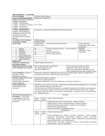 Opis przedmiotu – wersja pełna Wydział Nauk o Zdrowiu Nazwa Wydziału Nazwa kierunku/specjalności Ratownictwo Medyczne Studia (odpowiednie podkreślić) I stopnia - stacjonarne I stopnia - niestacjonarne I stopnia - pomostowe: poziom A / B / C/ D/ E I stopnia - stacjonarne I stopnia - niestacjonarne Kształcenie w zakresie Kwalifikowanej Pierwszej Pomocy NAZWA PRZEDMIOTU (zgodnie z obowiązującym standardem kształcenia i/lub programem nauczania zatwierdzonym przez Radę WNoZ) Pierwsza pomoc Przedmioty wprowadzające Wymagania wstępne Znajomość BLS Liczba godzin Warunki zaliczenia przedmiotu Forma zajęć dydaktycznych 1. Ogółem 2. Wykłady 3. Seminaria 4. Ćwiczenia 5. Zajęcia praktyczne 6. Praktyki zawodowe 7. Samokształcenie Punkty ETC Jednostka organizacyjna prowadząca zajęcia Stopień/tytuł/nazwisko i imię osób realizujących przedmiot Cele przedmiotu (wynikowe dotyczące wiedzy, umiejętności i postaw) Metody dydaktyczne (sposób pracy nauczyciela, umożliwiający osiągnięcie celów kształcenia) Środki dydaktyczne usprawniające proces nauczania Główne treści programowe z przedmiotu – forma zajęć uwzględniająca kolejność, liczbę godzin, temat i treści nauczania Pisemny egzamin końcowy – test oraz pytania opisowe, Egzamin praktyczny Ocena ciągła słuchacza 60 5 15 40 Forma zaliczenia przedmiotu (odpowiednie podkreślić) Egzamin Zaliczenie z oceną Zaliczenie 4 Zakład Medycyny Katastrof Wykaz osób prowadzących zajęcia Mgr Marek Dąbrowski, mgr Agata Dąbrowska, mgr Marcin Rybakowski, lek. med. Stanisław Perz lek med. Wojciech Telec Znajomość organizacji i funkcjonowania ratownictwa medycznego w Polsce. Postępowanie w sytuacjach kryzysowych, zdarzeń masowych, katastrof. Osoba odpowiedzialna za przedmiot Dr n med. Magdalena Witt Mgr Marek Dąbrowski Wykład multimedialny, dyskusja, Seminarium, projekcja filmów Ćwiczenia z fantomami, ćwiczenia praktyczne ze sprzętem ratunkowym Manekiny do resuscytacji/ ćwiczenia z fantomami do udrażniania dróg oddechowych i całą gamą sprzętu zabezpieczającego drogi ddechowe wykorzystanie apteczki pierwszej pomocy, materiałów opatrunkowych, środków pozoracyjnych, ćwiczenia praktyczne studenci również uczą się wielu technik ratunkowych na sobie. Zajęcia ewakuacji z trudnych miejsc oraz ćwiczenia z samochodem – ewakuacja. Praca z zestawem PSP R1 – deska plus szyny Wykłady Numer kolejny 1 Liczba godzin 5 Numer kolejny 1 Liczba godzin 5 Temat i treści nauczania Organizacja ratownictwa medycznego - podstawy prawne Bezpieczeństwo własne, poszkodowanego, miejsca zdarzenia Ocena poszkodowanego, badanie wstępne oraz szczegółowe. Poszkodowany nieprzytomny Zestawy ratownicze, dezynfekcja sprzętu Seminarium Temat i treści nauczania Ocena podstawowych funkcji życiowych człowieka w stanie nagłego zagrożenia zdrowotnego. Resuscytacja (dorosły, dziecko, niemowlę, noworodek, sytuacje szczególne), Zasady defibrylacji poszkodowanego metodą półautomatyczną i automatyczną. Wstrząs. Inne stany nagłe - drgawki, cukrzyca, zawał mięśnia sercowego, udar mózgowy, zatrucia, podtopienie Zabezpieczenie i stabilizacja różnych obszarów ciała uszkodzonych w wyniku działania czynników zewnętrznych. Podejmowanie czynności przez ratownika w ramach kwalifikowanej pierwszej pomocy w szczególnych rodzajach zagrożeń środowiskowych za pomocą Zestawu PSP R1 2 5 3 5 Numer kolejny 1 Liczba godzin 5 2 5 3 5 4 5 5 5 Resuscytacja krążeniowo oddechowa przyrządowa oraz z użyciem AED Zakrztuszenia Unieruchamianie poszkodowanego oraz stabilizacja po urazie, zakładanie kołnierza stabilizacja na desce ortopedycznej /motocyklista Ewakuacja poszkodowanego z samochodu oraz innego miejsca zagrożenia 6 5 scenariusze ćwiczeniowe – praca z zestawem PSP R1 plus AED 7 5 scenariusze ćwiczeniowe – praca z zestawem PSP R1 plus AED 8 5 scenariusze ćwiczeniowe – praca z zestawem PSP R1 plus AED Numer kolejny Liczba godzin Liczba godzin Temat i treści nauczania Liczba godzin 1. Temat i treści nauczania Urazy mechaniczne i obrażenia - złamania, zwichnięcia, skręcenia, krwotoki, obrażenia klatki piersiowej, brzucha, kręgosłupa, głowy i kończyn Urazy chemiczne, termiczne, elektryczne i obrażenia, zagrożenia środowiskowe, akty terroru. Taktyka działań ratowniczych - zdarzenie masowe, mnogie, pojedyncze, segregacja wstępna, Ewakuacja ze strefy zagrożenia. Ćwiczenia Temat i treści nauczania Badanie ABCDE+ URAZOWE poszkodowanego oraz postępowanie przeciwwstrząsowe Drożność dróg oddechowych/ Tlenoterapia R1 KPP/Wentylacja na worku Zajęcia praktyczne Temat i treści nauczania Praktyki zawodowe Samokształcenie Wykaz literatury podstawowej dostępnej dla studenta (do 4 pozycji). 2. 3. 4. Wykaz literatury uzupełniającej (do 4 pozycji). ─ ─ Ewakuacja i transport poszkodowanych . podręcznik pod red. Lilianny Styki. Górnicki Wydawnictwo Medyczne, 2008. Ustawa o Państwowym Ratownictwie Medycznym pod red. Stefana Piździocha i Przemysława Guły. Wolters Kluwer Polska, 2008. Medycyna ratunkowa i katastrof pod red. Andrzeja zawadzkiego. PZWL, 2006. Sefrin P., Schua R., red. wyd. pol. Juliusz Jakubaszko, ”Postępowanie w nagłych zagrożeniach zdrowotnych” Elsevier Urban&Partner, Wrocław 2007, wyd. 2 Materiały do KPP skrypt –Marek Dąbrowski „Basic Trauma Life Suport” pod redakcją Johna Emory’ego Campbella, ROZPORZĄDZENIE MINISTRA ZDROWIA z dnia 19 marca 2007 r. w sprawie kursu w zakresie kwalifikowanej pierwszej pomocy „Podstawowe techniki ratownicze Należy stosować czcionkę Time New Roman, nr 9, pojedynczy odstęp między wierszami. Adres strony internetowej dla standardów kształcenia: http://www.bip.nauka.gov.pl/bipmein/index.jsp?place=Lead07&news_cat_id=117&news_id=982&layout=1&page=te xt Opis przedmiotu – wersja skrócona Wydział Nauk o Zdrowiu Nazwa Wydziału Nazwa kierunku/specjalności Ratownictwo medyczne Studia (odpowiednie podkreślić