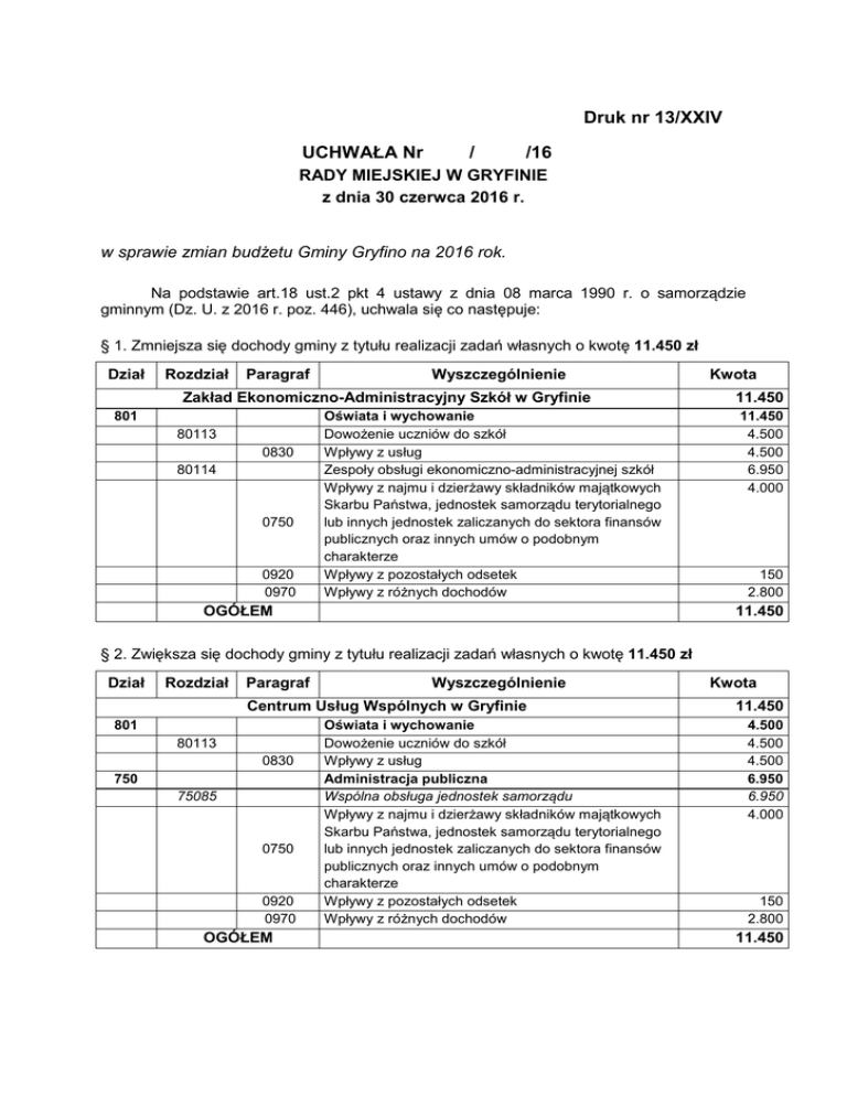 Druk nr 13/XXIV UCHWAŁA Nr / /16 RADY MIEJSKIEJ W GRYFINIE z dnia 30 czerwca 2016 r. w sprawie zmian budżetu Gminy Gryfino na 2016 rok. Na podstawie art.18 ust.2 pkt 4 ustawy z dnia 08 marca 1990 r. o samorządzie gminnym (Dz. U. z 2016 r. poz. 446), uchwala się co następuje: § 1. Zmniejsza się dochody gminy z tytułu realizacji zadań własnych o kwotę 11.450 zł Dział Rozdział Paragraf Wyszczególnienie Zakład Ekonomiczno-Administracyjny Szkół w Gryfinie 801 80113 0830 80114 0750 0920 0970 Oświata i wychowanie Dowożenie uczniów do szkół Wpływy z usług Zespoły obsługi ekonomiczno-administracyjnej szkół Wpływy z najmu i dzierżawy składników majątkowych Skarbu Państwa, jednostek samorządu terytorialnego lub innych jednostek zaliczanych do sektora finansów publicznych oraz innych umów o podobnym charakterze Wpływy z pozostałych odsetek Wpływy z różnych dochodów OGÓŁEM Kwota 11.450 11.450 4.500 4.500 6.950 4.000 150 2.800 11.450 § 2. Zwiększa się dochody gminy z tytułu realizacji zadań własnych o kwotę 11.450 zł Dział Rozdział Paragraf Wyszczególnienie Centrum Usług Wspólnych w Gryfinie 801 80113 0830 750 75085 0750 0920 0970 OGÓŁEM Oświata i wychowanie Dowożenie uczniów do szkół Wpływy z usług Administracja publiczna Wspólna obsługa jednostek samorządu Wpływy z najmu i dzierżawy składników majątkowych Skarbu Państwa, jednostek samorządu terytorialnego lub innych jednostek zaliczanych do sektora finansów publicznych oraz innych umów o podobnym charakterze Wpływy z pozostałych odsetek Wpływy z różnych dochodów Kwota 11.450 4.500 4.500 4.500 6.950 6.950 4.000 150 2.800 11.450 § 3. Zmniejsza się wydatki gminy z tytułu realizacji zadań własnych o kwotę 1.078.481 zł Dział Rozdział Paragraf Wyszczególnienie Kwota Zakład Ekonomiczno-Administracyjny Szkół w Gryfinie 801 80113 4300 80114 3020 4010 4110 4120 4170 4210 4260 4270 4280 4300 4360 4410 4420 4430 4440 4700 1.021.073 Oświata i wychowanie Dowożenie uczniów do szkół Zakup usług pozostałych Zespoły obsługi ekonomiczno-administracyjnej szkół Wydatki osobowe niezaliczone do wynagrodzeń Wynagrodzenia osobowe pracowników Składki na ubezpieczenia społeczne Składki na Fundusz Pracy Wynagrodzenia bezosobowe Zakup materiałów i wyposażenia Zakup energii Zakup usług remontowych Zakup usług zdrowotnych Zakup usług pozostałych Opłaty z tytułu zakupu usług telekomunikacyjnych Podróże służbowe krajowe Podróże służbowe zagraniczne Różne opłaty i składki Odpis na zakładowy fundusz świadczeń socjalnych Szkolenia pracowników niebędących członkami korpusu służby cywilnej 1.021.073 278.605 278.605 742.468 2.391 507.000 88.100 15.000 3.000 64.000 8.850 8.480 1.273 10.000 5.120 856 430 14.302 13.579 87 Ośrodek Sportu i Rekreacji w Gryfinie 926 92601 4010 4110 4120 4440 57.408 Kultura fizyczna Obiekty sportowe Wynagrodzenia osobowe pracowników Składki na ubezpieczenia społeczne Składki na Fundusz Pracy Odpis na zakładowy fundusz świadczeń socjalnych 57.408 57.408 47.172 7.986 1.156 1.094 OGÓŁEM 1.078.481 § 4. Zwiększa się wydatki gminy z tytułu realizacji zadań własnych o kwotę 1.078.481 zł Dział Rozdział Paragraf Wyszczególnienie Centrum Usług Wspólnych w Gryfinie 801 80113 4300 750 75085 3020 4010 4110 4120 Oświata i wychowanie Dowożenie uczniów do szkół Zakup usług pozostałych Administracja publiczna Wspólna obsługa jednostek samorządu Wydatki osobowe niezaliczone do wynagrodzeń Wynagrodzenia osobowe pracowników Składki na ubezpieczenia społeczne Składki na Fundusz Pracy Kwota 1.078.481 278.605 278.605 278.605 799.876 799.876 2.391 554.172 96.086 16.156 4170 4210 4260 4270 4280 4300 4360 4410 4420 4430 4440 4700 Wynagrodzenia bezosobowe Zakup materiałów i wyposażenia Zakup energii Zakup usług remontowych Zakup usług zdrowotnych Zakup usług pozostałych Opłaty z tytułu zakupu usług telekomunikacyjnych Podróże służbowe krajowe Podróże służbowe zagraniczne Różne opłaty i składki Odpis na zakładowy fundusz świadczeń socjalnych Szkolenia pracowników niebędących członkami korpusu służby cywilnej OGÓŁEM 3.000 64.000 8.850 8.480 1.273 10.000 5.120 856 430 14.302 14.673 87 1.078.481 § 5. Wykonanie uchwały powierza się Burmistrzowi Miasta i Gminy. § 6. Uchwała wchodzi w życie z dniem 1 lipca 2016 r. i podlega ogłoszeniu w Dzienniku Urzędowym Województwa Zachodniopomorskiego. PRZEWODNICZĄCA RADY Elżbieta Kasprzyk UZASADNIENIE Dział 758, 801, 926 11.450 / 1.021.073 zł – przeniesienia planu dochodów i wydatków dokonuje się zgodnie z wnioskiem Zakładu Ekonomiczno-Administracyjnego Szkół w Gryfinie w związku z likwidacją Zakładu, a utworzeniem z dniem 1 lipca b.r. Centrum Usług Wspólnych w Gryfinie. 57.408 zł – przeniesienia planu wydatków dokonuje się zgodnie z wnioskiem Ośrodka Sportu i Rekreacji w Gryfinie w związku z przejęciem obowiązków z zakresu księgowości przez nowo utworzoną jednostkę - Centrum Usług Wspólnych w Gryfinie. . Zatwierdziła: Beata Blejsz Sprawdziła: Milena Świeboda Sporządziła: Sylwia Skrzyniarz