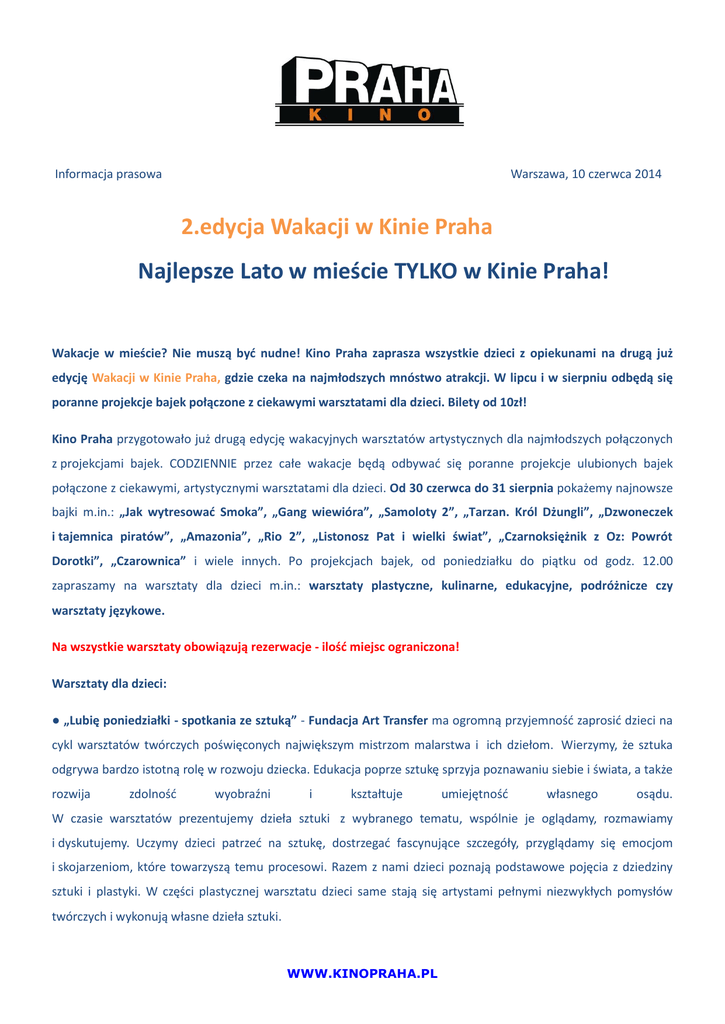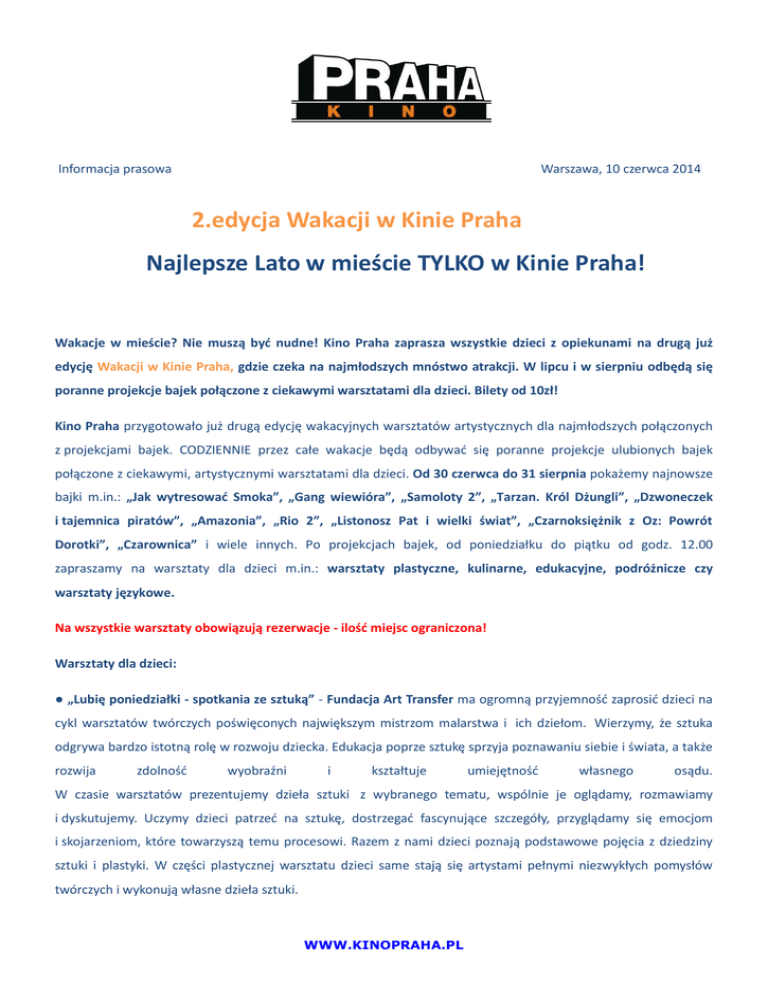 Informacja prasowa Warszawa, 10 czerwca 2014 2.edycja Wakacji w Kinie Praha Najlepsze Lato w mieście TYLKO w Kinie Praha! Wakacje w mieście? Nie muszą być nudne! Kino Praha zaprasza wszystkie dzieci z opiekunami na drugą już edycję Wakacji w Kinie Praha, gdzie czeka na najmłodszych mnóstwo atrakcji. W lipcu i w sierpniu odbędą się poranne projekcje bajek połączone z ciekawymi warsztatami dla dzieci. Bilety od 10zł! Kino Praha przygotowało już drugą edycję wakacyjnych warsztatów artystycznych dla najmłodszych połączonych z projekcjami bajek. CODZIENNIE przez całe wakacje będą odbywać się poranne projekcje ulubionych bajek połączone z ciekawymi, artystycznymi warsztatami dla dzieci. Od 30 czerwca do 31 sierpnia pokażemy najnowsze bajki m.in.: „Jak wytresować Smoka”, „Gang wiewióra”, „Samoloty 2”, „Tarzan. Król Dżungli”, „Dzwoneczek i tajemnica piratów”, „Amazonia”, „Rio 2”, „Listonosz Pat i wielki świat”, „Czarnoksiężnik z Oz: Powrót Dorotki”, „Czarownica” i wiele innych. Po projekcjach bajek, od poniedziałku do piątku od godz. 12.00 zapraszamy na warsztaty dla dzieci m.in.: warsztaty plastyczne, kulinarne, edukacyjne, podróżnicze czy warsztaty językowe. Na wszystkie warsztaty obowiązują rezerwacje - ilość miejsc ograniczona! Warsztaty dla dzieci: ● „Lubię poniedziałki - spotkania ze sztuką” - Fundacja Art Transfer ma ogromną przyjemność zaprosić dzieci na cykl warsztatów twórczych poświęconych największym mistrzom malarstwa i ich dziełom. Wierzymy, że sztuka odgrywa bardzo istotną rolę w rozwoju dziecka. Edukacja poprze sztukę sprzyja poznawaniu siebie i świata, a także rozwija zdolność wyobraźni i kształtuje umiejętność własnego osądu. W czasie warsztatów prezentujemy dzieła sztuki z wybranego tematu, wspólnie je oglądamy, rozmawiamy i dyskutujemy. Uczymy dzieci patrzeć na sztukę, dostrzegać fascynujące szczegóły, przyglądamy się emocjom i skojarzeniom, które towarzyszą temu procesowi. Razem z nami dzieci poznają podstawowe pojęcia z dziedziny sztuki i plastyki. W części plastycznej warsztatu dzieci same stają się artystami pełnymi niezwykłych pomysłów twórczych i wykonują własne dzieła sztuki. WWW.KINOPRAHA.PL ● warsztaty plastyczno-ekologiczne - warsztaty plastyczne dla dzieci z wykorzystaniem materiałów recyklingowych i ekologicznych. Będzie kolorowo, ciekawie i wesoło. Pobudzamy wyobraźnię, skupiając się na procesie tworzenia. Mali artyści do dzieła! Organizatorem warsztatów jest Sztukarnia. ● „Bezpieczne Wakacje z Kapitanem Wyderką” - warsztaty mają na celu zapoznanie dzieci z zasadami bezpiecznego przebywania nad wodą. Podczas spotkań dzieci uczą się jak korzystać z dostępnych środków ratunkowych, jak kapok, rzutka, koło ratunkowe, do czego służy gwizdek. Poznają również znaki i tablice ostrzegawcze. Uczą się postepowania w przypadku, gdy są świadkami wypadku nad wodą lub jego ofiarą. Podczas zajęć mają możliwość poznać techniki i sposoby ratownicze. Spotkają się z policjantami służby wodnej i ratownikami WOPR. Nabyta podczas warsztatów wiedza, ma spowodować, że korzystanie z wody będzie przyjemnością. ● „Projekt na Lato”: architektura i design - wakacyjne warsztaty z architektury oraz design skierowane do dzieci. Zajęcia te to wspaniała zabawa pobudzająca wyobraźnie przestrzenną oraz kreatywność, to przygoda z projektowaniem w sam raz na Lato. Organizatorem warsztatów jest Fundacja Inceptio. ● „Afryka dla dzieci” - cykl spotkań, podczas których dzieci zapoznają się z bogactwem i różnorodnością kontynentu afrykańskiego poprzez wspólne działania artystyczne. Wspólnie udamy się w letnią wędrówkę po Afryce szlakiem sztuki i muzyki. Nauczymy się własnoręcznie wykonywać afrykańską zabawkę recyklingową Galimoto - pojazd z drutu z Kenii oraz samemu skonstruujemy niezwykły instrument, jakim jest bambusowy kij deszczowy. Następnie zapoznamy się ze smakami Afryki dzięki kulinarnemu spotkaniu, podczas którego spróbujemy dań różnych kuchni Afryki (od północnej po południową Afrykę!). Nie zapomnimy również o wesołym muzykowaniu! Pogramy na bębnach djembe, najważniejszym instrumencie Afryki Zachodniej. Towarzyszyć nam będą Afrykańczycy mieszkający, na co dzień w Warszawie. Warsztaty poprowadzą Karkandoo i Rytmiczna Radość. ● warsztaty „Mały Geniusz” - cykl warsztatów kreatywno-edukacyjnych. W każdy piątek Twoje dziecko będzie miało okazję zwiedzić najskrytsze zakamarki świata nauki, zabawy i kreatywnego rozwoju, zostać Małym Indiana Jonesem, Małym Majsterkowiczem, poznać tajniki pracy urbanisty oraz rozwinąć swoją kreatywność i wyobraźnię poprzez zabawę. Organizatorem zajęć jest Klub Małego Geniusza. ● warsztaty kulinarne - ogromną atrakcją tegorocznych wakacji będzie wspólne gotowanie z szefem kuchni włoskiej restauracji Mac Jack Targowa 59. Najmłodsi poznają tajniki sztuki kulinarnej i przyrządzania potraw z rejonu morza śródziemnego. Dowiedzą się między innymi jak powstają pizze, kebaby, sałatki. Młodzi kucharze będą mogli na miejscu z dostępnych produktów sami przygotować swoje potraw, którymi podzielą się ze swoimi rodzicami. Warsztaty kulinarne organizuje Restauracją Mac Jack Targowa 59. ● warsztaty edukacyjne - warsztatów dla dzieci i ich rodziców kształtujący kreatywne podejście do nauki i innowacyjne podejście do edukacji. Najmłodsi będą mogli spróbować swoich sił w grze edukacyjnej WWW.KINOPRAHA.PL o funkcjonowaniu ciała człowieka oraz wspólnie z dorosłymi rozwiązywać przeróżne łamigłówki. Zajęcia przygotowane przez Fundację Instytut Edukacji Kreatywnej INEK. ● warsztaty językowe „Hola Amigos - hiszpański dla dzieci” - warsztatów językowych dla dzieci. Gry i zabawy przybliżą dzieciom kraj corridy, futbolu i flamenc