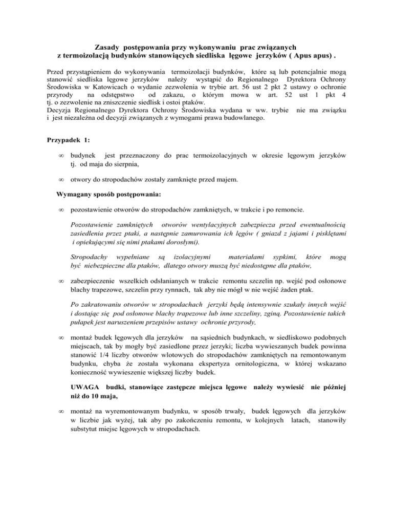 Zasady postępowania przy wykonywaniu prac związanych z termoizolacją budynków stanowiących siedliska lęgowe jerzyków ( Apus apus) . Przed przystąpieniem do wykonywania termoizolacji budynków, które są lub potencjalnie mogą stanowić siedliska lęgowe jerzyków należy wystąpić do Regionalnego Dyrektora Ochrony Środowiska w Katowicach o wydanie zezwolenia w trybie art. 56 ust 2 pkt 2 ustawy o ochronie przyrody na odstępstwo od zakazu, o którym mowa w art. 52 ust 1 pkt 4 tj. o zezwolenie na zniszczenie siedlisk i ostoi ptaków. Decyzja Regionalnego Dyrektora Ochrony Środowiska wydana w ww. trybie nie ma związku i jest niezależna od decyzji związanych z wymogami prawa budowlanego. Przypadek 1: • budynek jest przeznaczony do prac termoizolacyjnych w okresie lęgowym jerzyków tj. od maja do sierpnia, • otwory do stropodachów zostały zamknięte przed majem. Wymagany sposób postępowania: • pozostawienie otworów do stropodachów zamkniętych, w trakcie i po remoncie. Pozostawienie zamkniętych otworów wentylacyjnych zabezpiecza przed ewentualnością zasiedlenia przez ptaki, a następnie zamurowania ich lęgów ( gniazd z jajami i pisklętami i opiekującymi się nimi ptakami dorosłymi). Stropodachy wypełniane są izolacyjnymi materiałami sypkimi, które być niebezpieczne dla ptaków, dlatego otwory muszą być niedostępne dla ptaków, • mogą zabezpieczenie wszelkich odsłanianych w trakcie remontu szczelin np. wejść pod osłonowe blachy trapezowe, szczelin przy rynnach, tak aby nie mógł w nie wejść żaden ptak. Po zakratowaniu otworów w stropodachach jerzyki będą intensywnie szukały innych wejść i dostając się pod osłonowe blachy trapezowe lub inne szczeliny, zginą. Pozostawienie takich pułapek jest naruszeniem przepisów ustawy ochronie przyrody, • montaż budek lęgowych dla jerzyków na sąsiednich budynkach, w siedliskowo podobnych miejscach, tak by mogły być zasiedlone przez jerzyki; liczba wywieszanych budek powinna stanowić 1/4 liczby otworów wlotowych do stropodachów zamkniętych na remontowanym budynku, chyba że została wykonana ekspertyza ornitologiczna, w której wskazano konieczność wywieszenie większej liczby budek. UWAGA budki, stanowiące zastępcze miejsca lęgowe należy wywiesić nie później niż do 10 maja, • montaż na wyremontowanym budynku, w sposób trwały, budek lęgowych dla jerzyków w liczbie jak wyżej, tak aby po zakończeniu remontu, w kolejnych latach, stanowiły substytut miejsc lęgowych w stropodachach. Przypadek 2 • remont elewacji budynku przewidziany (tj. np. od września do listopada), • otwory wlotowe do stropodachu zostały zamknięte, jest poza okresem lęgowym jerzyków Wymagany sposób postępowania • otwory do stropodachów należy otworzyć, lub • obok otworów wywiesić budki lęgowe w liczbie stanowiącej ¼ wszystkich otworów stropodachu po stronie północnej i wschodniej budynku. Przypadek 3. • remont elewacji budynku został przeprowadzony w poprzednich latach, • wycięto otwory w kratkach zabezpieczających w celu umożliwienia ptakom dostępu do stropodachu. Sposób postępowania Wariant 1 (zalecany) • wymienić kratki na całkowicie zamknięte , • w sąsiedztwie zamkniętych otworów w sposób trwały zamontować budki lęgowe dla jerzyków w liczbie stanowiącej ¼ liczby wszystkich otworów w stropodachu po stronie północnej i wschodniej budynku. Wariant 2 (alternatywny) • pozostawienie otworów w kratkach, pod warunkiem • naniesienia substancji chropowatej na wewnętrzną część plastikowej rurki, na której osadzone są kratki zamykające otwory do stropodachu ( powierzchnia tej części rurki musi być chropowata). Ze względu na gładką powierzchnię rurki, ptaki maja bardzo duże problemy w przemieszczaniu się przez te rurki do stropodachu, co w praktyce może całkowicie uniemożliwić dostęp jerzyków do stropodachów. Zastosowanie tego wariantu działania jest jednak dopuszczalne wyłącznie w sytuacjach, gdy termoizolacji stropodachów nie użyto substancji niebezpiecznych dla ptaków. Stropodachy budynków już ocieplonych są zwykle wypełnione materiałem sypkim, takim jak fibra celulozowa. W sytuacji gdy równocześnie wykonano otwory w kratkach zabezpieczających otwory wentylacyjne stwarza to duże niebezpieczeństwo dla ptaków, dla których tak sypki materiał może stanowić pułapkę. Zalecanym wariantem jest zatem całkowite zamknięcie otworów wentylacyjnych i montaż budek lęgowych. Liczba budek lęgowych montowanych powinna wynosić ¼ liczby otworów wentylacyjnych, chyba że wykonano ekspertyzę ornitologiczną z której wynika konieczność zamontowania większej liczby budek. Projekty budek dla jerzyków oraz przykłady zamocowania budek na obiektach poddanych termoizolacji dostępne są na stronie internetowej Małopolskiego Towarzystwa Ornitologicznego (www.mto-kr.pl).