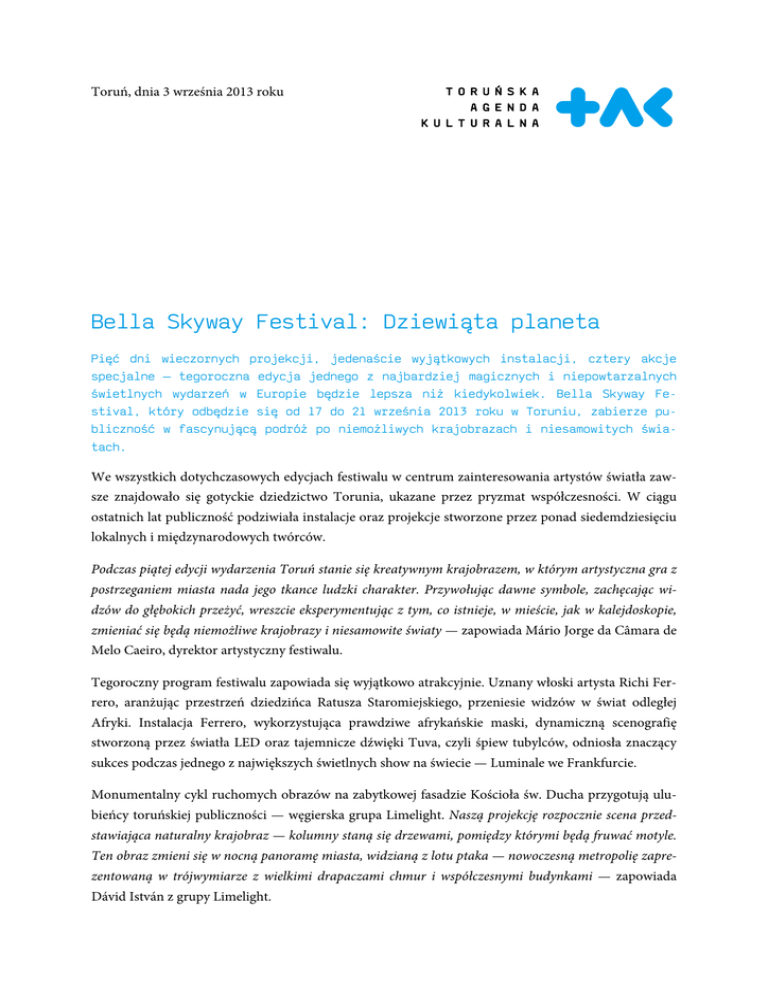 Toruń, dnia 3 września 2013 roku Bella Skyway Festival: Dziewiąta planeta Pięć dni wieczornych projekcji, jedenaście wyjątkowych instalacji, cztery akcje specjalne — tegoroczna edycja jednego z najbardziej magicznych i niepowtarzalnych świetlnych wydarzeń w Europie będzie lepsza niż kiedykolwiek. Bella Skyway Festival, który odbędzie się od 17 do 21 września 2013 roku w Toruniu, zabierze publiczność w fascynującą podróż po niemożliwych krajobrazach i niesamowitych światach. We wszystkich dotychczasowych edycjach festiwalu w centrum zainteresowania artystów światła zawsze znajdowało się gotyckie dziedzictwo Torunia, ukazane przez pryzmat współczesności. W ciągu ostatnich lat publiczność podziwiała instalacje oraz projekcje stworzone przez ponad siedemdziesięciu lokalnych i międzynarodowych twórców. Podczas piątej edycji wydarzenia Toruń stanie się kreatywnym krajobrazem, w którym artystyczna gra z postrzeganiem miasta nada jego tkance ludzki charakter. Przywołując dawne symbole, zachęcając widzów do głębokich przeżyć, wreszcie eksperymentując z tym, co istnieje, w mieście, jak w kalejdoskopie, zmieniać się będą niemożliwe krajobrazy i niesamowite światy — zapowiada Mário Jorge da Câmara de Melo Caeiro, dyrektor artystyczny festiwalu. Tegoroczny program festiwalu zapowiada się wyjątkowo atrakcyjnie. Uznany włoski artysta Richi Ferrero, aranżując przestrzeń dziedzińca Ratusza Staromiejskiego, przeniesie widzów w świat odległej Afryki. Instalacja Ferrero, wykorzystująca prawdziwe afrykańskie maski, dynamiczną scenografię stworzoną przez światła LED oraz tajemnicze dźwięki Tuva, czyli śpiew tubylców, odniosła znaczący sukces podczas jednego z największych świetlnych show na świecie — Luminale we Frankfurcie. Monumentalny cykl ruchomych obrazów na zabytkowej fasadzie Kościoła św. Ducha przygotują ulubieńcy toruńskiej publiczności — węgierska grupa Limelight. Naszą projekcję rozpocznie scena przedstawiająca naturalny krajobraz — kolumny staną się drzewami, pomiędzy którymi będą fruwać motyle. Ten obraz zmieni się w nocną panoramę miasta, widzianą z lotu ptaka — nowoczesną metropolię zaprezentowaną w trójwymiarze z wielkimi drapaczami chmur i współczesnymi budynkami — zapowiada Dávid István z grupy Limelight. Widowiskowy mapping na fasadzie Collegium Maximum UMK przygotuje czeska grupa Macula. Artyści przeniosą publiczność w miejsce pełne pustki, wywołujące wrażenie bezsensowności i ciemności. Czesi wykorzystują fasadę budynku jako przerwę w bycie i niebycie, jako most łączący oczywiste interpretacje z tymi niespodziewanymi — dodaje Agnieszka Marecka, koordynatorka festiwalu. Inauguracja Bella Skyway Festival odbędzie się o godzinie 19.45 we wtorek, 17 września 2013 roku na Rynku Staromiejskim. Wszystkie projekcje będą prezentowane codziennie od godziny 19.45 do północy. Kontakt dla mediów Przemysław Draheim — rzecznik prasowy Karolina Szczepanowska — główny specjalista Toruńskiej Agendy Kulturalnej ds. PR Toruńskiej Agendy Kulturalnej tel. kom. 883 32 16 98 · tel. 56 651 02 38 tel. 56 651 02 38 [email protected] [email protected]