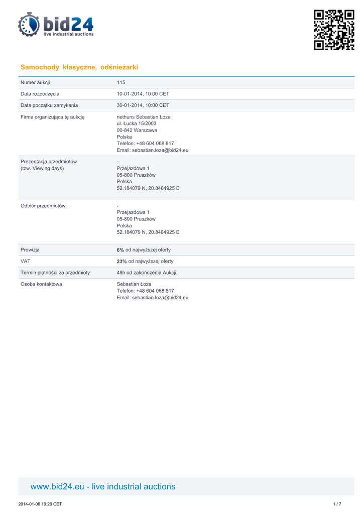 Samochody klasyczne, odśnieżarki Numer aukcji 115 Data rozpoczęcia 10-01-2014, 10:00 CET Data początku zamykania 30-01-2014, 10:00 CET Firma organizująca tę aukcję nethuns Sebastian Łoza ul. Łucka 15/2003 00-842 Warszawa Polska Telefon: +48 604 068 817 Email: [email protected] Prezentacja przedmiotów (tzw. Viewing days) Przejazdowa 1 05-800 Pruszków Polska 52.184079 N, 20.8484925 E Odbiór przedmiotów Przejazdowa 1 05-800 Pruszków Polska 52.184079 N, 20.8484925 E Prowizja 6% od najwyższej oferty VAT 23% od najwyższej oferty Termin płatności za przedmioty 48h od zakończenia Aukcji. Osoba kontaktowa Sebastian Łoza Telefon: +48 604 068 817 Email: [email protected] www.bid24.eu - live industrial auctions 2014-01-06 10:20 CET 1/7 Numer Ilość Opis Rozpoczęcie zamykania Cena wywoławcza 115-1 1 Lotus Esprit 25th Anniversary Edition 012 Transport i logistyka / Samochody osobowe i dostawcze / Samochody osobowe 2014-01-30 10:00:00 17500.00 € 115-2 1 Mercedes SL600 Limited Edition Transport i logistyka / Samochody osobowe i dostawcze / Samochody osobowe 2014-01-30 11:00:00 1000.00 € 115-4 1 Skuter Lance Cali Classic 125cc Transport i logistyka / Pojazdy jednośladowe / Skutery Silnik: 125cc, , Ilość cylindrów: 1, , , Przebieg: 706km, 2014-01-30 12:00:00 200.00 € 115-5 1 Odśnieżarka Toro 722E Power Throw 205cc Dom i ogród / Narzędzia ogrodnicze / Odśnieżarki Rodzaj silnika: Briggs & Stratton OHV 4-Cycle, Pojemność silnika: 205cc, Pojemność zbiornika paliwa: 3l, , Średnica wirnika: 250mm, Ilość łopat świdra: 3, Szerokość oczyszczania: 560mm, Odległość wyrzutu: max 9m, 2014-01-30 13:00:00 500.00 € 115-7 1 Odśnieżarka Toro Power Clear R TEK 141cc Dom i ogród / Narzędzia ogrodnicze / Odśnieżarki Pojemność silnika: 141cc, Pojemność zbiornika paliwa: 1l, Szerokość oczyszczania: 530mm, Odległość wyrzutu: max 9m, 2014-01-30 14:00:00 400.00 € 115-8 1 Odśnieżarka Toro Power Clear 180 87cc Dom i ogród / Narzędzia ogrodnicze / Odśnieżarki Pojemność silnika: 87cc, Szerokość oczyszczania: 450mm, Odległość wyrzutu: max 5.5m, 2014-01-30 15:00:00 150.00 € www.bid24.eu - live industrial auctions 2014-01-06 10:20 CET 2/7 Regulamin 1. Definicje 1. Aukcja – publiczna prezentacja Przedmiotu, Przedmiotów lub Kombinacji Przedmiotów w celu składania przez Użytkowników Ofert w ramach danej Aukcji, organizowana przez Bid24 za pośrednictwem Portalu Aukcyjnego; 2. Bid24 – firma nethuns Sebastian Łoza, wpisana do Centralnej Ewidencji i Informacji o Działalności Gospodarczej (CEIDG), NIP PL9211864009, REGON 142948766; 3. Cena Minimalna – minimalna kwota Oferty dotyczącej Przedmiotu będącego przedmiotem Licytacji, jaka może zostać uznana za Najwyższą Ofertę, o ile w Szczególnych Warunkach dotyczących danego Przedmiotu przewidziano takie zastrzeżenie; 4. Dane Osobowe – dane osobowe w rozumieniu ustawy z dnia 29 sierpnia 1997 roku, o ochronie danych osobowych (Dz.U.97.133.883 ze zm.) Użytkownika i osoby reprezentującej Użytkownika na Portalu Aukcyjnym, dostarczone przez Użytkownika; 5. Kombinacja Przedmiotów – dwa lub więcej Przedmioty, które są sprzedawane razem (pod jednym numerem) w ramach jednej Licytacji w toku Aukcji, o ile w Szczególnych Warunkach danej Aukcji przewidziano taką możliwość; 6. Licytacja – okres, w którym Użytkownicy składają Oferty dotyczące danego Przedmiotu lub Kombinacji Przedmiotów w ramach Aukcji; 7. Nabywca – Użytkownik, który złożył Najwyższą Ofertę za Przedmiot lub Kombinację Przedmiotów w czasie trwania Aukcji, zobowiązany do nabycia od Sprzedającego danego Przedmiotu lub Kombinacji Przedmiotów na warunkach określonych w Ogólnych Warunkach i Szczególnych Warunkach; 8. Najwyższa Oferta – najkorzystniejsza (najwyższa) Oferta dotycząca Przedmiotu lub Kombinacji Przedmiotów złożona w czasie trwania Aukcji, nie niższa niż Cena Minimalna, przy czym Oferty dotyczące Kombinacji Przedmiotów mają pierwszeństwo przed Ofertami dotyczącymi poszczególnych Przedmiotów wchodzących w skład Kombinacji Przedmiotów; 9. Oferta – każda korzystniejsza oferta zakupu Przedmiotu lub Kombinacji Przedmiotów złożona przez Użytkownika w czasie trwania danej Licytacji; 10. Ogólne Warunki – niniejsze Ogólne Warunki Serwisu Akcyjnego BID24 wraz z ich późniejszymi zmianami w aktualnie obowiązującej wersji; 11. Portal Aukcyjny – serwis internetowy dostępny pod adresami: bid24.eu, bid24.pl, bid24.nl, bid24.be, bid24.co, który jest zarządzany przez Bid24, za pomocą którego prowadzone są Aukcje; 12. Przedmiot – rzecz lub prawo majątkowe, które są oferowane w ramach danej Licytacji w toku Aukcji, opisane w Szczególnych Warunkach danej Aukcji; 13. Rejestracja – wypełnienie formularza rejestracyjnego dostępnego w Portalu Aukcyjnym w celu uzyskania statusu Użytkownika; 14. Sprzedający – pełnoletnie osoby fizyczne będące przedsiębiorcami lub inne podmioty prawa, w imieniu których Bid24 oferuje sprzedaż Przedmiotu lub Kombinacji Przedmiotów za pomocą Portalu Aukcyjnego na warunkach określonych w Ogólnych Warunkach i Szczególnych Warunkach; 15. Szczególne Warunki – dodatkowe uzupełniające lub odstępujące od Ogólnych Warunków zasady i warunki oraz informacje dotyczące konkretnej Aukcji; 16. Użytkownik – osoba, będąca przedsiębiorcą, która zarejestrowała się w Portalu Aukcyjnym. 2. Postanowienia ogólne 1. Niniejsze Ogólne Warunki określają podstawowe zasady i warunki, na jakich Użytkownicy mogą korzystać z Portalu Aukcyjnego, brać udział w Aukcjach, a Nabywcy finalizować transakcje nabycia Przedmiotów lub Kombinacji Przedmiotów. 3. Rejestracja w Portalu Aukcyjnym 1. W celu uzyskania statusu Użytkownika konieczne jest dokonanie jednorazowej, bezpłatnej rejestracji za pomocą formularza rejestracyjnego dostępnego na Portalu Aukcyjnym. W tym celu należy wypełnić formularz rejestracyjny podając s