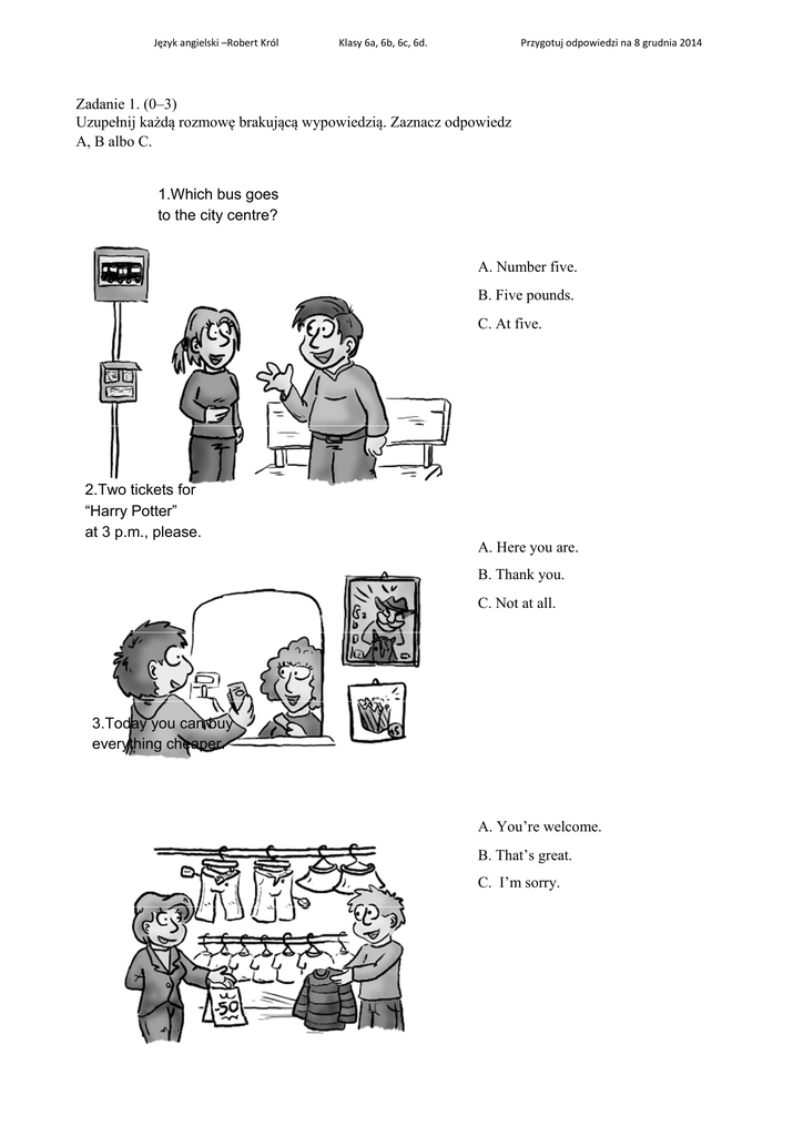 Język angielski –Robert Król Klasy 6a, 6b, 6c, 6d. Przygotuj odpowiedzi na 8 grudnia 2014 Zadanie 1. (0–3) Uzupełnij każdą rozmowę brakującą wypowiedzią. Zaznacz odpowiedz A, B albo C. 1.Which bus goes to the city centre? A. Number five. B. Five pounds. C. At five. 2.Two tickets for “Harry Potter” at 3 p.m., please. A. Here you are. B. Thank you. C. Not at all. 3.Today you can buy everything cheaper. A. You’re welcome. B. That’s great. C. I’m sorry. Język angielski –Robert Król Klasy 6a, 6b, 6c, 6d. Przygotuj odpowiedzi na 8 grudnia 2014 Zadanie 2. (0–5) Dla każdej z opisanych sytuacji (6.1.–6.5.) wybierz właściwą reakcję (A–F). Wpisz odpowiednią literę w kratkę obok każdego opisu sytuacji. Uwaga! Jedna reakcja nie pasuje do żadnej sytuacji. 6.1. Kolega pyta Cię, kiedy idziesz do dentysty. Co mu odpowiesz? 6.2. Masz gorączkę. Prosisz koleżankę o zakup leku. Co jej powiesz? 6.3. Koleżanka pyta Cię, co robisz dziś po południu. Co jej odpowiesz? 6.4. Kolega pyta Cię, kim jest z zawodu Twoja mama. Co mu odpowiesz? 6.5. Angielski turysta pyta Cię, gdzie jest najbliższa apteka. Co mu odpowiesz? A. Get me some aspirin from the chemist’s, please. B. The aspirin is on the table in the kitchen. C. She’s a nurse. She works in a hospital. D. I’m going to the dentist’s with my mum. E. Next Thursday, in the afternoon. F. Over there, next to the hospital.