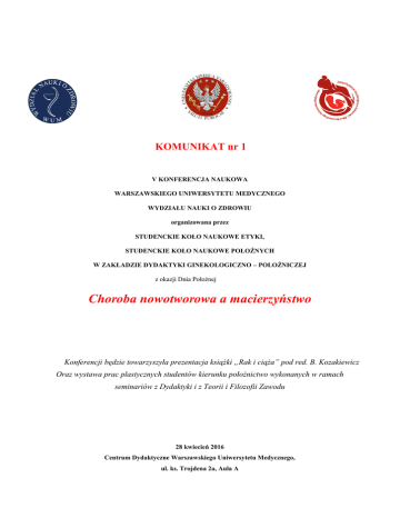 KOMUNIKAT nr 1 V KONFERENCJA NAUKOWA WARSZAWSKIEGO UNIWERSYTETU MEDYCZNEGO WYDZIAŁU NAUKI O ZDROWIU organizowana przez STUDENCKIE KOŁO NAUKOWE ETYKI, STUDENCKIE KOŁO NAUKOWE POŁOŻNYCH W ZAKŁADZIE DYDAKTYKI GINEKOLOGICZNO – POŁOŻNICZEJ z okazji Dnia Położnej Choroba nowotworowa a macierzyństwo Konferencji będzie towarzyszyła prezentacja książki „Rak i ciąża” pod red. B. Kozakiewicz Oraz wystawa prac plastycznych studentów kierunku położnictwo wykonanych w ramach seminariów z Dydaktyki i z Teorii i Filozofii Zawodu 28 kwiecień 2016 Centrum Dydaktyczne Warszawskiego Uniwersytetu Medycznego, ul. ks. Trojdena 2a, Aula A HONOROWY PATRONAT JM Warszawskiego Uniwersytetu Medycznego Prof. dr hab. n. med. Marek Krawczyk Dziekan Wydziału Nauki o Zdrowiu, Warszawskiego Uniwersytetu Medycznego Prof. dr hab. n. med. Piotr Małkowski MIEJSCE OBRAD: Warszawski Uniwersytet Medyczny Centrum Dydaktyczne ul. Księcia Trojdena2a Aula A PROGRAM KONFERENCJI OBEJMUJE I SESJA Przebyta choroba nowotworowa a prokreacja II SESJA Choroby nowotworowe narządu rodnego i piersi III SESJA PLAKATOWA IV SESJA WARSZTATOWA Lp. Tytuł warsztatu 1. Nietrzymanie moczu 2. Mastektomia – masaż limfatyczny 3. Opieka hospicyjna- jak być z pacjentką i jej rodziną 4. Dialog z pacjentem onkologicznym Zapraszamy na Konferencję 1. Uczestnictwo w konferencji jest nieodpłatne Warsztaty będą realizowane w ostatniej sesji konferencji. Osoba chcąca uczestniczyć w warsztatach proszona jest o zgłoszenie (liczba miejsc ograniczona 20 osób podczas jednego warsztatu o przyjęciu będzie decydować kolejność zgłoszeń). Zgłoszenia na warsztaty będą przyjmowane na adres [email protected] 2. Osoby pragnące wziąć czynny udział w sesji plakatowej proszone są o zgłoszenie tytułu plakatu i przesłanie jego projektu do zatwierdzenia do dnia 30.03.2016 na adres e-mail [email protected] oraz po otrzymaniu akceptacji dostarczenie go o godzinie 8.00 w dniu konferencji do organizatorów. Na stronie do pobrania formularz zgłoszenia. Liczba miejsc ograniczona. Liczy się kolejność zgłoszeń