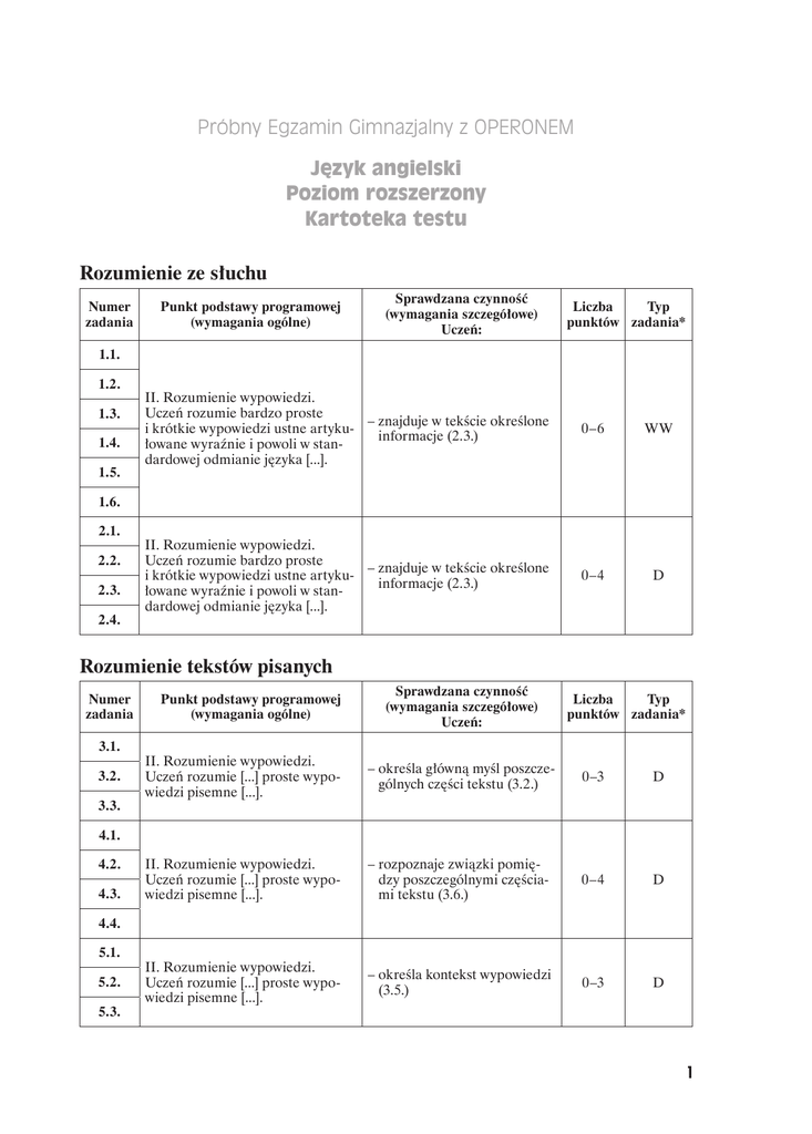 Próbny Egzamin Gimnazjalny z OPERONEM Język angielski Poziom rozszerzony Kartoteka testu Rozumienie ze słuchu Numer zadania Punkt podstawy programowej (wymagania ogólne) Sprawdzana czynność (wymagania szczegółowe) Uczeń: Liczba Typ punktów zadania* 1.1. 1.2. 1.3. 1.4. 1.5. II. Rozumienie wypowiedzi. Uczeń rozumie bardzo proste – znajduje w tekście określone i krótkie wypowiedzi ustne artykuinformacje (2.3.) łowane wyraźnie i powoli w standardowej odmianie języka [...]. 0–6 WW II. Rozumienie wypowiedzi. Uczeń rozumie bardzo proste – znajduje w tekście określone i krótkie wypowiedzi ustne artykuinformacje (2.3.) łowane wyraźnie i powoli w standardowej odmianie języka [...]. 0–4 D 1.6. 2.1. 2.2. 2.3. 2.4. Rozumienie tekstów pisanych Numer zadania 3.1. 3.2. 3.3. Punkt podstawy programowej (wymagania ogólne) Sprawdzana czynność (wymagania szczegółowe) Uczeń: Liczba Typ punktów zadania* II. Rozumienie wypowiedzi. Uczeń rozumie [...] proste wypowiedzi pisemne [...]. – określa główną myśl poszczególnych części tekstu (3.2.) 0–3 D II. Rozumienie wypowiedzi. Uczeń rozumie [...] proste wypowiedzi pisemne [...]. – rozpoznaje związki pomiędzy poszczególnymi częściami tekstu (3.6.) 0–4 D II. Rozumienie wypowiedzi. Uczeń rozumie [...] proste wypowiedzi pisemne [...]. – określa kontekst wypowiedzi (3.5.) 0–3 D 4.1. 4.2. 4.3. 4.4. 5.1. 5.2. 5.3. 1 Kartoteka testu. Język angielski. Poziom rozszerzony Próbny Egzamin Gimnazjalny z OPERONEM i „Gazetą Wyborczą” Znajomość środków językowych Numer zadania Punkt podstawy programowej (wymagania ogólne) Sprawdzana czynność (wymagania szczegółowe) Uczeń: I. Znajomość środków językowych. Uczeń posługuje się podstawowym zasobem środków językowych (leksykalnych, gramatycznych, ortograficznych) [...]. – posługuje się bardzo podstawowym zasobem środków językowych (leksykalnych, gramatycznych, ortograficznych), w zakresie tematów: człowiek, życie rodzinne i towarzyskie (1.1., 1.5.) 0–5 L I. Znajomość środków językowych. – posługuje się bardzo podstaUczeń posługuje się podstawowym wowym zasobem środków zasobem środków językowych językowych (leksykalnych, (leksykalnych, gramatycznych, gramatycznych, ortograficzortograficznych) [...]. nych). 0–5 KO 6.1. 6.2. 6.3. 6.4. 6.5. Liczba Typ punktów zadania* 7.1. 7.2. 7.3. 7.4. 7.5. Wypowiedź pisemna Numer zadania 8. Sprawdzana czynność Liczba (wymagania szczegółowe) punktów Uczeń: – posługuje się podstawowym zasobem środków językowych (leksykalnych, gramaI. Znajomość środków językowych. tycznych, ortograficznych […] (1.1.–1.15.) III. Tworzenie wypowiedzi. Uczeń samodzielnie formułuje – relacjonuje wydarzenia krótkie, proste i zrozumiałe wypoz przeszłości (5.4.) wiedzi [...] pisemne. 0–10 – w yraża i uzasadnia swoje IV. Reagowanie na wypowiedzi. poglądy, uczucia (5.5.) Uczeń […] reaguje w sposób zrozumiały adekwatnie do sytu– opisuje intencje, marzenia, acji komunikacyjnej […] w formie nadzieje i plany na przyszłość prostego tekstu […]. (5.7.) Punkt podstawy programowej (wymagania ogólne) Typ zadania* RO – w yraża swoje emocje (7.7.) * Skróty typów zadań: WW – zadanie wyboru wielokrotnego D – zadanie na dobieranie L – zadanie z lukami KO – zadanie krótkiej odpowiedzi RO – zadanie rozszerzonej odpowiedzi 2 Kartoteka testu. Język angielski. Poziom rozszerzony Próbny Egzamin Gimnazjalny z OPERONEM i „Gazetą Wyborczą” Plan testu Obszar wymagań egzaminacyjnych Liczba punktów za poszczególne obszary Waga testu Numery zadań Rozumienie ze słuchu 10 25% 1, 2 Rozumienie tekstów pisanych 10 25% 3, 4, 5 Znajomość środków językowych 10 25% 6, 7 Wypowiedź pisemna 10 25% 8 3