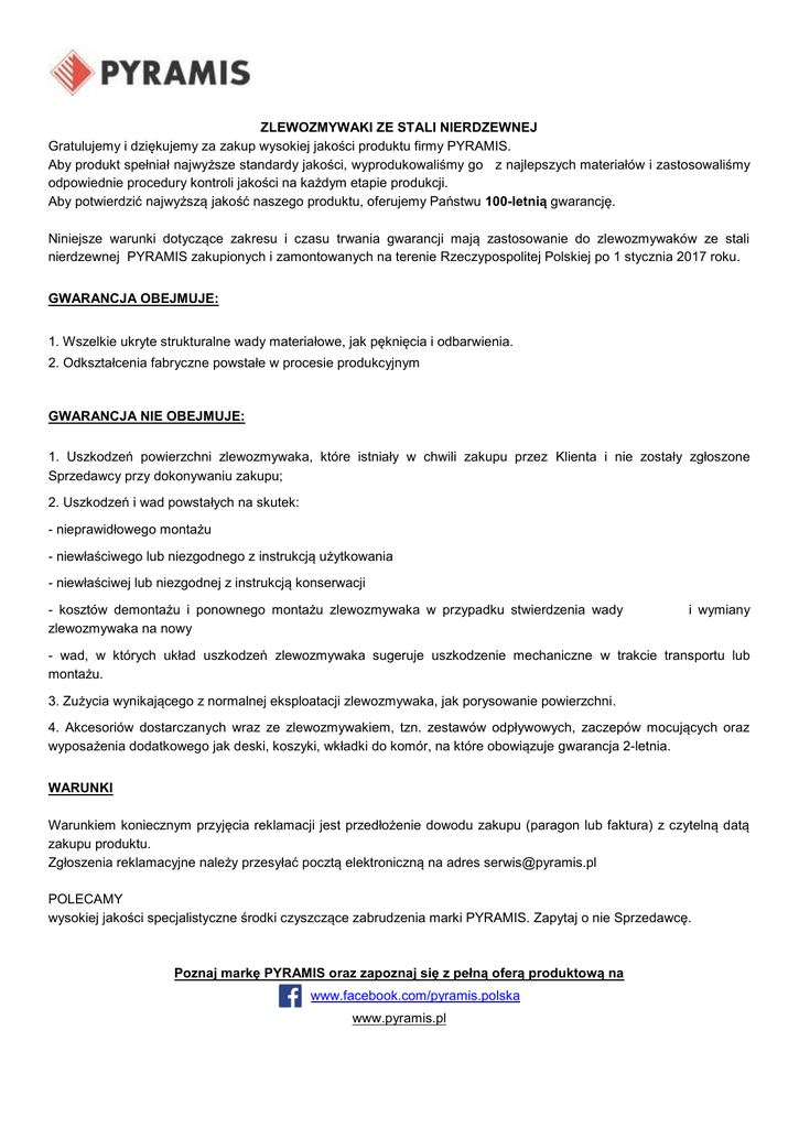 ZLEWOZMYWAKI ZE STALI NIERDZEWNEJ Gratulujemy i dziękujemy za zakup wysokiej jakości produktu firmy PYRAMIS. Aby produkt spełniał najwyższe standardy jakości, wyprodukowaliśmy go z najlepszych materiałów i zastosowaliśmy odpowiednie procedury kontroli jakości na każdym etapie produkcji. Aby potwierdzić najwyższą jakość naszego produktu, oferujemy Państwu 100-letnią gwarancję. Niniejsze warunki dotyczące zakresu i czasu trwania gwarancji mają zastosowanie do zlewozmywaków ze stali nierdzewnej PYRAMIS zakupionych i zamontowanych na terenie Rzeczypospolitej Polskiej po 1 stycznia 2017 roku. GWARANCJA OBEJMUJE: 1. Wszelkie ukryte strukturalne wady materiałowe, jak pęknięcia i odbarwienia. 2. Odkształcenia fabryczne powstałe w procesie produkcyjnym GWARANCJA NIE OBEJMUJE: 1. Uszkodzeń powierzchni zlewozmywaka, które istniały w chwili zakupu przez Klienta i nie zostały zgłoszone Sprzedawcy przy dokonywaniu zakupu; 2. Uszkodzeń i wad powstałych na skutek: - nieprawidłowego montażu - niewłaściwego lub niezgodnego z instrukcją użytkowania - niewłaściwej lub niezgodnej z instrukcją konserwacji - kosztów demontażu i ponownego montażu zlewozmywaka w przypadku stwierdzenia wady zlewozmywaka na nowy i wymiany - wad, w których układ uszkodzeń zlewozmywaka sugeruje uszkodzenie mechaniczne w trakcie transportu lub montażu. 3. Zużycia wynikającego z normalnej eksploatacji zlewozmywaka, jak porysowanie powierzchni. 4. Akcesoriów dostarczanych wraz ze zlewozmywakiem, tzn. zestawów odpływowych, zaczepów mocujących oraz wyposażenia dodatkowego jak deski, koszyki, wkładki do komór, na które obowiązuje gwarancja 2-letnia. WARUNKI Warunkiem koniecznym przyjęcia reklamacji jest przedłożenie dowodu zakupu (paragon lub faktura) z czytelną datą zakupu produktu. Zgłoszenia reklamacyjne należy przesyłać pocztą elektroniczną na adres [email protected] POLECAMY wysokiej jakości specjalistyczne środki czyszczące zabrudzenia marki PYRAMIS. Zapytaj o nie Sprzedawcę. Poznaj markę PYRAMIS oraz zapoznaj się z pełną oferą produktową na www.facebook.com/pyramis.polska www.pyramis.pl