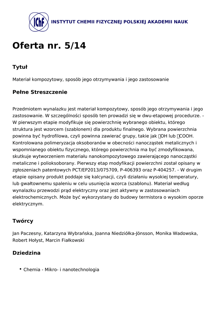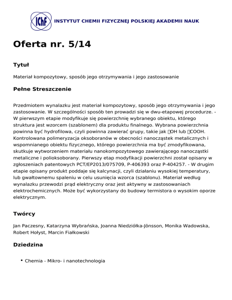 INSTYTUT CHEMII FIZYCZNEJ POLSKIEJ AKADEMII NAUK Oferta nr. 5/14 Tytuł Materiał kompozytowy, sposób jego otrzymywania i jego zastosowanie Pełne Streszczenie Przedmiotem wynalazku jest materiał kompozytowy, sposób jego otrzymywania i jego zastosowanie. W szczególności sposób ten prowadzi się w dwu-etapowej procedurze. W pierwszym etapie modyfikuje się powierzchnię wybranego obiektu, którego struktura jest wzorcem (szablonem) dla produktu finalnego. Wybrana powierzchnia powinna być hydrofilowa, czyli powinna zawierać grupy, takie jak OH lub COOH. Kontrolowana polimeryzacja oksoboranów w obecności nanocząstek metalicznych i wspomnianego obiektu fizycznego, którego powierzchnia ma być zmodyfikowana, skutkuje wytworzeniem materiału nanokompozytowego zawierającego nanocząstki metaliczne i polioksoborany. Pierwszy etap modyfikacji powierzchni został opisany w zgłoszeniach patentowych PCT/EP2013/075709, P-406393 oraz P-404257. - W drugim etapie opisany produkt poddaje się kalcynacji, czyli działaniu wysokiej temperatury, lub gwałtownemu spaleniu w celu usunięcia wzorca (szablonu). Materiał według wynalazku przewodzi prąd elektryczny oraz jest aktywny w zastosowaniach elektrochemicznych. Może być wykorzystany do budowy termistora o wysokim oporze elektrycznym. Twórcy Jan Paczesny, Katarzyna Wybrańska, Joanna Niedziółka-Jönsson, Monika Wadowska, Robert Hołyst, Marcin Fiałkowski Dziedzina Chemia - Mikro- i nanotechnologia Zalety / innowacyjne aspekty Przedmiotem wynalazku jest materiał kompozytowy, charakteryzujący się tym, że przewodzi prąd elektryczny i jest materiałem termoczułym. Wynalazek obejmuje sposób otrzymywania materiałów kompozytowych, charakteryzujący się tym, że obejmuje następujące kroki: a). osadzanie nanokompozytu z nanocząstek metalicznych, zwłaszcza złota, srebra, miedzi, niklu, kobaltu lub ich mieszaniny, i z oksoboranów na powierzchni hydrofilowej jako wzorca (szablonu) z wytworzeniem zmodyfikowanej powierzchni, a następnie b) usuwanie wzorca z tak otrzymanego produktu drogą kalcynacji albo gwałtownego spalania z uzyskaniem materiału kompozytowego. Wynalazek obejmuje zastosowanie tego materiału kompozytowego w elektrochemii oraz w elektronice, zwłaszcza do produkcji elektrod, w układach elektrycznych i elektronicznych, np. termistorach. Słowa kluczowe nanokompozyt, materiał termoczuły, materiał przewodzący Zastosowanie Nanoinżynieria elektroniczna, Półprzewodniki, Kompozyty, Właściwości materiałów, Odporność, Korozja, Technologia papieru, Materiały elektryczne, Substancje specjalne, Energia słoneczna (ogniwa fotowoltaiczne), Niekonwencjonalne lub alternatywne źródła energii, Chemia nieorganiczna, Techniki termiczne Stan zaawansowania etap prototypu Prawa własności intelektualnej Zgłoszenie patentowe w Polsce IChF dla Firm ul. Kasprzaka 44/52 01-224 Warszawa TEL: 22 343 33 12 | FAX: 22 343 33 33 [email protected] | NIP: 525-000-87-55