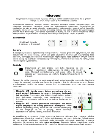 micropul Pasjansowa układanka dla 1 gracza albo gra pełna współzawodnictwa dla 2 graczy (wersja 1.2.1) 24. lutego 2004 © Jean-Francois Lassonde Wydobywanie micropulu, nowego surowca odkrytego wewnątrz rdzenia energetycznego, jest straszliwie kosztowne. Łatwiejszą drogą jest oddziaływanie micropulem bezpośrednio na katalizator, tak aby wywołać zjawisko rozszczepienia i odłamywania z rdzenia całych kawałków micropulu. Naukowcy na całym świecie prowadzą badania nad optymalizacją tej zaprzeczającej prawom fizyki technologii. „Jeśli jesteś wystarczająco bystry, to jest to jak wykorzystanie energii elektrycznej do wygenerowania podwójnej ilości energii elektrycznej! To jest przyszłość…” Zawartość ⋅ ⋅ 48 różnych żetonów 6 kamieni w 2 kolorach Cel gry Z początku posiadasz ograniczoną liczbę żetonów i musisz grać nimi optymalnie, tak aby pozyskiwać ich coraz więcej. Celem gry jest uzyskanie możliwie jak największej ilości żetonów, używając jednocześnie możliwie jak najmniejszej ilości żetonów. W tym samym czasie staraj się tworzyć i oznaczać grupy micropulu. Punkty naliczane są na końcu, kiedy rdzeń ulegnie wyczerpaniu. Zasady Zrozumienie gry jest proste, jeśli micropul i katalizatory oddziaływują sobą. Micropul symbolizowany jest podczas gdy katalizatory są małymi prawej). tylko nauczysz się jak na siebie oraz między przez kółka (z lewej), kropkami/krzyżykami (z Zauważ, że każdy żeton ma na sobie przynajmniej jedną jednostkę micropulu. Wynika to z tego, że micropul posiada moc łączenia żetonów – jest to niezbędne w grze. Reguły przedstawione poniżej są ważne i muszą być przestrzegane przez cały czas trwania rozgrywki. • Reguła #1 Każdy nowy żeton wchodzący do gry • musi zostać dołączony do reszty żetonów, będących już na stole. Precyzując, aby dołączyć swój żeton, jedna z jego jednostek micropulu musi sąsiadować z innymi jednostkami micropulu należącymi do żetonu będącego już w grze. Reguła #2 Czarna jednostka micropulu nie może nigdy przylegać do białej jednostki micropulu i vice versa. Wykładając nowy żeton na stół, zawsze upewnij się, że nie znajduje się on w pozycji, która powoduje sąsiadowanie czarnej i białej jednostki micropulu. Na przykładowym rysunku, żeton oznaczony kolorem zielonym jest żetonem właśnie wykładanym. Zgodnie z regułą #1, żeton jest dołączany do reszty żetonów, jednak reguła #2 nie zostaje spełniona, ponieważ biała jednostka micropulu sąsiaduje z czarną jednostką. To zagranie jest więc nieprawidłowe. Zagranie byłoby prawidłowe, gdyby wykładany żeton został obrócony o 90° zgodnie z kierunkiem ruchu wskazówek zegara. 1 Katalizatory (kropki/krzyżyki) nie są ograniczone w ten sam sposób co micropul. Mogą one przylegać do każdego innego katalizatora, każdego możliwego typu, lub do każdej jednostki micropulu, w każdym kolorze. Katalizatory nie są używane do łączenia żetonów. Zamiast tego, po włączeniu żetonu do gry, katalizator znajdujący się obok jednostki micropulu spowoduje aktywowanie pewnego efektu… Przygotowania Połóż żeton startowy na środku stołu. To ten z 4 jednostkami micropulu, 2 czarnymi i 2 białymi. Pokazany na przykładzie z lewej. Potasuj wszystkie żetony i stwórz małe stosy. Umieść je w miejscu dostępnym dla każdego gracza, będą nazywane rdzeniem. Każdy gracz otrzymuje 6 losowych żetonów z rdzenia – tworzą one jego rękę. Każdy gracz otrzymuje 3 kamienie jednego koloru i kładzie je obok siebie. Wylosuj pierwszego gracza. Podczas swojej tury Gracze rozgrywają turę po turze. W czasie swojej tury posiadasz trzy możliwości działania, ale możesz wykorzystać tylko jedną z nich. ⋅ Wyłożenie żetonu z ręki do gry ⋅ Wzięcie żetonu z twojego magazynu do ręki ⋅ Położenie kamienia na grupie micropulu Podczas każdej tury musi zostać wykonana jedna i może być wykonana tylko jedna akcja. Gracz nie może opuścić tury. Jeśli nie posiadasz żadnych żetonów na ręku lub w magazynie, przegrywasz grę. Opcja: Wyłożenie żetonu z ręki do gry Jeśli twoja ręka jest pusta, ta akcja nie może zostać wykonana. Wykładając żeton, twoim celem jest zaktywowanie katalizatorów które pozwolą ci na dobranie nowych żetonów z rdzenia. → Wybierz jeden żeton z ręki i połóż go obok żetonów wyłożonych poprzednio. Pamiętaj o regułach #1 i #2! Kiedy żeton jest już prawidłowo wyłożony, sprawdź czy któryś z katalizatorów został zaktywowany. Katalizator zostaje zaktywowany, jeśli przylega do zewnętrznej jednostki micropulu. Jeśli jednostka micropulu na twoim żetonie sąsiaduje z katalizatorem na innym żetonie, zostaje on zaktywowany. Katalizator na twoim żetonie zostaje zaktywowany, jeśli przylega do jednostki micropulu z innego żetonu. 2 → Weź żetony z rdzenia, dużego stosu żetonów stworzonego na początku gry. Połóż je, zakryte, obok siebie – od tej chwili jest to twój magazyn. Zaktywowane katalizatory określają ile powinieneś wziąć żetonów. Jeśli zaktywowałeś przynajmniej jeden katalizator-krzyżyk (+), zagraj jeszcze jedną turę. Wykładany jest żeton zaznaczony na zielono. Otrzymujesz 2 żetony z rdzenia. Weź jeden żeton Weź dwa żetony Zagraj jeszcze raz Katalizatory są aktywowane tylko raz na turę, ale mogą zostać ponownie aktywowane w późniejszych turach. Opcja: Wzięcie żetonu z twojego magazynu do ręki Nie możesz mieć więcej niż 6 żetonów na ręku. Jeśli twoja ręka jest pełna, ta akcja nie może zostać wykonana. Wzięcie żetonu z twojego magazynu zakrytych żetonów, pozwoli ci na większy wybór podczas decydowania co wyłożyć. → Weź jeden losowy żeton z twojego magazynu. Włóż ten żeton do swojej ręki i odkryj go. Opcja: Położenie kamienia na grupie micropulu Nie możesz wykonać tej akcji jeśli nie posiadasz już więcej kamieni. Po poło