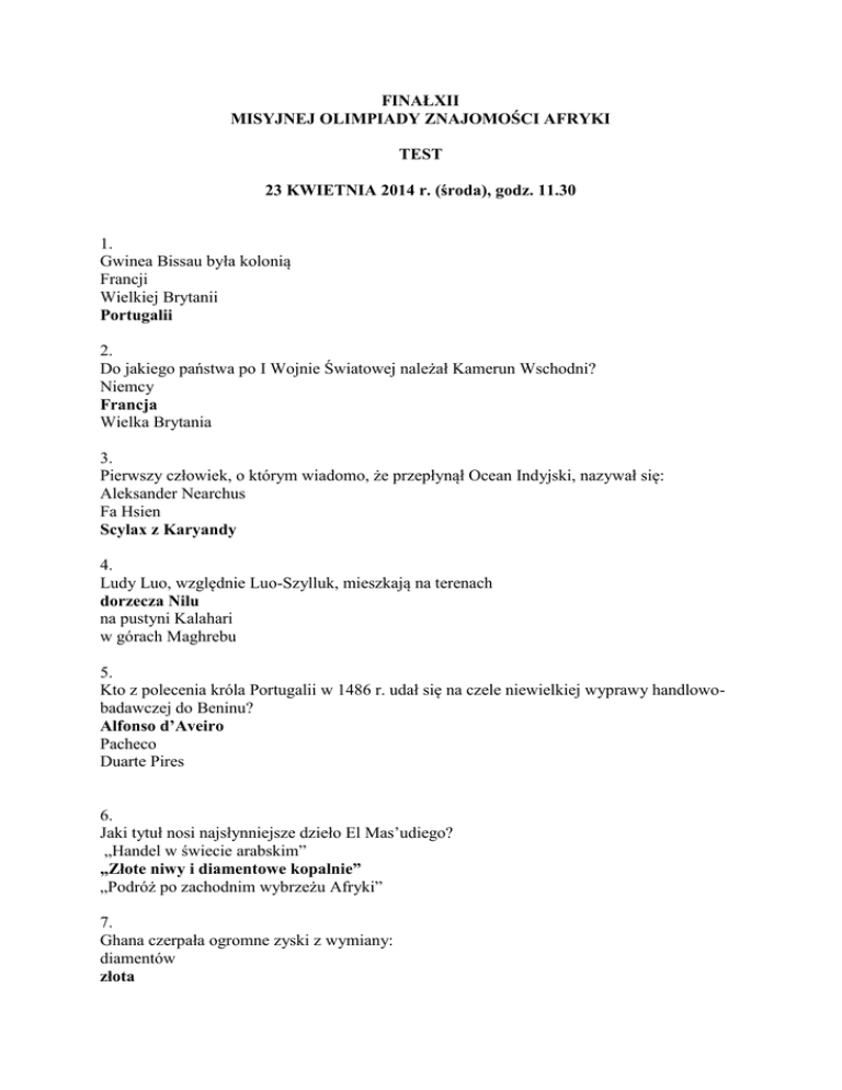 FINAŁXII MISYJNEJ OLIMPIADY ZNAJOMOŚCI AFRYKI TEST 23 KWIETNIA 2014 r. (środa), godz. 11.30 1. Gwinea Bissau była kolonią Francji Wielkiej Brytanii Portugalii 2. Do jakiego państwa po I Wojnie Światowej należał Kamerun Wschodni? Niemcy Francja Wielka Brytania 3. Pierwszy człowiek, o którym wiadomo, że przepłynął Ocean Indyjski, nazywał się: Aleksander Nearchus Fa Hsien Scylax z Karyandy 4. Ludy Luo, względnie Luo-Szylluk, mieszkają na terenach dorzecza Nilu na pustyni Kalahari w górach Maghrebu 5. Kto z polecenia króla Portugalii w 1486 r. udał się na czele niewielkiej wyprawy handlowobadawczej do Beninu? Alfonso d’Aveiro Pacheco Duarte Pires 6. Jaki tytuł nosi najsłynniejsze dzieło El Mas’udiego? „Handel w świecie arabskim” „Złote niwy i diamentowe kopalnie” „Podróż po zachodnim wybrzeżu Afryki” 7. Ghana czerpała ogromne zyski z wymiany: diamentów złota soli 8. Ceuta i Melilla, dwa miasta w sumie o powierzchni 32 kilometrów kwadratowych, położone w Afryce Północnej, „wciśnięte” w Maroko, należą do Wielkiej Brytanii Hiszpanii Francji 9. „Zamani” jest określeniem dla nieograniczonego czasu przeszłego(makroczasu) wspólnym przodkiem wszystkich ludów Bantu nazwą świata podziemnego w mitologii Bagandów 10. Komu zawdzięczamy większość tego, co wiemy o Kuszu? Reisnerowi Griffith’owi Dunhamowi 11. Pierwszymi ludźmi w mitologii Dinków są Gborogboro i Meme Wai i Baluba Garang i Abuk 12. Władcą Bugandy w latach 1857 – 1884 był: Tomboya Semakookiro Mutesa I 13. Pod jaką wspólną nazwą narody wschodnich wybrzeży Afryki były znane Arabom w okresie początków państwa Mali w zachodniej Afryce? Dura Zandż Kalari 14. Kiedy żył Nyikang, legendarny bohater – założyciel Szylluków? 400 lat p.n.e. w V w. n.e. w XVII lub XVIII w. 15. Które z wymienionych krajów przez całe stulecia oddziaływały na długie pasmo wschodnich wybrzeży Afryki i pozostawiły tam po sobie wiele śladów? Persja Indie Indonezja 16. Najświetniejsze miasta suahilskie to m.in.: Pate i Lamu Mombasa i Zanzibar Kilwa 17. Kiedy rozpoczęła się kultura epoki żelaza na południowym brzegu jeziora Tanganika tuż przy malowniczych wodospadach rzeki Kalmbo? 900 lat temu ponad 1500 lat temu ok. 2700 lat temu 18. W stadach Nuerów właściwie prawie każde zwierzę jest przeznaczone na jakąś przyszłą ofiarę. Przed zabiciem zwierzęta są: dobrze nakarmione „powiadamiane” o sensie ofiary polewane pachnącymi olejkami 19. Plemiona Buzu albo Bella spotykamy w strefie sahelu tj. półpustyni, na terenach dzisiejszego: Nigru Burkiny Faso Czadu i Mali 20. Kirdi jest mianem, używanym przez przybyłych na ziemie Adamaua muzułmańskich najeźdźców, dla oznaczenia miejscowych plemion odmawiających przyjęcia islamu. Na terenie jakiego państwa koncentrują się głównie współcześni Kirdi? Kamerunu Mali Demokratycznej Republiki Konga 21. Głównymi przedstawicielami chrześcijan w Egipcie są katolicy luteranie koptowie 22. Według niemieckiego uczonego Hermanna Baumanna w centrum mitologii afrykańskiej znajduje się zasada twórcza zwana przez niego: Wielką Naturą Wielkim Bogiem Matką 23. Krewni ideacyjni (afiliacyjni) są to: osoby nie spokrewnione, ale uważane za krewnych dalecy krewni, ale nie uznawani za rodzinę krewni, którzy zostali odtrąceni od rodziny z różnych powodów 24. Kobiety bezpłodne w Afryce: są bardzo nieszczęśliwe, ponieważ uważają, że nie zaznają nieśmiertelności są otoczone szczególną opieką nie mogą nikogo poślubić 25. Kawaler u Kikuju i w wielu innych plemionach nie może sprawować żadnej odpowiedzialnej funkcji zostaje wodzem wojny ze względu na to, ze nie ma rodziny uznany jest za osobę nieczystą 26. W małżeństwach poliginicznych w Afryce nowa żona ma większe prawa niż pozostałe pierwsza żona jest zwierzchniczką pozostałych wszystkie mają takie same prawa 27. Sara jest nazwą wprowadzoną przez obcych — pochodzącą od regionu i miasta Sarh. Na terenie jakiego państwa koncentrują się głównie współcześni Sara? Czadu Nigerii Republiki Południowej Afryki 28. Kim był Mangan Mokone Mata założycielem Kościoła etiopiańskiego przywódcą religijnym w Mali księdzem katolickim prowadzącym misje w XIX wieku w Zanzibarze 29. Przesłanką poznawania Afryki przez Europejczyków było początkowo: pozyskanie miejscowej ludności dla niewolnictwa poszukiwanie drogi morskiej do Indii bogactwo minerałów, jakie skrywał ten kontynent 30. Językiem urzędowym W Kamerunie jest angielski francuski hausa 31. Spór toczy się na temat Zimbabwe, w południowej części kontynentu. Nie wiemy ani kto, ani po co wzniósł budynki z głazów, które teraz badają archeologowie. Na ogół wiąże się tutejsze znaleziska z państwem, które powstało być może między X a XIII wiekiem, a na pewno istniało w wieku XV. O jakie państwo chodzi? Monomotapa (Matope) Szylluk Kitari 32. W którym roku Jan Paweł II odwiedził Benin? 1982 1993 2001 33. W którym roku Jan Paweł II odwiedził Burkina Faso? 1980 1990 1998 34. Idi Amin (1971-1979) w dyktatorski sposób rządził: Burundi Ugandą Mozambikiem 35. Azande, Bazanie lub Zande są wielkim ludem, zamieszkującym na terenach Demokratycznej Republiki Kongo (Zairu) Republiki Środkowoafrykańskiej Nigerii 36. Papieski apel w spawie Sahelu z 1980 r. został usłyszany i spowodował zryw solidarności. W którym roku utworzono Fundację Jana Pawła II na rzecz krajów Sahelu. 1981 1984 1990 37. Podczas pielgrzymki Jana Pawła II do Burkina Faso w 1990 r. prezydentem kraju był: Blaise Compaoré Sangouelé Lamizana Mathieu Karekou 38. W XV w. Portugalczycy nazwali tereny dzisiejszej Liberii Wybrzeżem Pieprzowym Wybrzeżem Kauri Złotym Wybrzeżem 39. W wierzeniach Fonów występują następujące panteony bóstw: niebiański ziemski pioruna (Hewioso) 40. Największa z rzek Afryki Południowej uchodzących do Oceanu Atlantyckieg