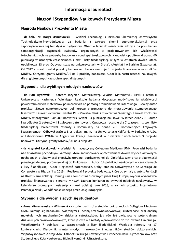 Informacja o laureatach Nagród i Stypendiów Naukowych Prezydenta Miasta Nagroda Naukowa Prezydenta Miasta - dr hab. inż. Borys Ośmiałowski – Wydział Technologii i Inżynierii Chemicznej Uniwersytetu Technologiczno-Przyrodniczego: za badania z zakresu chemii supramolekularnej oraz zapoczątkowanie tej tematyki w Bydgoszczy. Obecnie łączy doświadczenia zdobyte na polu badań samoorganizacji cząsteczek związków organicznych z projektowaniem ich właściwości fotochemicznych na potrzeby budowania sond spektroskopowych. Kandydat opublikował ponad 60 publikacji w uznanych czasopismach z tzw. listy filadelfijskiej, w tym w ostatnich dwóch latach opublikował 13 prac. Odbywał staże na uniwersytetach w Gratz’u (Austria) i w Zurichu (Szwajcaria). Od 2012 r. zrealizował 4 projekty badawcze, obecnie realizuje 3 projekty finansowane ze środków MNiSW. Otrzymał granty MNiSW/UE na 2 projekty badawcze. Autor kilkunastu recenzji naukowych dla anglojęzycznych czasopism specjalistycznych. Stypendia dla wybitnych młodych naukowców - dr Piotr Rytlewski – Katedra Inżynierii Materiałowej, Wydział Matematyki, Fizyki i Techniki Uniwersytetu Kazimierza Wielkiego. Realizuje badania dotyczące modyfikowania właściwości powierzchniowych materiałów polimerowych na pomocą promieniowania laserowego. Główny autor projektu „Nowe nanokompozyty polimerowe przeznaczone do metalizowania stymulowanego laserowo”. Laureat konkursu Iuventus Plus Ministra Nauki i Szkolnictwa Wyższego. Laureat konkursu MNiSW w programie TOP 500 innovators. Wydał 34 publikacje naukowe. W latach 2012-2013 autor i współautor 2 patentów i 8 zgłoszeń patentowych. Opracował recenzje dla 7 czasopism z tzw. listy filadelfijskiej. Prezentował referaty i komunikaty na ponad 20 konferencjach krajowych i zagranicznych. Odbywał staże w 8 ośrodkach m. in. na Uniwersytecie Kalifornia w Berkeley w USA, w Laboratorium POMA w Angers we Francji. Realizował w ostatnich dwóch latach 3 projekty badawcze. Otrzymał granty MNiSW/UE na 3 projekty. - dr Krzysztof Łączkowski – Wydział Farmaceutyczny Collegium Medicum UMK. Prowadzi badania nad triazolami pochodnymi kamfory, które zaowocowały opracowaniem dwóch wysoce aktywnych pochodnych o aktywności przeciwbakteryjnej porównywanej do Ciplofoksacyny oraz o aktywności przeciwgrzybicznej porównywalnej do Flukonazolu. Autor 14 publikacji naukowych w czasopismach z listy filadelfijskiej. Autor 4 zgłoszeń patentowych. Odbył staż na Uniwersytecie de Santiago de Compostela w Hiszpanii w 2013 r. Realizował 4 projekty badawcze, które otrzymały granty z Fundacji na Rzecz Nauki Polskiej: Homing Plus i Pomost finansowanych przez Unię Europejską oraz wykonawca projektu finansowanego z grantu MNiSW. Laureat konkursu na sylwetki młodych naukowców, w kalendarzu promującym osiągnięcia nauki polskiej roku 2013, w ramach projektu Internetowa Promocja Nauki, współfinansowanego przez Unię Europejską. Stypendia dla wyróżniających się studentów - Anna Klimaszewska - Wiśniewska - studentka II roku studiów doktoranckich Collegium Medicum UMK. Zajmuje się badaniami związanymi z oceną przeciwnowotworowej skuteczności oraz analizą molekularnych mechanizmów działania cytostatyków, jak również związków o potencjalnym działaniu przeciwnowotworowym, które jeszcze nie zostały wprowadzone do stosowania klinicznego. Współautorka 7 publikacji w czasopismach z listy filadelfijskiej. Wygłosiła referaty na 17 konferencjach. Kierownik grantu młodych naukowców i uczestników studiów doktoranckich. Współwykonawca 2 projektów. Członek Polskiego Towarzystwa Histochemików i Cytochemików oraz Studenckiego Koła Naukowego Biologii Komórki i Ultrastruktury. Anna Blachowska – studentka kierunku reżyseria dźwięku Wydziału Kompozycji, Teorii Muzyki i Reżyserii Dźwięku Akademii Muzycznej w Bydgoszczy. Uczestniczyła w kilkunastu projektach naukowo-artystycznych w uczelni i poza nią. Współpracowała z wieloma reżyserami przy realizacji dźwięku na planie filmowym filmów m. in. „Kawaler” Karola Stanowskiego, prezentowanego na 38 Festiwalu Polskich Filmów Fabularnych w Gdyni w 2013 r., „Ziomki z pianinem” Oliwiera Krügera, „Sól i pieprz” Sandeep Balhara, „Roża” Wojciecha Smarzowskiego w 2012 r. Brała udział w nagraniach koncertów, w projektach artystycznych prowadzonych we współpracy z innymi ośrodkami akademickimi i Polskim Instytutem Sztuki Filmowej. NAGRODA ARTYSTYCZNA PREZYDENTA BYDGOSZCZY Stanisław Stasiulewicz - ur. 13 grudnia 1955. Artysta plastyk, malarz. W latach 1978-83 studiował na Wydziale Malarstwa Sztalugowego w krakowskiej ASP. Zajmuje się malarstwem, grafiką i rysunkiem. W latach 1985-87 współprowadził bydgoską galerię Kruchta, a w 1987-89 współpracował z Galerią Autorską. Od 1990 współpracuje z galerią Kantorek w Bydgoszczy. W latach 1993-99 był prezesem Zarządu Okręgu ZPAP w Bydgoszczy oraz kierownikiem artystycznym Galerii-85. Był stypendystą Fundacji Pollock-Krasner w Nowym Jorku. Posiada w swoim dorobku ponad 30 wystaw indywidualnych oraz udział w ponad 50 wystawach zbiorowych. STYPENDIA ARTYSTYCZNE PREZYDENTA BYDGOSZCZY Michał Dobrzyński, kompozytor, ur. 24 listopada 1980 w Szczecinie. W 2005 ukończył z wyróżnieniem studia kompozytorskie w klasie prof. Marka Jasińskiego i prof. Zbigniewa Bargielskiego w Akademii Muzycznej w Bydgoszczy, a w 2008 – studia doktoranckie w Uniwersytecie Muzycznym Fryderyka Chopina w Warszawie. Studiował także we Włoszech (Instituto Achille Peri w Regio Emilia) pod kierunkiem prof. Andrei Talmellego i prof. Maurizio Ferrariego. Należy do grona twórców młodego pokolenia, którzy zostali wyłonieni przez prof. Krzysztofa Pendereckiego i prof. Henryka Mikołaja Góreckiego do prestiżowego programu „Młodzi kompozytorzy w hołdzie Fryderykowi Chopinowi”. Jest laureatem konkursów kompozytorskich, m.in. II nagrody na Międzynarod
