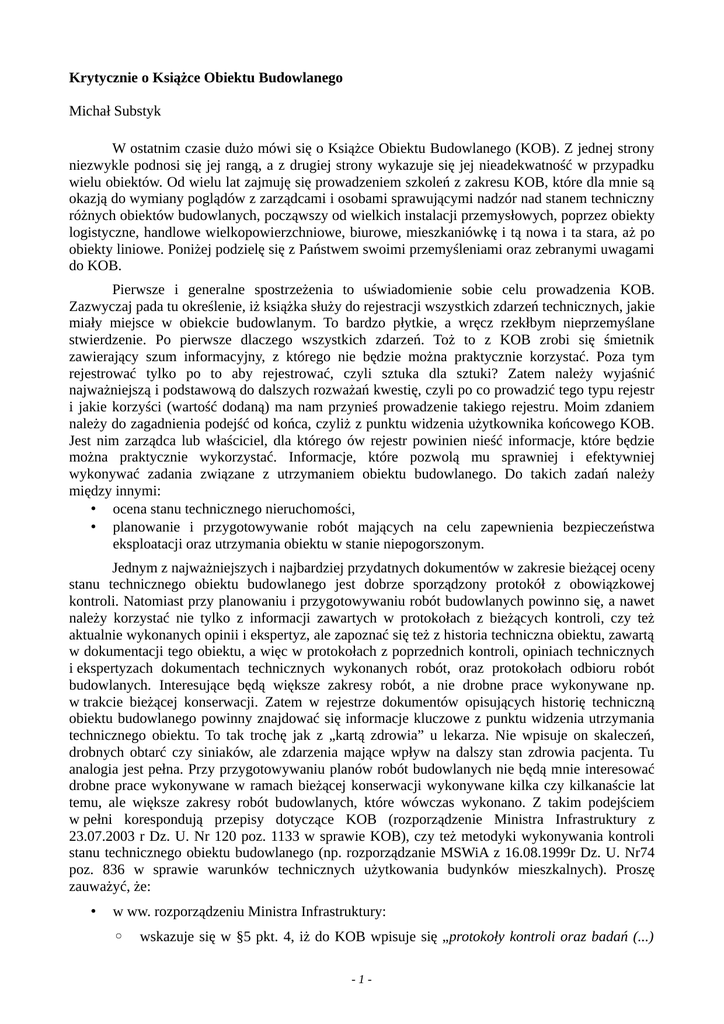 Krytycznie o Książce Obiektu Budowlanego Michał Substyk W