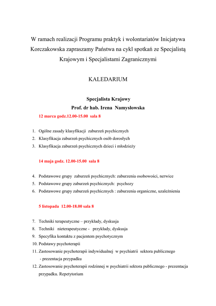 W ramach realizacji Programu praktyk i wolontariatów Inicjatywa Korczakowska zapraszamy Państwa na cykl spotkań ze Specjalistą Krajowym i Specjalistami Zagranicznymi KALEDARIUM Specjalista Krajowy Prof. dr hab. Irena Namysłowska 12 marca godz.12.00-15.00 sala 8 1. Ogólne zasady klasyfikacji zaburzeń psychicznych 2. Klasyfikacja zaburzeń psychicznych osób dorosłych 3. Klasyfikacja zaburzeń psychicznych dzieci i młodzieży 14 maja godz. 12.00-15.00 sala 8 4. Podstawowe grupy zaburzeń psychicznych: zaburzenia osobowości, nerwice 5. Podstawowe grupy zaburzeń psychicznych: psychozy 6. Podstawowe grupy zaburzeń psychicznych : zaburzenia organiczne, uzależnienia 5 listopada 12.00-18.00 sala 8 7. Techniki terapeutyczne – przykłady, dyskusja 8. Techniki nieterapeutyczne - przykłady, dyskusja 9. Specyfika kontaktu z pacjentem psychotycznym 10. Podstawy psychoterapii 11. Zastosowanie psychoterapii indywidualnej w psychiatrii sektora publicznego - prezentacja przypadku 12. Zastosowanie psychoterapii rodzinnej w psychiatrii sektora publicznego - prezentacja przypadku. Repetytorium Specjaliści zagraniczni 1. 12-13 luty dr Daniel Oppenheim „Pomoc dzieciom objętym terapią nowotworu mózgu – w ochronie poczucia ich wartości oraz tożsamości” 2. 9-10 kwiecień dr Michel Vincent sala 8 „Prezentacja pracy z pacjentami sektora publicznego; doswiadcznie kliniczne XIII dzielnicy Paryża” 3. 11-12 czerwiec dr Michel Vincent sala 8 „Praca z pacjentem okresu dojrzewania; doświadczenia kliniczne XIII dzielnicy Paryża” 4. 24-25 września dr Vassilis Kapsambelis !18 wrzesnia warsztaty "Praca terapeutyczna w połączeniu z lekami na oddziałach szpitali Psychiatrycznych doświadczenia XIII dzielnicy Paryża" 5. 8-9 października dr Lilianne Abensour „Praca interdyscyplinarna z pacjentami psychotycznymi; doświadczenia kliniczne XIII dzielnicy Paryża” 6. 10-11 grudzień dr Michel Vincent „Praca interdyscyplinarna z pacjentami uzależnionymi; doświadczenia kliniczne XIII dzielnicy Paryża ”