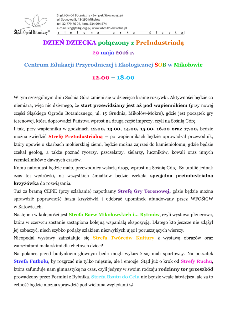 DZIEŃ DZIECKA połączony z PreIndustriadą 29 maja 2016 r. Centrum Edukacji Przyrodniczej i Ekologicznej ŚOB w Mikołowie 12.00 – 18.00 W tym szczególnym dniu Sośnia Góra zmieni się w dziecięcą krainę rozrywki. Aktywności będzie co niemiara, więc nic dziwnego, że start przewidziany jest aż pod wapiennikiem (przy nowej części Śląskiego Ogrodu Botanicznego, ul. 15 Grudnia, Mikołów-Mokre), gdzie jest początek gry terenowej, która doprowadzi Państwa wprost na drugą część imprezy, czyli na Sośnią Górę. I tak, przy wapienniku w godzinach 12.00, 13.00, 14.00, 15.00, 16.00 oraz 17.00, będzie można zwiedzić Strefę PreIndustrialną – po wapiennikach będzie oprowadzał przewodnik, który opowie o skarbach mokierskiej ziemi, będzie można zajrzeć do kamieniołomu, gdzie będzie czekał geolog, a także poznać rycerzy, pszczelarzy, zielarzy, łuczników, kowali oraz innych rzemieślników z dawnych czasów. Komu natomiast będzie mało, przewodnicy wskażą drogę wprost na Sośnią Górę. By umilić jednak czas tej wędrówki, na wszystkich śmiałków będzie czekała specjalna preindustrialna krzyżówka do rozwiązania. Tuż za bramą CEPiE (przy szlabanie) napotkamy Strefę Gry Terenowej, gdzie będzie można sprawdzić poprawność hasła krzyżówki i odebrać upominek ufundowany przez WFOŚiGW w Katowicach. Następna w kolejności jest Strefa Barw Mikołowskich i… Rytmów, czyli wystawa plenerowa, która w czerwcu zostanie zastąpiona kolejną wspaniałą ekspozycją. Dlatego kto jeszcze nie zdążył jej zobaczyć, niech szybko podąży szlakiem niezwykłych ujęć i poruszających wierszy. Nieopodal wystawy zainstaluje się Strefa Twórców Kultury z wystawą obrazów oraz warsztatami malarskimi dla chętnych dzieci! Na polance przed budynkiem głównym będą mogli wykazać się mali sportowcy. Na początek Strefa Futbolu, by rozgrzać nie tylko mięśnie, ale i emocje. Stąd już o krok od Strefy Ruchu, która zafunduje nam gimnastykę na czas, czyli jedyny w swoim rodzaju rodzinny tor przeszkód prowadzony przez Formini z Rybnika. Strefa Rzutu do Celu nie będzie wcale łatwiejsza, ale za to celność będzie można sprawdzić pod wieloma względami Po emocjonującym wysiłku fizycznym przyjdzie pora na chwilę… ćwiczenia intelektualne. Strefa Gier XXL, czyli warcaby, chińczyk czy znane kółko i krzyżyk w powiększeniu. Jeśli natomiast wolicie zabawy w większym gronie, Strefa Chust stoi otworem. Najmłodsi będą mogli oddać się zabawie w Strefie Malucha z zabawkami certyfikowanymi czy też w Strefie Barw, gdzie w ruch pójdzie kreda. Tu ograniczeniem może być jedynie wyobraźnia, nic więcej! Od 14.00 natomiast zostanie uruchomiona Strefa Miodobrania – będzie można zobaczyć jak fachowo odwirować miód, a nawet skosztować tego złocistego nektaru. Strefa Figurek to może i stały punkt, jednak jego popularność tak zaskakuje, że z pewnością nie może go zabraknąć w tak ważnym dla wszystkich Dzieci dniu A zaraz naprzeciw dla nieco starszych Strefa Quillingu – nowa technika, nowe możliwości i jeszcze więcej umiejętności. Strefa Rękodzieła otworzy swe podwoje dla wszystkich osób ceniących okazy jedyne w swoim rodzaju, oryginalne i niepowtarzalne. O godzinie 14.00 wyruszy wycieczka terenowa dla wszystkich chętnych osób, która potrwa ok. 2 godzin (start z dziedzińca). Z dziedzińca udać się również można do Sali Turkusowej, gdzie w godzinach od 15.00 do 16.00 będzie można zaliczyć Strefę Treningu Pamięci, która z pewnością zapadnie w pamięć, ponieważ Szkoła Treningu Pamięci Szatkowscy nie raz już udowodniła, jak metody pomagające zapamiętywać ułatwiają życie. Do Sali Kawiarnianej natomiast zaprasza Strefa Zgranej Rodziny, bo nic tak nie zbliża, jak wspólna zabawa przy dobrej planszówce. Tuż obok Zgranej Rodziny, w Strefie Zapachu, będzie można zrobić sobie, absolutnie od początku do końca, pachnące, kolorowe mydełko. Dla tych, którym ciągle mało, Strefa Zbijaka, czyli drugie życie śmieci, oraz Strefa Zabaw Zapomnianych (skakanie w gumę, gra w klasy, cymbergaj z czasów naszych dziadków). Czas umili również klown w Strefie Baniek z Nibylandii, który zaczaruje wszystkie dzieci. Strefę Ogrodnika mali ogrodnicy znajdą w domku edukacyjnym za studnią, by zgłębić tajniki siania, sadzenia czy pikowania. Dla ostudzenia emocji, po całym dniu szaleństwa, za budynkiem CEPiE będzie czekała Wodna Strefa, która z pewnością orzeźwi małych łobuziaków. A co dla rodziców? W Strefie Smaku przy placu zabaw można uraczyć się kawą, ciastem, lodami… BĘDZIE KOLOROWO, BĘDZIE EDUKACYJNIE, A PRZEDE WSZYSTKIM EKOLOGICZNIE!
