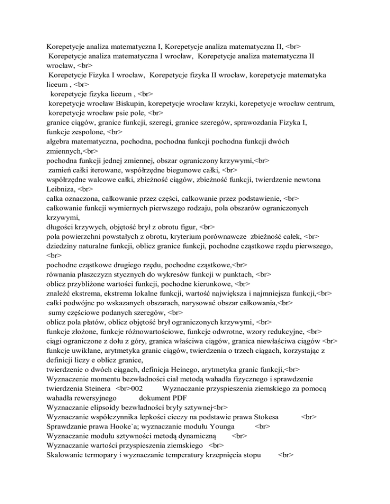 Korepetycje analiza matematyczna I, Korepetycje analiza matematyczna II, <br> Korepetycje analiza matematyczna I wrocław, Korepetycje analiza matematyczna II wrocław, <br> Korepetycje Fizyka I wrocław, Korepetycje fizyka II wrocław, korepetycje matematyka liceum , <br> korepetycje fizyka liceum , <br> korepetycje wrocław Biskupin, korepetycje wrocław krzyki, korepetycje wrocław centrum, korepetycje wrocław psie pole, <br> granice ciągów, granice funkcji, szeregi, granice szeregów, sprawozdania Fizyka I, funkcje zespolone, <br> algebra matematyczna, pochodna, pochodna funkcji pochodna funkcji dwóch zmiennych,<br> pochodna funkcji jednej zmiennej, obszar ograniczony krzywymi,<br> zamień całki iterowane, współrzędne biegunowe całki, <br> współrzędne walcowe całki, zbieżność ciągów, zbieżność funkcji, twierdzenie newtona Leibniza, <br> całka oznaczona, całkowanie przez części, całkowanie przez podstawienie, <br> całkowanie funkcji wymiernych pierwszego rodzaju, pola obszarów ograniczonych krzywymi, długości krzywych, objętość brył z obrotu figur, <br> pola powierzchni powstałych z obrotu, kryterium porównawcze zbieżność całek, <br> dziedziny naturalne funkcji, oblicz granice funkcji, pochodne cząstkowe rzędu pierwszego, <br> pochodne cząstkowe drugiego rzędu, pochodne cząstkowe,<br> równania płaszczyzn stycznych do wykresów funkcji w punktach, <br> oblicz przybliżone wartości funkcji, pochodne kierunkowe, <br> znaleźć ekstrema, ekstrema lokalne funkcji, wartość największa i najmniejsza funkcji,<br> całki podwójne po wskazanych obszarach, narysować obszar całkowania,<br> sumy częściowe podanych szeregów, <br> oblicz pola płatów, oblicz objętość brył ograniczonych krzywymi, <br> funkcje złożone, funkcje różnowartościowe, funkcje odwrotne, wzory redukcyjne, <br> ciągi ograniczone z dołu z góry, granica właściwa ciągów, granica niewłaściwa ciągów <br> funkcje uwikłane, arytmetyka granic ciągów, twierdzenia o trzech ciągach, korzystając z definicji liczy e oblicz granice, twierdzenie o dwóch ciągach, definicja Heinego, arytmetyka granic funkcji,<br> Wyznaczenie momentu bezwładności ciał metodą wahadła fizycznego i sprawdzenie twierdzenia Steinera <br>002 Wyznaczanie przyspieszenia ziemskiego za pomocą wahadła rewersyjnego dokument PDF Wyznaczanie elipsoidy bezwładności bryły sztywnej<br> Wyznaczanie współczynnika lepkości cieczy na podstawie prawa Stokesa <br> Sprawdzanie prawa Hooke`a; wyznaczanie modułu Younga <br> Wyznaczanie modułu sztywności metodą dynamiczną <br> Wyznaczanie wartości przyspieszenia ziemskiego <br> Skalowanie termopary i wyznaczanie temperatury krzepnięcia stopu <br> Pomiar ciepła właściwego ciał stałych metodą Nernsta <br> Pomiar przewodności cieplnej i elektrycznej metali <br> Pomiar przewodności cieplnej izolatorów <br> Wyznaczanie współczynnika rozszerzalności cieplnej metodą elektryczną <br> Wyznaczanie współczynnika rozszerzalności cieplnej metodą elektryczną <br> Pomiar temperatury pirometrem <br> Sprawdzanie prawa Stefana - Boltzmanna <br> Wyznaczanie stałej Stefana - Boltzmanna <br> Pomiar napięcia powierzchniowego - metoda odrywania <br> Pomiar napięcia powierzchniowego - metoda kapilary <br> Pomiar napięcia powierzchniowego - metoda stalagmometru<br> Pomiar napięcia powierzchniowego - metoda pęcherzykowa <br> Pomiar napięcia powierzchniowego - metoda Du Nouy`a <br> Badanie wahadła fizycznego <br> Pomiar rezystancji <br> Pomiar rezystancji <br> Pomiar zależności oporności metali i półprzewodników od temperatury <br> Pomiar zależności oporności metali i półprzewodników od temperatury <br> zależność przewodnictwa elektrycznego elektrolitów od temperatury; sprawdzenie reguły Waldena <br> Wyznaczanie stałej Plancka na podstawie charakterystyki diod elektroluminescencyjnych <br> Pomiary oscyloskopowe <br> Wyznaczanie ładunku właściwego elektronu <br> Prawo Ohma dla prądu przemiennego <br> Prawo Ohma dla prądu przemiennego <br> Badanie zjawiska rezonansu elektromagnetycznego <br> Pomiar indukcji magnetycznej za pomocą fluksometru <br> badanie efektu Halla <br> Badanie efektu Halla <br> wyznaczanie podstawowych parametrów ferromagnetyków <br> Wyznaczanie składowej poziomej natężenia ziemskiego pola magnetycznego <br> Badania procesów ładowania i rozładowania kondensatora <br> Sprawdzenie prawa Faradaya <br> Pomiary fotometryczne <br> analiza spektralna i pomiary spektrofotometryczne <br> Wyznaczanie stałej Rydberga i masy zredukowanej elektronu za pomocą spektroskopu <br> wyznaczanie współczynnika załamania za pomocą refraktometru <br> Wyznaczanie współczynnika załamania szkła za pomocą spektrometru <br> Wyznaczanie współczynnika załamania szkła za pomocą spektrometru <br> Pomiar odległości ogniskowych soczewek cienkich <br> Pomiar odległości ogniskowych soczewek cienkich (wersja zmodyfikowana) <br> Wyznaczanie promienia krzywizny soczewki i długości fali świetlnej za pomocą pierścieni Newtona <br> Wyznaczanie długości fali świetlnej za pomocą siatki dyfrakcyjnej <br> Pomiar naturalnej aktywności optycznej <br> Pomiar wymuszonej aktywności optycznej <br> Badanie zewnętrznego zjawiska fotoelektrycznego<br> Badanie zewnętrznego zjawiska fotoelektrycznego <br> Wyznaczanie gęstości ciał stałych i Podstawowe pomiary elektryczne.<br> Wyznaczanie stałej Plancka na podstawie prawa Plancka promieniowania ciała doskonale czarnego<br> Korepetycje analiza matematyczna I, Korepetycje analiza matematyczna II, <br> Korepetycje analiza matematyczna I wrocław, Korepetycje analiza matematyczna II wrocław, <br> Korepetycje Fizyka I wrocław, Korepetycje fizyka II wrocław, korepetycje matematyka liceum , <br> korepetycje fizyka liceum , <br> korepetycje wrocław Biskupin, korepetycje wrocław krzyki, korepetycje wrocław centrum, korepetycje wrocław psie pole, <br> granice 