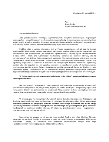 Warszawa, 14 marca 2016 r. Pani Beata Szydło Prezes Rady Ministrów RP Szanowna Pani Premier, Jako przedstawiciele dziewięciu ogólnokrajowych związków zawodowych, skupiających poszczególne – wszystkie zawody medyczne, informujemy Panią, że nasze związki porozumiały się ze sobą i ustaliły wspólne postulaty dotyczące wynagrodzeń pracowników medycznych, zatrudnionych w publicznej służbie zdrowia. Wspólnie też będziemy dążyć do ich zrealizowania. Problem płac w opiece zdrowotnej jest w Polsce nierozwiązany od lat. Jest to jeszcze spuścizna PRL, kiedy służbę zdrowia traktowano jako gorszy, bo nieprodukcyjny dział gospodarki, a jej pracowników jako osoby będące „na utrzymaniu” społeczeństwa. Sytuacji tej nie zmieniła reforma z roku 1999. Miała ona wprowadzić mechanizmy rynkowe do ochrony zdrowia, ale to „urynkowienie” jest jedynie fragmentaryczne i wybiórcze. Nie mają rynkowego charakteru ceny za refundowane świadczenia zdrowotne. Są one ustalane dowolnie przez państwowego płatnika i w ogromnej większości są zaniżone w stosunku do rzeczywistych kosztów świadczeń. Dyrektorzy szpitali, aby nie dopuścić do ich upadku, zmuszeni są redukować koszty ich funkcjonowania, przekraczając wszelkie granice. Dotyczy to zwłaszcza kosztów osobowych, bo na nie dyrektorzy mają największy wpływ. Doprowadziło to do nadmiernej redukcji personelu medycznego, stwarzając zagrożenie dla bezpieczeństwa chorych oraz do drastycznego zaniżenia wynagrodzeń pracowniczych. W Polsce publiczna ochrona zdrowia funkcjonuje tylko „dzięki” wyzyskowi ekonomicznemu swoich pracowników. Nie ma żadnych „pokojowych”, negocjacyjnych mechanizmów kształtowania wynagrodzeń pracowników medycznych. Ich pensje rosną jedynie „od strajku do strajku”. Nie godzimy się na takie rozwiązanie. Chcemy się porozumieć, nie strajkować. Nie pozwolimy jednak, aby rządzący zmuszali nas moralnym szantażem do rezygnacji z naszych uzasadnionych postulatów. W sytuacji, gdy nie ma rynkowych, wolnych cen za świadczenia zdrowotne finansowane ze środków publicznych, nie może być też mowy o rynkowym kształtowaniu płac. Wobec powyższego wyrażamy poparcie dla propozycji Ministra Zdrowia Konstantego Radziwiłła aby ustalić drogą ustawową minimalne wartości wynagrodzenia zasadniczego dla poszczególnych grup zawodów medycznych w publicznej służbie zdrowia. W załączeniu przedstawiamy nasze – uzgodnione – postulaty dotyczące tych wynagrodzeń. Rozumiejąc, że decyzje w tej sprawie musi podjąć Rząd, a nie tylko Minister Zdrowia, zwracamy się do Pani Premier o spotkanie z nami, w czasie którego przedstawimy bliżej nasze stanowisko. Liczymy, że zaowocuje ono podjęciem odpowiednich decyzji przez Rząd i przedstawieniem rządowego projektu odpowiedniej ustawy. Nie będzie dobrej służby zdrowia dla Polaków bez spokoju społecznego wśród jej pracowników. Z wyrazami szacunku, Ogólnopolski Związek Zawodowy Pracowników Diagnostyki Medycznej Przewodnicząca - Grażyna Musiałkiewicz Krajowy Związek Zawodowy Pracowników Ratownictwa Medycznego i Przewodniczący Wojciech Werbicki Ogólnopolski Związek Zawodowy Techników Medycznych Elektroradiologii Przewodniczący ZG – Cezary Staroń Ogólnopolski Związek Zawodowy Techników Medycznych Radioterapii Przewodniczący Zarządu Krajowego - Jacek Zingler Krajowy Związek Zawodowy Pracowników Medycznych Laboratoriów Diagnostycznych Przewodnicząca - Iwona Kozłowska Ogólnopolski Związek Zawodowy Pracowników Fizjoterapii Przewodniczący: Tomasz Dybek Ogólnopolski Związek Zawodowy Fizjoterapia, Przewodniczący - Marek Rajkiewicz Ogólnopolski Związek Zawodowy Pielęgniarek i Położnych Przewodnicząca ZK OZZPiP - Lucyna Dargiewicz Ogólnopolski Związek Zawodowy Lekarzy Przewodniczący Zarządu Krajowego – Krzysztof Bukiel Fizjoterapii