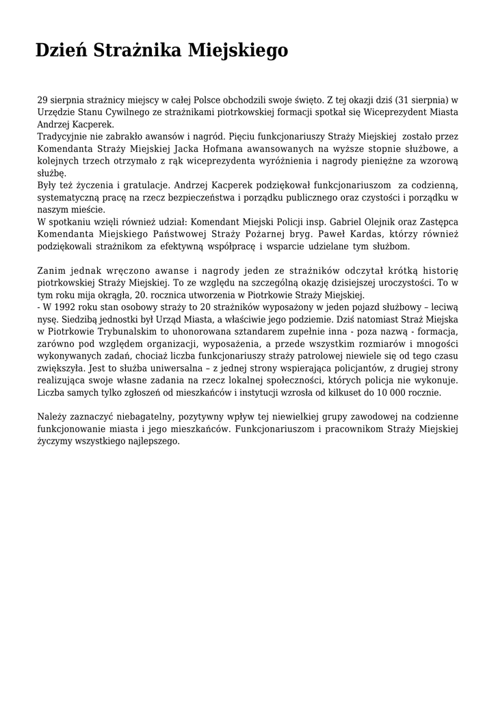 Dzień Strażnika Miejskiego 29 sierpnia strażnicy miejscy w całej Polsce obchodzili swoje święto. Z tej okazji dziś (31 sierpnia) w Urzędzie Stanu Cywilnego ze strażnikami piotrkowskiej formacji spotkał się Wiceprezydent Miasta Andrzej Kacperek. Tradycyjnie nie zabrakło awansów i nagród. Pięciu funkcjonariuszy Straży Miejskiej zostało przez Komendanta Straży Miejskiej Jacka Hofmana awansowanych na wyższe stopnie służbowe, a kolejnych trzech otrzymało z rąk wiceprezydenta wyróżnienia i nagrody pieniężne za wzorową służbę. Były też życzenia i gratulacje. Andrzej Kacperek podziękował funkcjonariuszom za codzienną, systematyczną pracę na rzecz bezpieczeństwa i porządku publicznego oraz czystości i porządku w naszym mieście. W spotkaniu wzięli również udział: Komendant Miejski Policji insp. Gabriel Olejnik oraz Zastępca Komendanta Miejskiego Państwowej Straży Pożarnej bryg. Paweł Kardas, którzy również podziękowali strażnikom za efektywną współpracę i wsparcie udzielane tym służbom. Zanim jednak wręczono awanse i nagrody jeden ze strażników odczytał krótką historię piotrkowskiej Straży Miejskiej. To ze względu na szczególną okazję dzisiejszej uroczystości. To w tym roku mija okrągła, 20. rocznica utworzenia w Piotrkowie Straży Miejskiej. - W 1992 roku stan osobowy straży to 20 strażników wyposażony w jeden pojazd służbowy – leciwą nysę. Siedzibą jednostki był Urząd Miasta, a właściwie jego podziemie. Dziś natomiast Straż Miejska w Piotrkowie Trybunalskim to uhonorowana sztandarem zupełnie inna - poza nazwą - formacja, zarówno pod względem organizacji, wyposażenia, a przede wszystkim rozmiarów i mnogości wykonywanych zadań, chociaż liczba funkcjonariuszy straży patrolowej niewiele się od tego czasu zwiększyła. Jest to służba uniwersalna – z jednej strony wspierająca policjantów, z drugiej strony realizująca swoje własne zadania na rzecz lokalnej społeczności, których policja nie wykonuje. Liczba samych tylko zgłoszeń od mieszkańców i instytucji wzrosła od kilkuset do 10 000 rocznie. Należy zaznaczyć niebagatelny, pozytywny wpływ tej niewielkiej grupy zawodowej na codzienne funkcjonowanie miasta i jego mieszkańców. Funkcjonariuszom i pracownikom Straży Miejskiej życzymy wszystkiego najlepszego.
