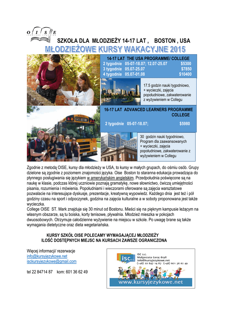 SZKOŁA DLA MŁODZIEŻY 14-17 LAT , BOSTON , USA 14-17 LAT THE USA PROGRAMME/ COLLEGE 2 tygodnie 05-07-18.07; 12.07-25.07 $5300 3 tygodnie 05.07-25.07 $7850 4 tygodnie 05.07-01.08 $10400 17.5 godzin nauki tygodniowo, + wycieczki, zajęcia popołudniowe, zakwaterowanie z wyżywieniem w Collegu 16-17 LAT ADVANCED LEARNERS PROGRAMME COLLEGE 2 tygodnie 05-07-18.07; $5980 30 godzin nauki tygodniowo, Program dla zaawansowanych + wycieczki, zajęcia popołudniowe, zakwaterowanie z wyżywieniem w Collegu Zgodnie z metodą OISE, kursy dla młodzieży w USA, to kursy w małych grupach, do ośmiu osób. Grupy dzielone są zgodnie z poziomem znajomości języka. Oise Boston to staranna edukacja prowadząca do płynnego posługiwania się językiem w amerykańskim angielskim. Przedpołudnia poświęcone są na naukę w klasie, podczas której uczniowie poznają gramatykę, nowe słownictwo, ćwiczą umiejętności pisania, rozumienia i mówienia. Popołudniami i wieczorami oferowane są zajęcia warsztatowe pozwalacie na interesujące dyskusje, prezentacje, kreatywną wypowiedz. Każdego dnia jest też i pół godziny czasu na sport i odpoczynek, godzina na zajęcia kulturalne a w soboty proponowana jest także wycieczka. College OISE ST. Mark znajduje się 30 minut od Bostonu. Mieści się na pięknym kampusie leżącym na własnym obszarze, są tu boiska, korty tenisowe, pływalnia. Młodzież mieszka w pokojach dwuosobowych. Otrzymuje całodzienne wyżywienie na miejscu w szkole. Po uwagę brane są także wymagania dietetyczne oraz dieta wegetariańska. KURSY SZKÓŁ OISE POLECAMY WYMAGAJĄCEJ MŁODZIEŻY ILOŚĆ DOSTĘPNYCH MIEJSC NA KURSACH ZAWSZE OGRANICZONA Więcej informacji/ rezerwacje [email protected] [email protected] tel 22 84714 87 kom: 601 36 62 49