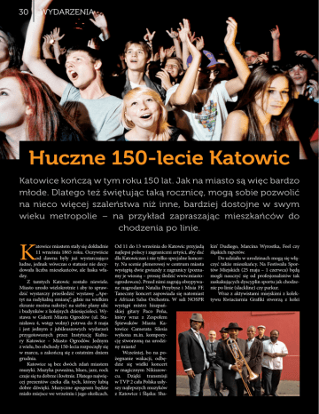 30 WYDARZENIA Huczne 150-lecie Katowic Katowice kończą w tym roku 150 lat. Jak na miasto są więc bardzo młode. Dlatego też świętując taką rocznicę, mogą sobie pozwolić na nieco więcej szaleństwa niż inne, bardziej dostojne w swym wieku metropolie – na przykład zapraszając mieszkańców do chodzenia po linie. K atowice miastem stały się dokładnie 11 września 1865 roku. Oczywiście od dawna były już wystarczająco ludne, jednak wówczas o statusie nie decydowała liczba mieszkańców, ale łaska władzy. Z tamtych Katowic zostało niewiele. Miasto urosło wielokrotnie i aby to sprawdzić wystarczy prześledzić wystawę „Apetyt na radykalną zmianę”, gdzie na wielkim ekranie można nałożyć na siebie plany ulic i budynków z kolejnych dziesięcioleci. Wystawa w Galerii Miasta Ogrodów (ul. Stanisława 4, wstęp wolny) potrwa do 8 maja i jest jednym z jubileuszowych wydarzeń przygotowanych przez Instytucję Kultury Katowice – Miasto Ogrodów. Jednym z wielu, bo obchody 150-lecia rozpoczęły się w marcu, a zakończą się z ostatnim dniem grudnia. Katowice są bez dwóch zdań miastem muzyki. Muzyka poważna, blues, jazz, rock czuje się tu dobrze i kwitnie. Dlatego najwięcej prezentów czeka dla tych, którzy lubią dobre dźwięki. Muzyczne apogeum będzie miało miejsce we wrześniu i jego okolicach. Od 11 do 13 września do Katowic przyjadą najlepsi polscy i zagraniczni artyści, aby dać dla Katowiczan i nie tylko specjalne koncerty. Na scenie plenerowej w centrum miasta wystąpią dwie gwiazdy z zagranicy (poznamy je wiosną – proszę śledzić www.miastoogrodow.eu). Przed nimi zagrają obsypywane nagrodami Natalia Przybysz i Misia FF. Taneczny koncert zapowiada się natomiast z African Salsa Orchestra. W sali NOSPR wystąpi mistrz hiszpańskiej gitary Paco Peña, który wraz z Zespołem Śpiewaków Miasta Katowice Camerata Silesia wykona m.in. kompozycję stworzoną na urodziny miasta! Wcześniej, bo na pożegnanie wakacji, odbędzie się wielki koncert w magicznym Nikiszowcu. Dzięki transmisji w TVP 2 cała Polska usłyszy najlepszych muzyków z Katowice i Śląska: Sha- kin’ Dudiego, Marcina Wyrostka, Feel czy śląskich raperów. Do udziału w urodzinach mogą się włączyć także mieszkańcy. Na Festiwalu Sportów Miejskich (25 maja – 1 czerwca) będą mogli nauczyć się od profesjonalistów tak zaskakujących dyscyplin sportu jak chodzenie po linie (slackline) czy parkur. Wraz z aktywistami miejskimi z kolektywu Kwiaciarnia Grafiki stworzą z kolei WYDARZENIA trzy szklarnie z domowymi kwiatami, które ozdobią ich podwórka. Jak zawsze jeden zaniedbany plac w Katowicach zmieni się nie do poznania dzięki akcji Plac na Glanc. O jubileuszu będą przypominały także słoneczniki, których sadzonki trafią do wszystkich dzielnic miasta za sprawą akcji Słonecznik Patrol. Zgodnie z pięcioletnią już tradycją pejzaż miasta wzbogaci się o nowe murale podczas Katowice Street Art Festival (od 15 maja). Dołączą do znanej na całym świecie „Kury” Aryza z ul. Mariackiej Tylnej czy „Przełącznika” Escifa z ul. Mikusińskiego. Swoją cegiełkę dołożą artyści ze stolicy współczesnej sztuki – Berlina. W Galerii BWA, Rondzie Sztuki i na ulicach Katowic do czerwca można podziwiać ich sztukę na wystawie „Berlin Artists’ Statements”. Dużo? A to zaledwie procent atrakcji. Bo przecież jest jeszcze Katowice JazzArt Festival (od 21 kwietnia; na inauguracji Stacey Kent), pokaz filmu „Grufołak” z muzyką na żywo na Dzień Dziecka, Inwazja Sztukmistrzów (uwaga na magię w lipcu!) i Festiwal Muzyki Świata Ogrody Dźwięków…. Wszyscy są zaproszeni! Cały program na: www.miasto-ogrodow.eu www.katowice.eu Instytucja Kultury Katowice – Miasto Ogrodów Główny organizator obchodów 150-lecia Katowic. Instytucja miejska, która jako Biuro ESK walczyło o tytuł Europejskiej Stolicy Kultury dla Katowic. Do tytułu niewiele brakowało (Katowice i Lublin były uznawane za „czarne konie”), dlatego program Miasta Ogrodów jest realizowany nadal. Tworzą go festiwale (muzyczne, sztuki ulicy, filmowe), programy edukacyjne z zakresu kultury i działalności kreatywnej i pojedyncze wydarzenia kulturalne, zawsze na najwyższym poziomie. Katowice JazzArt Festival, Street Art Festival, Ars Inependent Festival czy Urodziny Miasta Kocham Katowice to najmocniejsze „marki” Instytucji. 31
