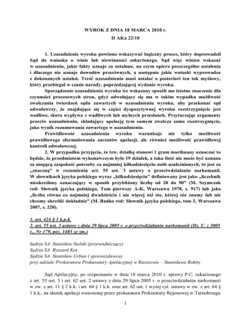 WYROK Z DNIA 18 MARCA 2010 r. II AKa 22/10 1. Uzasadnienie wyroku powinno wskazywać logiczny proces, który doprowadził Sąd do wniosku o winie lub niewinności oskarżonego. Sąd więc winien wskazać w uzasadnieniu, jakie fakty uznaje za ustalone, na czym opiera poszczególne ustalenia i dlaczego nie uznaje dowodów przeciwnych, a następnie jakie wnioski wyprowadza z dokonanych ustaleń. Treść uzasadnienia musi ustalać a posteriori ten tok myślowy, który przebiegał w czasie narady, poprzedzającej wydanie wyroku. Sporządzenie uzasadnienia wyroku we wskazany sposób ma istotne znaczenie dla czynności procesowych stron, gdyż odwołujący się ma w takim wypadku możliwość zwalczania twierdzeń sądu zawartych w uzasadnieniu wyroku, aby przekonać sąd odwoławczy, że znajdujące się w części dyspozytywnej wyroku rozstrzygnięcie jest wadliwe, skoro wypływa z wadliwych lub mylnych przesłanek. Przytaczając argumenty przeciw uzasadnieniu, składający apelację tym samym zwalcza samo rozstrzygnięcie, jako wynik rozumowania zawartego w uzasadnieniu. Prawidłowość uzasadnienia wyroku warunkuje nie tylko możliwość prawidłowego sformułowania zarzutów apelacji, ale również możliwość prawidłowej kontroli odwoławczej. 2. W przypadku przyjęcia, że tzw. działkę stanowi 1 gram marihuany oznaczać to będzie, że przedmiotem wykonawczym było 19 działek, a taka ilość nie może być uznana za mogącą zaspokoić potrzeby co najmniej kilkudziesięciu osób uzależnionych, to jest za „znaczną” w rozumieniu art. 55 ust. 3 ustawy o przeciwdziałaniu narkomanii. W słownikach języka polskiego wyraz „kilkudziesięciu” definiowany jest jako „liczebnik nieokreślony oznaczający w sposób przybliżony liczbę od 20 do 90” (M. Szymczak red: Słownik języka polskiego, Tom pierwszy A-K, Warszawa 1978, s. 917) lub jako „liczba równa co najmniej dwadzieścia i nie więcej niż sto, której nie znamy lub nie chcemy określić dokładnie” (M. Bańko red: Słownik języka polskiego, tom 2, Warszawa 2007, s. 228). 1. art. 424 § 1 k.p.k. 2. art. 55 ust. 3 ustawy z dnia 29 lipca 2005 r. o przeciwdziałaniu narkomanii (Dz. U. z 2005 r., Nr 179, poz. 1485 ze zm.) Sędzia SA Stanisław Sielski (przewodniczący) Sędzia SA Ryszard Kot Sędzia SA Stanisław Urban ( sprawozdawca) przy udziale Prokuratora Prokuratury Apelacyjnej w Rzeszowie – Stanisława Rokity Sąd Apelacyjny, po rozpoznaniu w dniu 18 marca 2010 r. sprawy P.C. oskarżonego z art. 55 ust. 3 i art. 62 ust. 2 ustawy z dnia 29 lipca 2005 r. o przeciwdziałaniu narkomanii w zw. z art. 11 § 2 k.k. i art. 64 § 1 k.k. oraz art. 62 ust. 1 wyżej cyt. ustawy w zw. z art. 64 § 1 k.k., na skutek apelacji wniesionej przez prokuratora Prokuratury Rejonowej w Tarnobrzegu 1 od wyroku Sądu Okręgowego w Tarnobrzegu z dnia 15 grudnia 2009 r., sygn. akt II K ....., u c h y l i ł zaskarżony wyrok i sprawę przekazał Sądowi Okręgowemu w Tarnobrzegu do ponownego rozpoznania. U za sa dnienie P. C. został oskarżony o to, że: I. II. w okresie od dnia 3 października 2009 r. do dnia 4 października 2009 r., wbrew przepisom ustawy, dokonał przewozu na terytorium Rzeczypospolitej Polskiej znacznej ilości środków odurzających, w tym w postaci marihuany w ilości 19,10 grama, co stanowi około 95 jednorazowych porcji, i 1,02 grama haszyszu, co stanowi około 5 jednorazowych porcji, w ten sposób, że przywiózł ją z Holandii. do T. woj. p., przy czym zarzucanego mu czynu dopuścił się w ciągu 5 lat po odbyciu co najmniej 6 miesięcy kary pozbawienia wolności za umyślne przestępstwo podobne, orzeczonej wyrokiem Sądu Okręgowego w T., sygn. akt II K......., w wymiarze 3 lat, którą odbywał w dniach 16.04.2002 r. do 22.09.2003 r. oraz od 22.03.2005 r. do dnia 20.10.2005 r., tj. o przestępstwo z art. 55 ust. 3 ustawy z dnia 29 lipca 2005 roku o przeciwdziałaniu narkomanii i art. 62 ust. 2 ustawy z dnia 29 lipca 2005 roku o przeciwdziałaniu narkomanii w zw. z art. 11 § 1 k.k. w zw. z art. 64 § 1 k.k. w nieustalonym okresie do dnia 15 lipca 2009 roku w T. woj. p., wbrew przepisom ustawy posiadał środek odurzający w postaci ziela konopi innych niż włókniste o zawartości – 9 – terahydrokannabinolu o stężeniu powyżej 2% o masie netto 0,48 grama, co stanowi około 2,5 jednorazowych porcji oraz środek odurzający metadonu w ilości 100 ml, przy czym zarzucanego mu czynu dopuścił się w ciągu 5 lat po odbyciu co najmniej 6 miesięcy kary pozbawienia wolności za umyślne przestępstwo podobne, orzeczonej wyrokiem Sądu Okręgowego w T. sygnatura akt II K ......., w wymiarze 3 lat, którą odbywał w dniach 16.04.2002 r. do 22.09.2003 r. oraz od 22.03.2005 r. do dnia 20.10.2005 r., tj. o przestępstwo z art. 62 ust. 1 ustawy z dnia 29 lipca 2005 roku o przeciwdziałaniu narkomanii w zw. z art. 64 § 1 k.k. Sąd Okręgowy w T. wyrokiem z dnia 15 grudnia 2009 r.: I. uznał P.C. winnym tego, że w okresie od dnia 3 października 2009 r. do dnia 4 października 2009 r., wbrew przepisom ustawy dokonał przewozu na terytorium Rzeczypospolitej Polskiej środków odurzających w ilości 19,10 grama, co stanowi około 95 jednorazowych porcji, i 1,02 grama haszyszu, co stanowi około 5 jednorazowych porcji, w ten sposób, że przywiózł ją z Holandii. do T., woj. p., przy czym zarzucanego mu czynu dopuścił się w ciągu 5 lat po odbyciu co najmniej 2 II. III. IV. V. VI. VII. 6 miesięcy kary pozbawienia wolności za umyślne przestępstwo podobne, orzeczonej wyrokiem Sądu Okręgowego w T., sygnatura akt II K ......, w wymiarze 3 lat, którą odbywał w dniach 16.04.2002 r. do 22.09.2003 r. oraz od 22.03.2005 r. do dnia 20.10.2005r., tj. o przestępstwo z art. 55 ust. 1 ustawy z dnia 29 lipca 2005 roku o przeciwdziałaniu narkomanii i art. 62 ust. 1 Ustawy z dnia 29 lipca 2005 roku o przeciwdziałaniu narkomanii w zw. z art. 11 § 2 k.k. w zw. z art. 64 § 1 k.k. i na podstawie art. 55 ust. 1