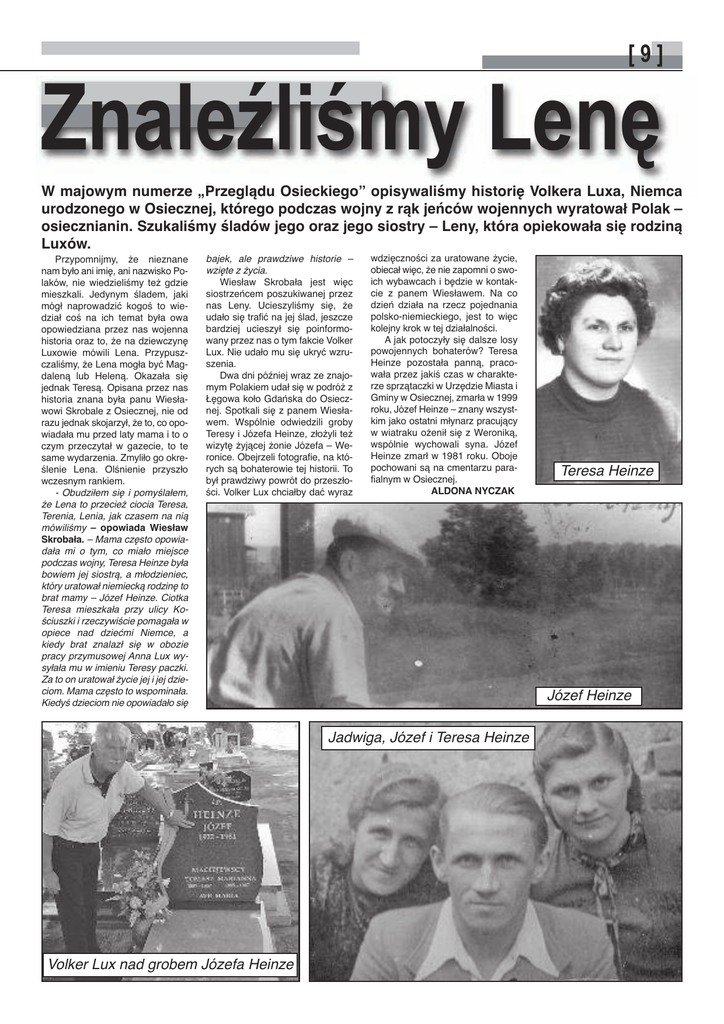 Znaleźliśmy Lenę [9] W majowym numerze „Przeglądu Osieckiego” opisywaliśmy historię Volkera Luxa, Niemca urodzonego w Osiecznej, którego podczas wojny z rąk jeńców wojennych wyratował Polak – osiecznianin. Szukaliśmy śladów jego oraz jego siostry – Leny, która opiekowała się rodziną Luxów. Przypomnijmy, że nieznane nam było ani imię, ani nazwisko Polaków, nie wiedzieliśmy też gdzie mieszkali. Jedynym śladem, jaki mógł naprowadzić kogoś to wiedział coś na ich temat była owa opowiedziana przez nas wojenna historia oraz to, że na dziewczynę Luxowie mówili Lena. Przypuszczaliśmy, że Lena mogła być Magdaleną lub Heleną. Okazała się jednak Teresą. Opisana przez nas historia znana była panu Wiesławowi Skrobale z Osiecznej, nie od razu jednak skojarzył, że to, co opowiadała mu przed laty mama i to o czym przeczytał w gazecie, to te same wydarzenia. Zmyliło go określenie Lena. Olśnienie przyszło wczesnym rankiem. - Obudziłem się i pomyślałem, że Lena to przecież ciocia Teresa, Terenia, Lenia, jak czasem na nią mówiliśmy – opowiada Wiesław Skrobała. – Mama często opowiadała mi o tym, co miało miejsce podczas wojny, Teresa Heinze była bowiem jej siostrą, a młodzieniec, który uratował niemiecką rodzinę to brat mamy – Józef Heinze. Ciotka Teresa mieszkała przy ulicy Kościuszki i rzeczywiście pomagała w opiece nad dziećmi Niemce, a kiedy brat znalazł się w obozie pracy przymusowej Anna Lux wysyłała mu w imieniu Teresy paczki. Za to on uratował życie jej i jej dzieciom. Mama często to wspominała. Kiedyś dzieciom nie opowiadało się bajek, ale prawdziwe historie – wzięte z życia. Wiesław Skrobała jest więc siostrzeńcem poszukiwanej przez nas Leny. Ucieszyliśmy się, że udało się trafić na jej ślad, jeszcze bardziej ucieszył się poinformowany przez nas o tym fakcie Volker Lux. Nie udało mu się ukryć wzruszenia. Dwa dni później wraz ze znajomym Polakiem udał się w podróż z Łęgowa koło Gdańska do Osiecznej. Spotkali się z panem Wiesławem. Wspólnie odwiedzili groby Teresy i Józefa Heinze, złożyli też wizytę żyjącej żonie Józefa – Weronice. Obejrzeli fotografie, na których są bohaterowie tej historii. To był prawdziwy powrót do przeszłości. Volker Lux chciałby dać wyraz wdzięczności za uratowane życie, obiecał więc, że nie zapomni o swoich wybawcach i będzie w kontakcie z panem Wiesławem. Na co dzień działa na rzecz pojednania polsko-niemieckiego, jest to więc kolejny krok w tej działalności. A jak potoczyły się dalsze losy powojennych bohaterów? Teresa Heinze pozostała panną, pracowała przez jakiś czas w charakterze sprzątaczki w Urzędzie Miasta i Gminy w Osiecznej, zmarła w 1999 roku, Józef Heinze – znany wszystkim jako ostatni młynarz pracujący w wiatraku ożenił się z Weroniką, wspólnie wychowali syna. Józef Heinze zmarł w 1981 roku. Oboje pochowani są na cmentarzu parafialnym w Osiecznej. ALDONA NYCZAK Józef Heinze Jadwiga, Józef i Teresa Heinze Volker Lux nad grobem Józefa Heinze Teresa Heinze