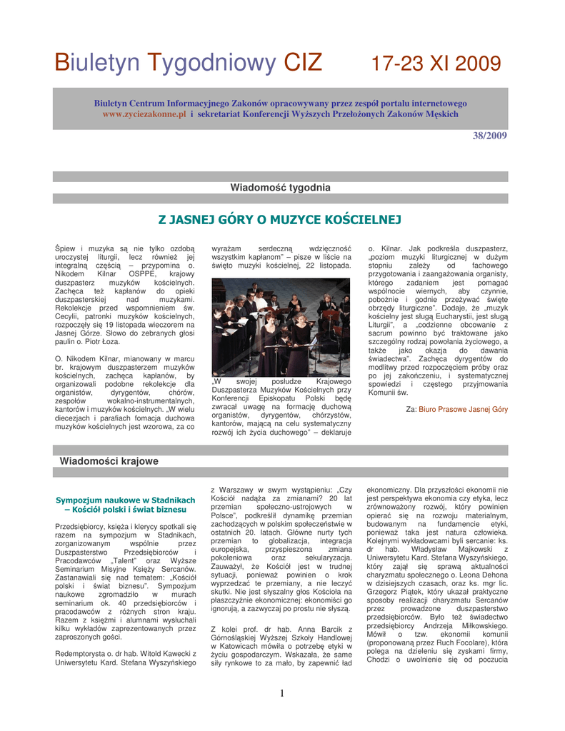 Biuletyn Tygodniowy CIZ 17-23 XI 2009 Biuletyn Centrum Informacyjnego Zakonów opracowywany przez zespół portalu internetowego www.zyciezakonne.pl i sekretariat Konferencji Wyższych Przełożonych Zakonów Męskich 38/2009 Wiadomość tygodnia Z JASNEJ GÓRY O MUZYCE KOŚCIELNEJ Śpiew i muzyka są nie tylko ozdobą uroczystej liturgii, lecz również jej integralną częścią – przypomina o. Nikodem Kilnar OSPPE, krajowy duszpasterz muzyków kościelnych. Zachęca też kapłanów do opieki duszpasterskiej nad muzykami. Rekolekcje przed wspomnieniem św. Cecylii, patronki muzyków kościelnych, rozpoczęły się 19 listopada wieczorem na Jasnej Górze. Słowo do zebranych głosi paulin o. Piotr Łoza. O. Nikodem Kilnar, mianowany w marcu br. krajowym duszpasterzem muzyków kościelnych, zachęca kapłanów, by organizowali podobne rekolekcje dla organistów, dyrygentów, chórów, zespołów wokalno-instrumentalnych, kantorów i muzyków kościelnych. „W wielu diecezjach i parafiach fomacja duchowa muzyków kościelnych jest wzorowa, za co wyrażam serdeczną wdzięczność wszystkim kapłanom” – pisze w liście na święto muzyki kościelnej, 22 listopada. „W swojej posłudze Krajowego Duszpasterza Muzyków Kościelnych przy Konferencji Episkopatu Polski będę zwracał uwagę na formację duchową organistów, dyrygentów, chórzystów, kantorów, mającą na celu systematyczny rozwój ich życia duchowego” – deklaruje o. Kilnar. Jak podkreśla duszpasterz, „poziom muzyki liturgicznej w dużym stopniu zależy od fachowego przygotowania i zaangażowania organisty, którego zadaniem jest pomagać wspólnocie wiernych, aby czynnie, pobożnie i godnie przeżywać święte obrzędy liturgiczne”. Dodaje, że „muzyk kościelny jest sługą Eucharystii, jest sługą Liturgii”, a „codzienne obcowanie z sacrum powinno być traktowane jako szczególny rodzaj powołania życiowego, a także jako okazja do dawania świadectwa”. Zachęca dyrygentów do modlitwy przed rozpoczęciem próby oraz po jej zakończeniu, i systematycznej spowiedzi i częstego przyjmowania Komunii św. Za: Biuro Prasowe Jasnej Góry Wiadomości krajowe Sympozjum naukowe w Stadnikach – Kościół polski i świat biznesu Przedsiębiorcy, księża i klerycy spotkali się razem na sympozjum w Stadnikach, zorganizowanym wspólnie przez Duszpasterstwo Przedsiębiorców i Pracodawców „Talent” oraz Wyższe Seminarium Misyjne Księży Sercanów. Zastanawiali się nad tematem: „Kościół polski i świat biznesu”. Sympozjum naukowe zgromadziło w murach seminarium ok. 40 przedsiębiorców i pracodawców z różnych stron kraju. Razem z księżmi i alumnami wysłuchali kilku wykładów zaprezentowanych przez zaproszonych gości. Redemptorysta o. dr hab. Witold Kawecki z Uniwersytetu Kard. Stefana Wyszyńskiego z Warszawy w swym wystąpieniu: „Czy Kościół nadąża za zmianami? 20 lat przemian społeczno-ustrojowych w Polsce”, podkreślił dynamikę przemian zachodzących w polskim społeczeństwie w ostatnich 20. latach. Główne nurty tych przemian to globalizacja, integracja europejska, przyspieszona zmiana pokoleniowa oraz sekularyzacja. Zauważył, że Kościół jest w trudnej sytuacji, ponieważ powinien o krok wyprzedzać te przemiany, a nie leczyć skutki. Nie jest słyszalny głos Kościoła na płaszczyźnie ekonomicznej: ekonomiści go ignorują, a zazwyczaj po prostu nie słyszą. Z kolei prof. dr hab. Anna Barcik z Górnośląskiej Wyższej Szkoły Handlowej w Katowicach mówiła o potrzebę etyki w życiu gospodarczym. Wskazała, że same siły rynkowe to za mało, by zapewnić ład 1 ekonomiczny. Dla przyszłości ekonomii nie jest perspektywa ekonomia czy etyka, lecz zrównoważony rozwój, który powinien opierać się na rozwoju materialnym, budowanym na fundamencie etyki, ponieważ taka jest natura człowieka. Kolejnymi wykładowcami byli sercanie: ks. dr hab. Władysław Majkowski z Uniwersytetu Kard. Stefana Wyszyńskiego, który zajął się sprawą aktualności charyzmatu społecznego o. Leona Dehona w dzisiejszych czasach, oraz ks. mgr lic. Grzegorz Piątek, który ukazał praktyczne sposoby realizacji charyzmatu Sercanów przez prowadzone duszpasterstwo przedsiębiorców. Było też świadectwo przedsiębiorcy Andrzeja Miłkowskiego. Mówił o tzw. ekonomii komunii (proponowaną przez Ruch Focolare), która polega na dzieleniu się zyskami firmy, Chodzi o uwolnienie się od poczucia własności i świadomości, że firma ma większego „Szefa”. W części popołudniowej organizatorzy zaproponowali szereg dyskusji w małych grupach: na ambonie o łapówkach i w katechezie, przedsiębiorca w Kościele – dostrzec bogactwo człowieka, animacja społeczna, społeczna odpowiedzialność – obowiązek każdego chrześcijanina. Podsumowaniem była dyskusja panelowa z udziałem prelegentów. Sympozjum zakończyło się prezentacją filmu Krzysztofa Jana Kubiaka pt.: „Żeby przed nazwiskiem było człowiek”. Obraz ukazuje bogactwo życia i osobowości kobiety-przedsiębiorcy ze Śląska, Małgorzaty Matei. Przedsiębiorcy i duchowni spotkali się także kaplicy seminaryjnej na Mszy św. pod przewodnictwem prowincjała ks. Tadeusza Michałka SCJ, który w homilii zwrócił uwagę na mocne fundamenty, na jakich trzeba budować doczesną działalność. Trudno jest być dobrym przedsiębiorcą, jeśli nie dba się o głęboką relację z Chrystusem – dodał Prowincjał Polskich Za: www.sercanie.pl Sercanów Paulini rozmawali o rozwoju Zakonu poza Polską Spotkanie prowincjałów i quasiprowincjałów Zakonu Paulinów odbyło się 16 listopada na Jasnej Górze. Do sanktuarium przybyło trzech ojców prowincjałów: prowincji niemieckiej, australijskiej i amerykańskiej; dwóch quasiprowincjałów: prowincji węgierskiej i chorwackiej oraz delegat generała Zakonu na Słowacji. Sesja poświęcona życiu i działalności paulinów w poszczególnych prowincjach trwała 
