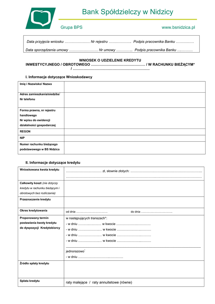 Bank Spółdzielczy w Nidzicy Grupa BPS www.bsnidzica.pl Data przyjęcia wniosku ………………… Nr rejestru ………………. Podpis pracownika Banku …………… Data sporządzenia umowy …………………… Nr umowy ………….. Podpis pracownika Banku ….……… WNIOSEK O UDZIELENIE KREDYTU INWESTYCYJNEGO / OBROTOWEGO ……………………………………… / W RACHUNKU BIEŻĄCYM* / ………………………………………………………. I. Informacje dotyczące Wnioskodawcy Imię i Nazwisko/ Nazwa Adres zamieszkania/siedziba* Nr telefonu Forma prawna, nr rejestru handlowego Nr wpisu do ewidencji działalności gospodarczej REGON NIP Numer rachunku bieżącego podstawowego w BS Nidzica II. Informacje dotyczące kredytu Wnioskowana kwota kredytu …………………………… zł, słownie złotych: ………………………………….……………………... ………………………………………………………………………..….………………………………… Całkowity koszt (nie dotyczy kredytu w rachunku bieżącym i obrotowych bez rozliczania) Przeznaczenie kredytu Okres kredytowania od dnia ………………….……….. Proponowany termin w następujących transzach*: postawienia kwoty kredytu - w dniu ………..….….… w kwocie ………………..………… do dyspozycji Kredytobiorcy - w dniu ……………….… w kwocie …………………..……… do dnia …………………………... - w dniu ……………….… w kwocie …………………..……… - w dniu ……………….… w kwocie …………………..……… ____________________________________________________________________________________ jednorazowo* - w dniu ………………………..…………. Źródło spłaty kredytu Spłata kredytu raty malejące / raty annuitetowe (równe) Proponowany termin spłaty wykorzystanego kredytu kapitału ……………………………… miesięcznie, kwartalnie, półrocznie, rocznie* odsetek ……………………………… miesięcznie, kwartalnie, półrocznie, rocznie* Proponowane zabezpieczenie spłaty kredytu III. Oświadczenia: posiadam/ nie posiadam* - bank ……………………………………………………………………………………………….. rachunek bankowy w - nr ……………………………………………………………………….……………………..…… innym banku - bank …………………………………………………………………...………………………….. - nr ………………………………………….………………………….…………….……………… korzystam/ nie korzystam* z kredytu, gwarancji itp. w innym banku - w kwocie zł ………………………. z tytułu …………………...………...…………………….. w …………………………………………………………………….……………………...……... - w kwocie zł ………………………. z tytułu ………………….….…………………………….. w …………………………………………………………………………….…………………….. ubiegam się/ nie ubiegam się* o kredyt, gwarancję itp. w innym banku w okresie 1 roku przed złożeniem wniosku jestem/ nie jestem* zobowiązany z tytułu poręczenia, gwarancji - w kwocie zł ………………………. z tytułu ……………………...…………………………….. w ………………………………………………………………..………………………………….. - w kwocie zł ………………………. z tytułu …………….………….………………………….. w ………………………………………………………………….………….…………………...... - w kwocie zł ……………………. z tytułu …………….…………….………………………….. w …………………………………………………………………………………..……...………... - w kwocie zł ………………………. z tytułu …………….……….…………………………….. w ………………………………………………………………………………….…………...…... posiadam/ nie posiadam* inne wymagalne zobowiązania jestem/śmy / nie jestem/śmy* - w kwocie zł ………………….………. z tytułu …………….………………………………….. w …………………………...………………………………………………..……………………... członkiem Banku Spółdzielczego w Nidzicy Oddział w ……………………………… podmioty powiązane ze mną/ z nami kapitałowo/ majątkowo/ organizacyjnie/ personalnie łączą/ nie łączą* mnie/nas powiązania kapitałowe lub organizacyjne z członkami Banku Spółdzielczego w Nidzicy, osobami zajmującymi kierownicze stanowiska w tym Banku (imię i nazwisko, adres zamieszkania i stanowisko osób powiązanych z Wnioskodawcą oraz charakter lub pełniącymi funkcje w Radzie powiązań ze wskazaniem funkcji pełnionej we władzach Banku przez osoby powiązane z Nadzorczej Banku bądź Zarządzie Wnioskodawcą) Banku Prawdziwość powyższych informacji potwierdzam własnoręcznym podpisem pod rygorem odpowiedzialności karnej przewidzianej w Art. 297 § 1 Ustawy z dnia 6 czerwca 1997 r. – Kodeks Karny (Dz. U. z 1997 r. Nr 88, poz. 553 ze zm.) ……………………………………… (podpis wnioskodawcy/ów) OŚWIADCZENIA 1. Przyjmuję do wiadomości informację Banku Spółdzielczego w Nidzicy, że: 1) Bank Spółdzielczy w Nidzicy z siedzibą w Nidzicy przy ul. Mickiewicza 3 będzie administratorem moich danych osobowych w rozumieniu ustawy z dnia 29 sierpnia 1997 r. o ochronie danych osobowych (Dz. U. z 2016 r. poz. 922 z późn. zm.); 2) dane te przet